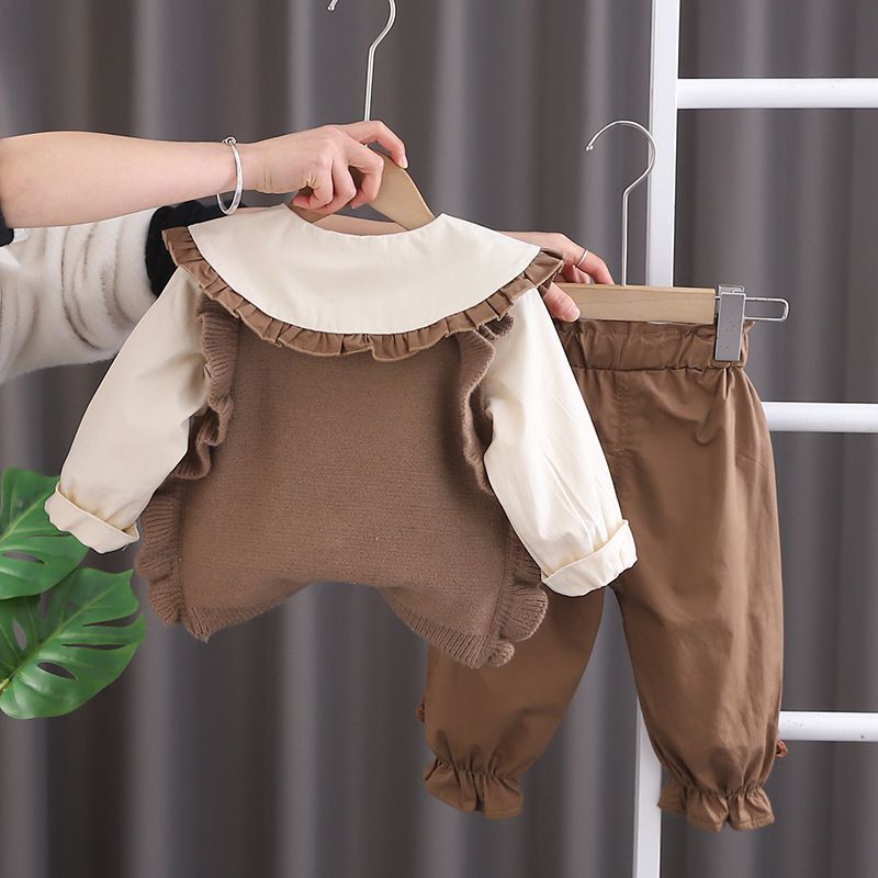 가을 서양식 소녀 세트 2025 새로운 봄과 가을 한국 스웨터 조끼 셔츠 아기 공주 스타일 3 피스 세트