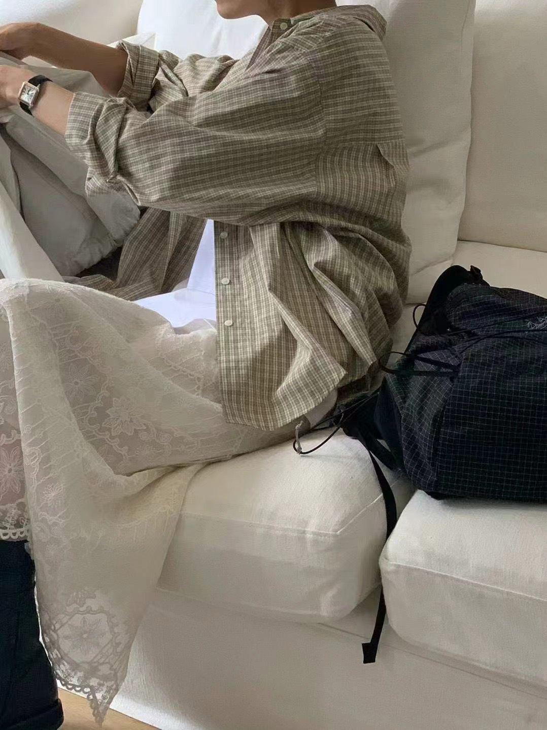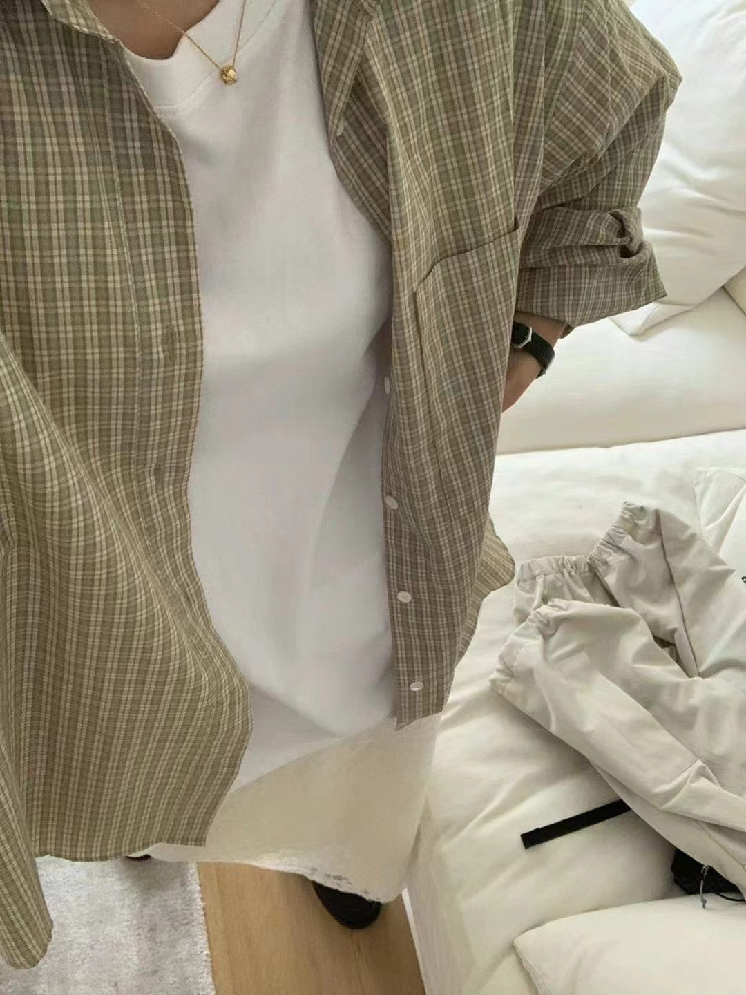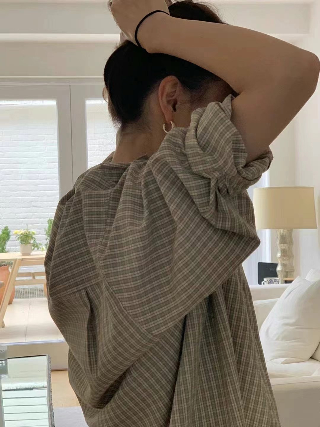 재고 한국 동대문우 * ce 초가을 프랑스 복고풍 긴 소매 격자 셔츠 느슨한 슬림 셔츠