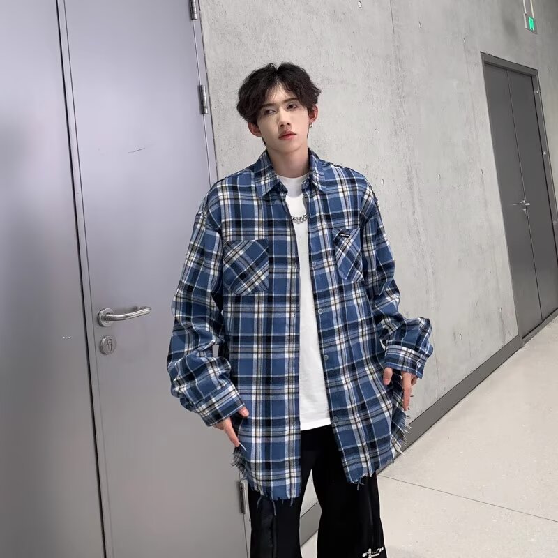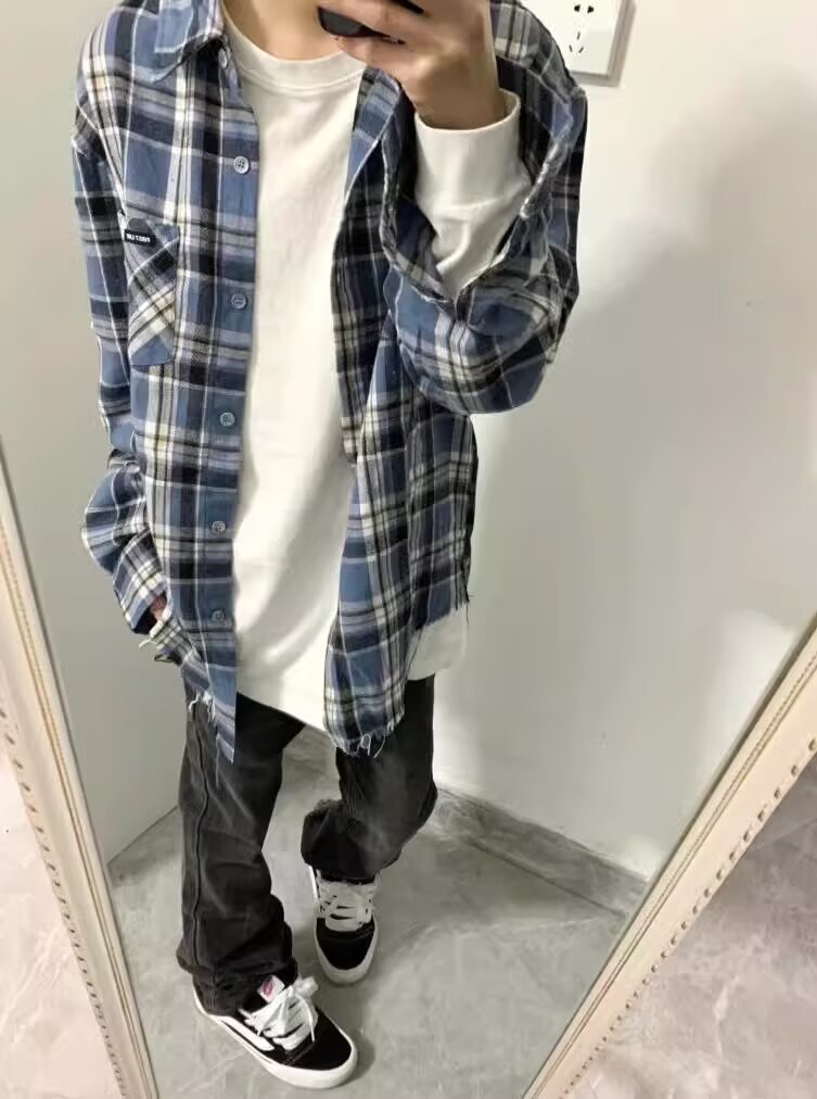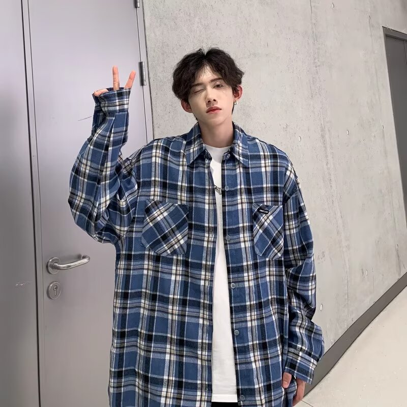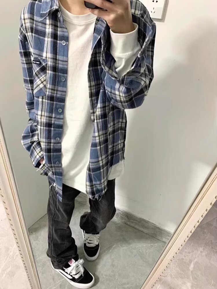 봄과 가을 푸른 격자 무늬 셔츠 느슨한 미국 패션 브랜드 느슨한 커플 캐주얼 긴 소매 체크 무늬 셔츠 재킷 남성용스토어 가기