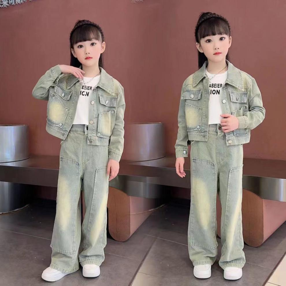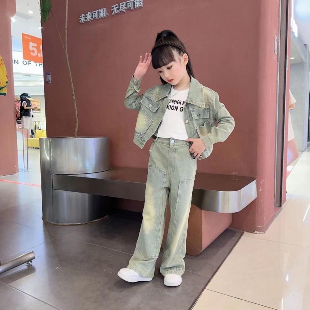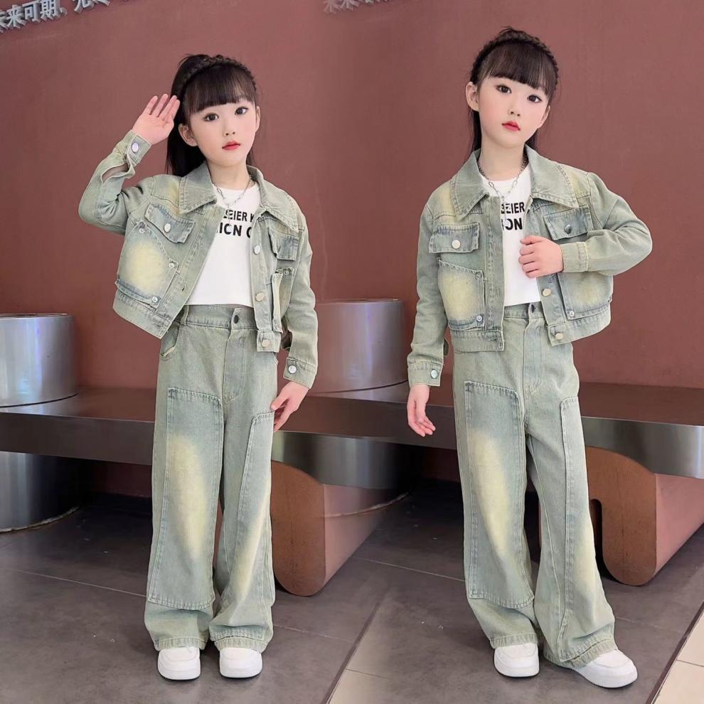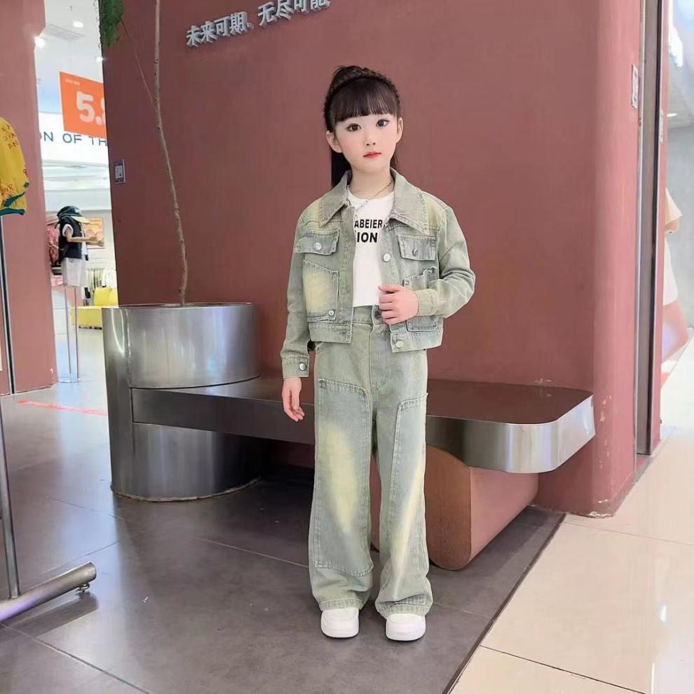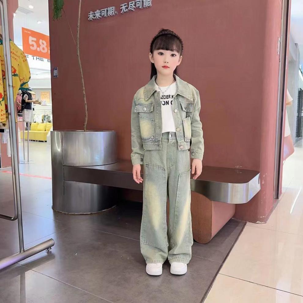 소녀 세트 가을 2025 새로운 튀김 거리 소녀 미국 복고풍 도구 데님 코트 스트레이트 바지 투피스 세트