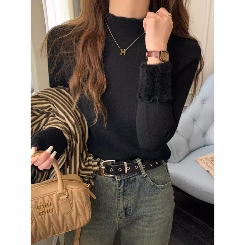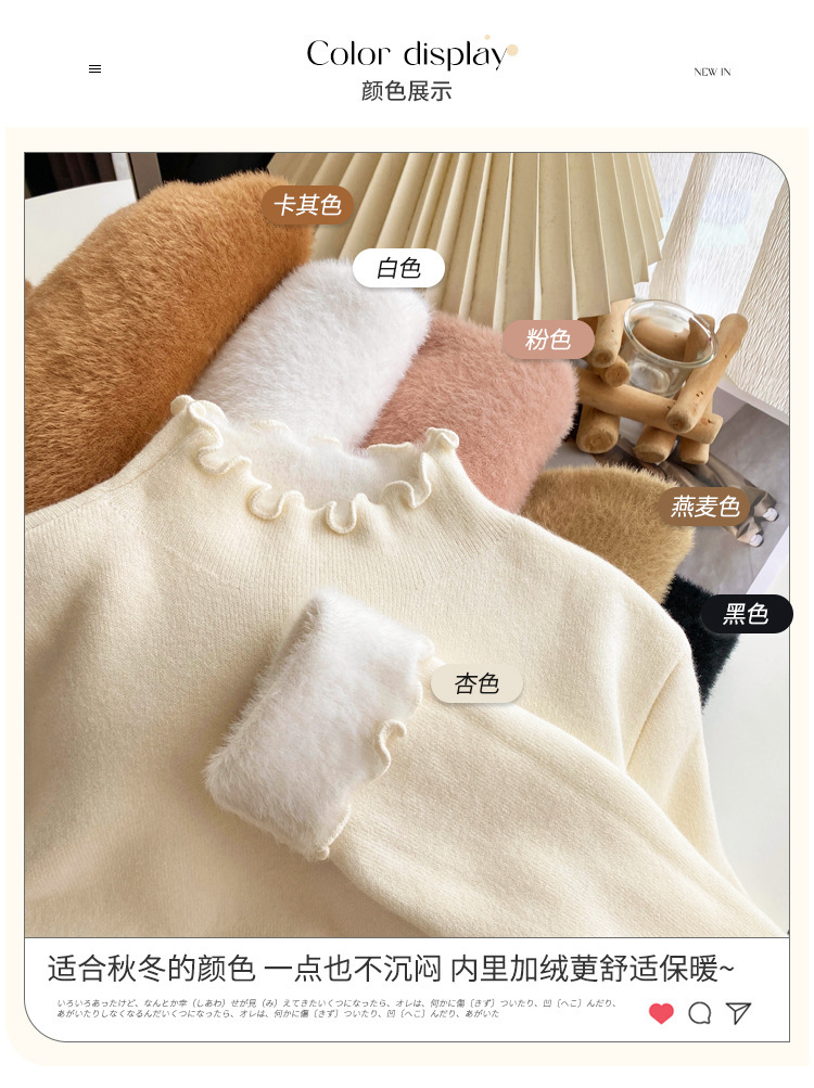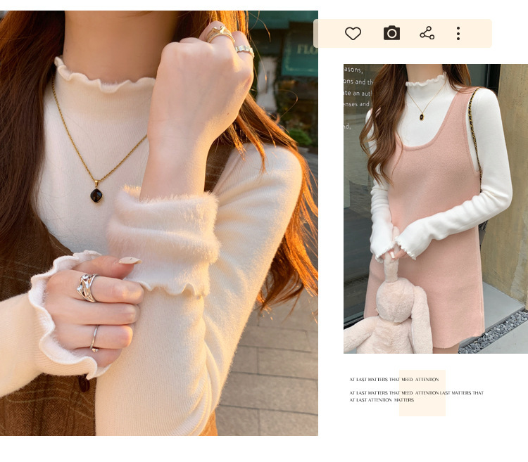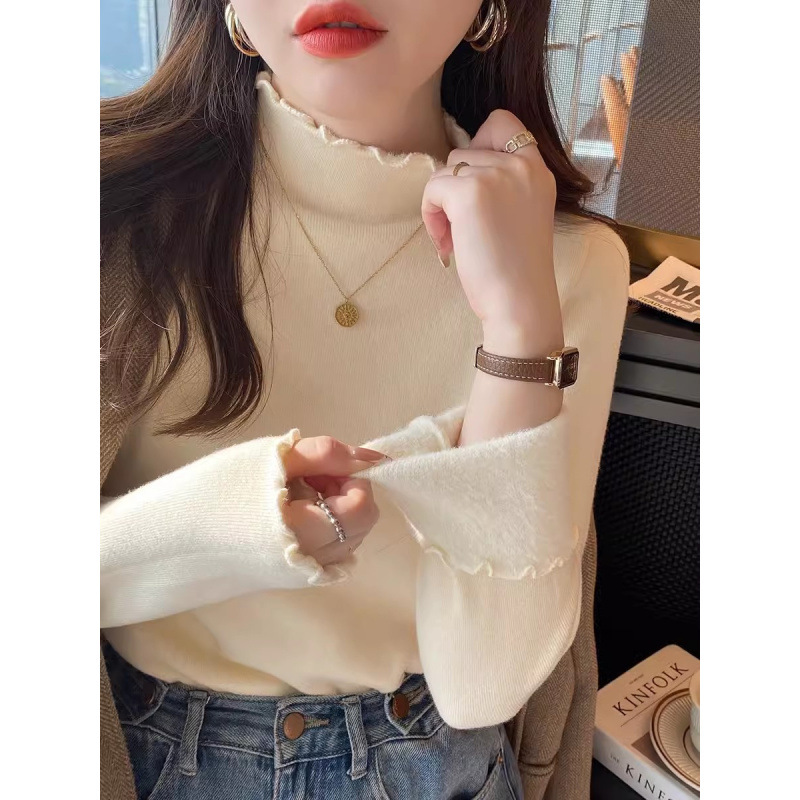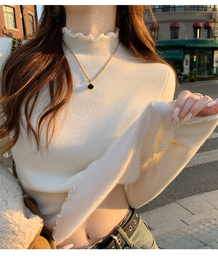 가을과 겨울 따뜻한 기모 두꺼운 흰색 스웨터를위한 모의 높이 칼라가있는 여성용 긴팔베이스 니트 탑
