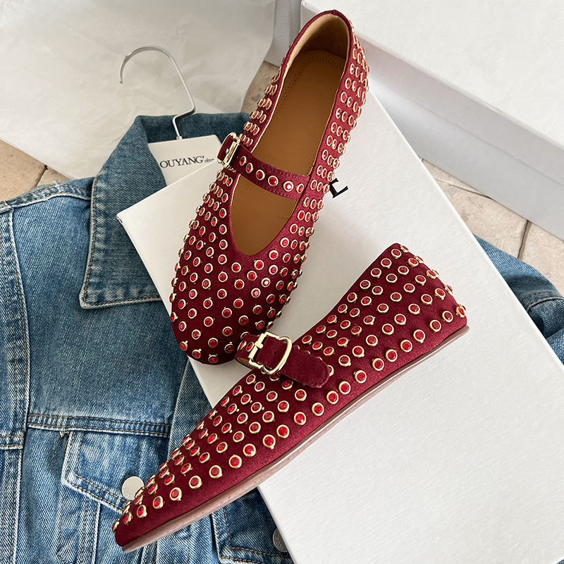 둥근 발가락 메리 제인 신발 여성 2025 년 봄 새로운 초파리 얕은 평평한 신발 모조 다이아몬드 신발 버건디 신발