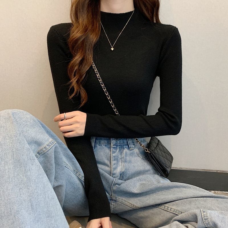 한국식 하프 하이 넥 솔리드 컬러 니트 스웨터 여자 내부 2025 가을 겨울 슬림핏 베이스 셔츠