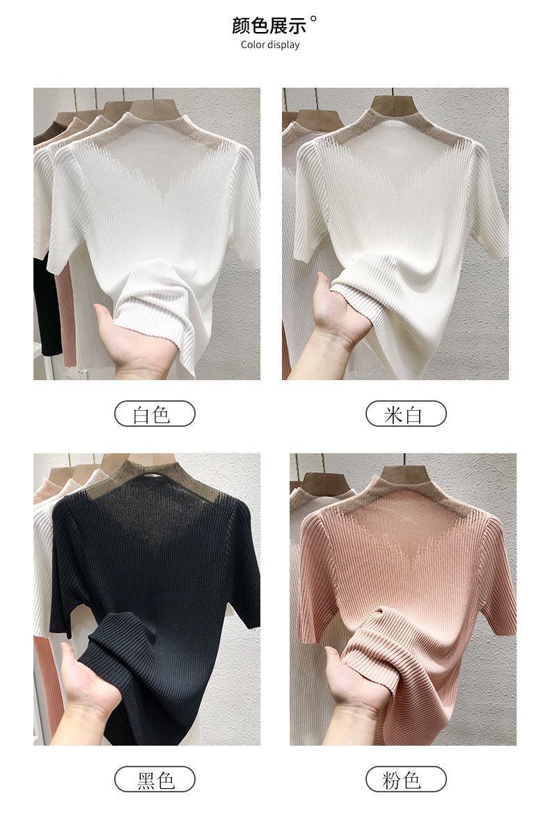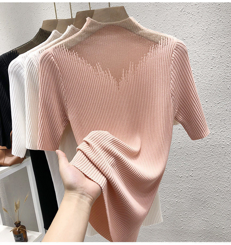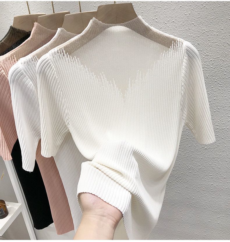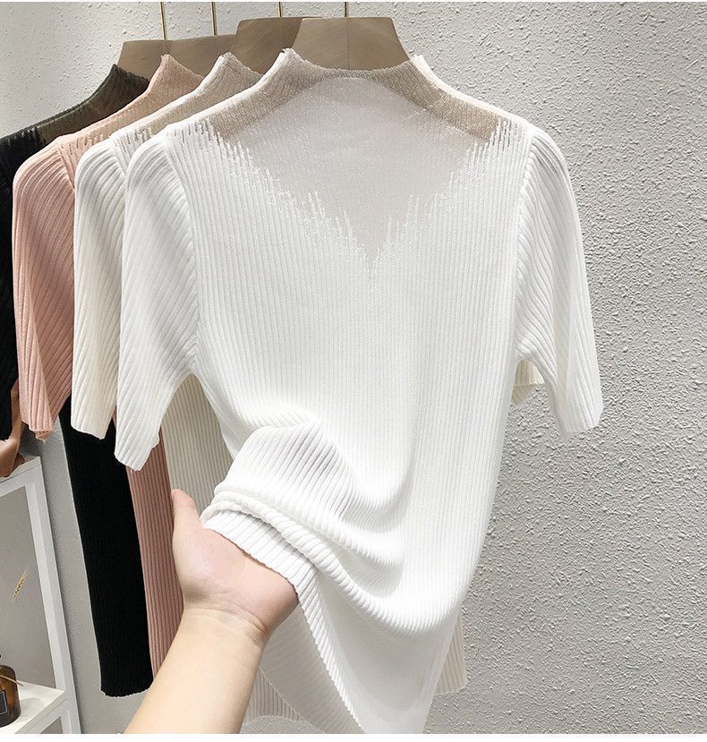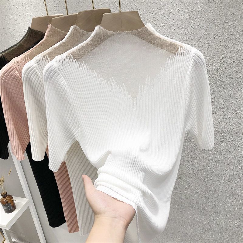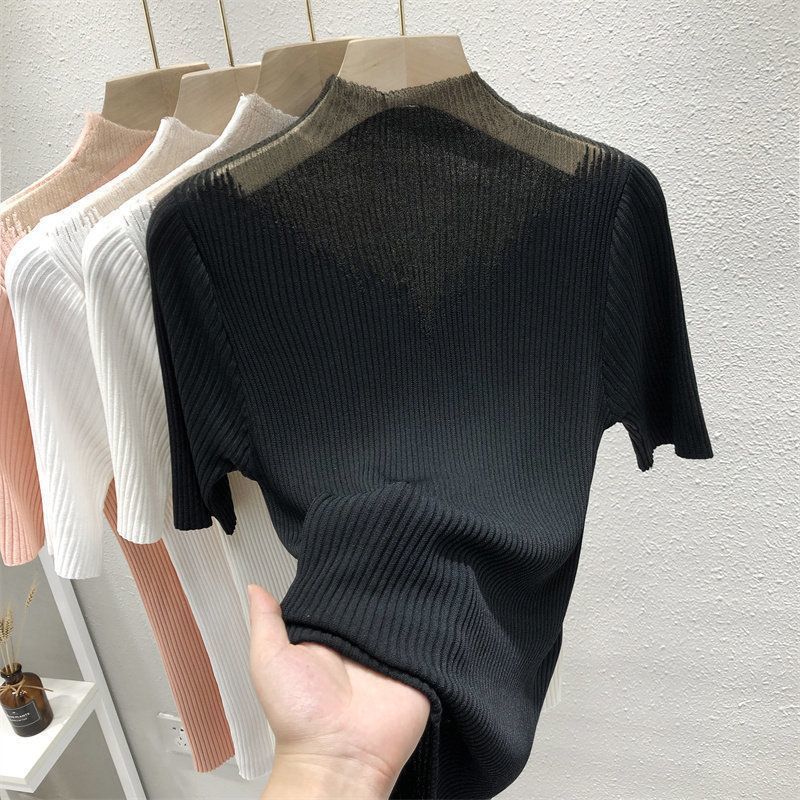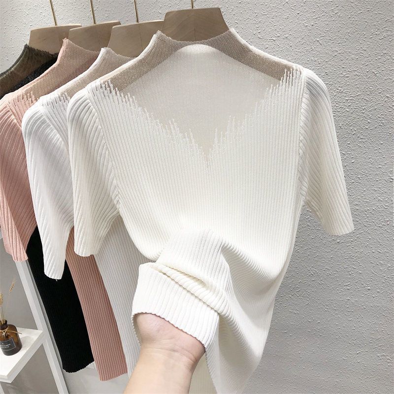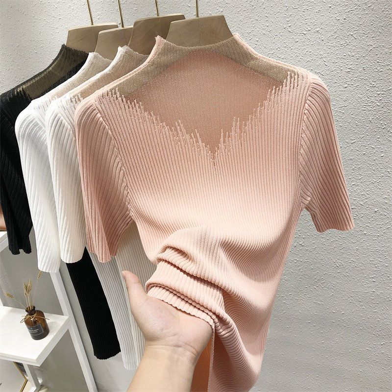 아이스 실크 메쉬 레이스 티셔츠 여성용 니트웨어 2025 여름 새로운 슬림 핏 얇은 올 매치 반소매 최고 트렌디스토어 가기