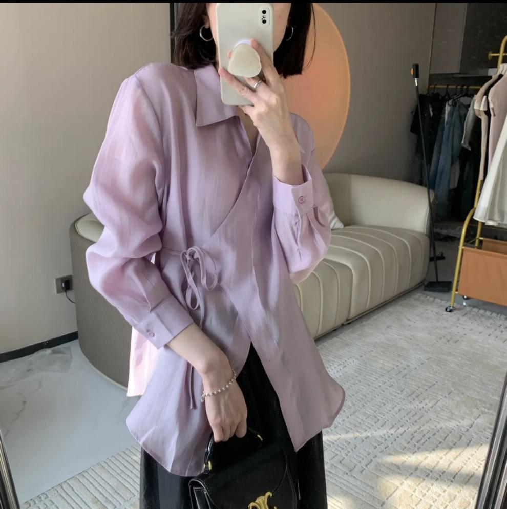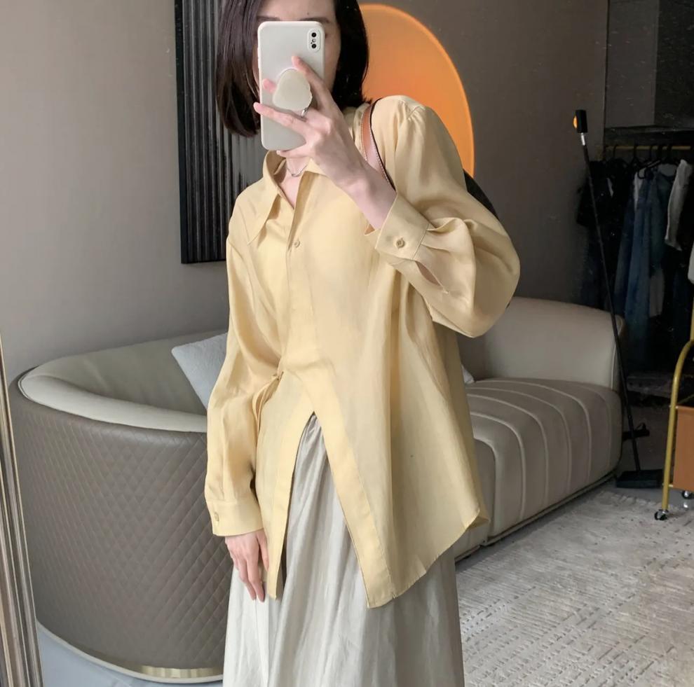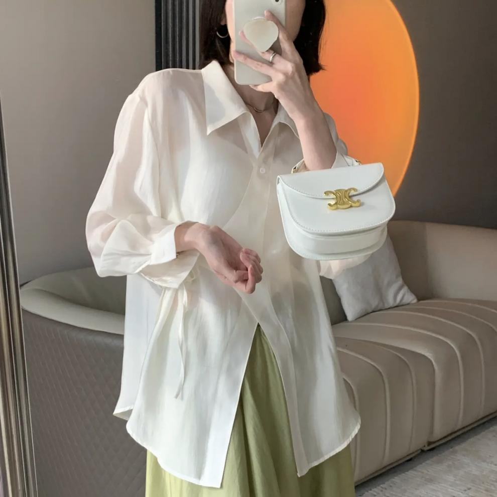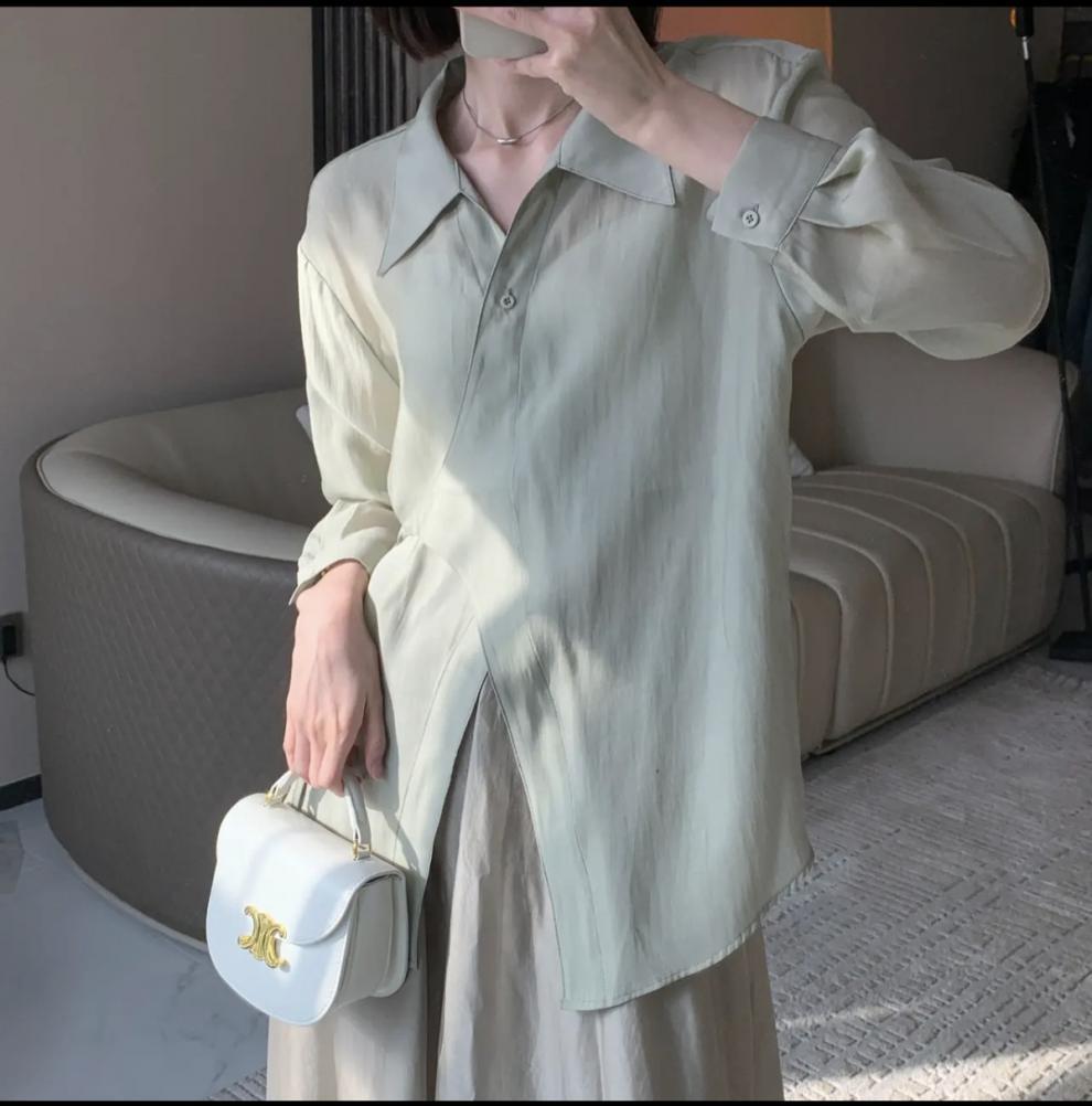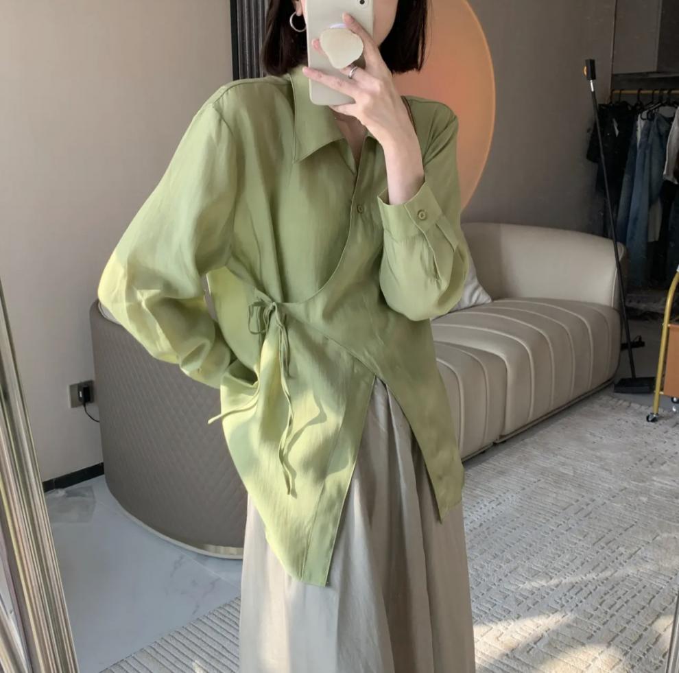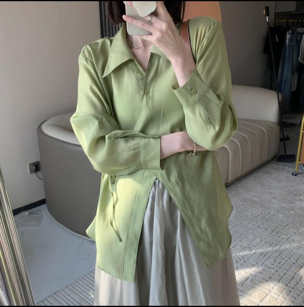 여름 2025 한국식 텐셀 긴팔 경량 통기성 녹색 선 스크린 셔츠 여성용 느슨한 마이크로 투명 세련된 탑스토어 가기