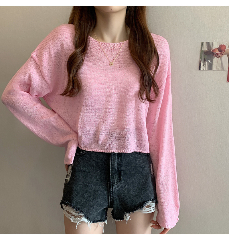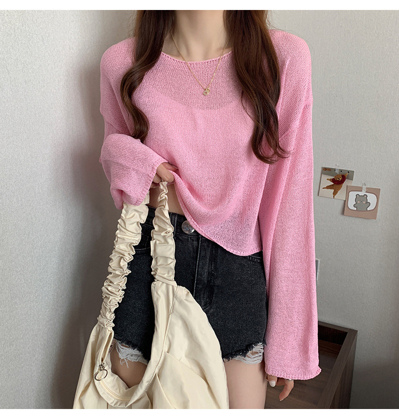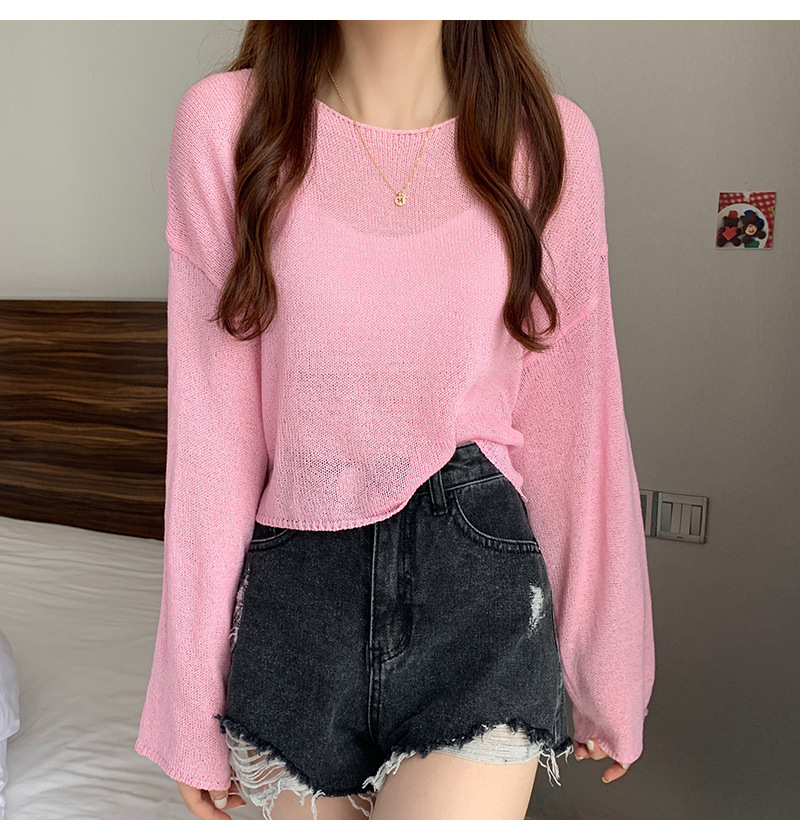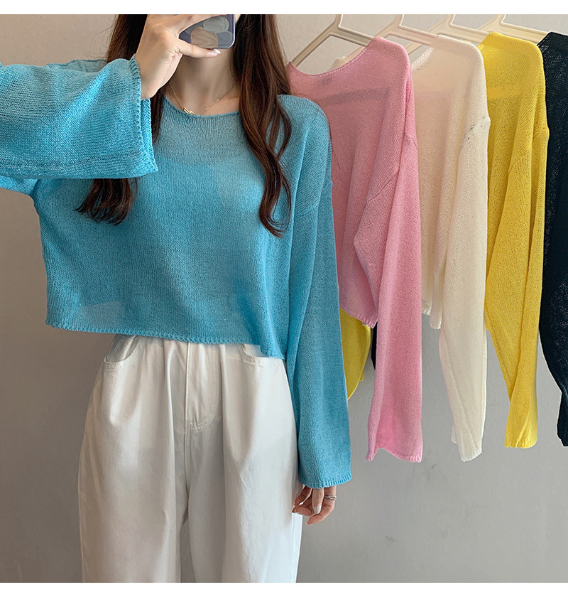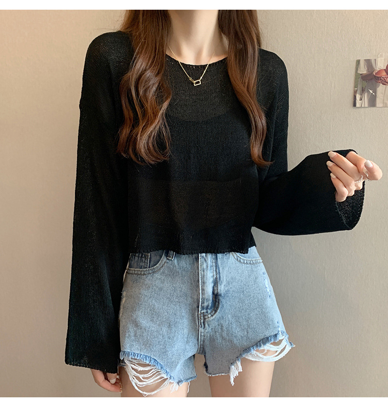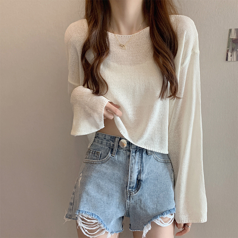 아이스 실크 선 스크린 블라우스 니트 여성용 여름 얇은 흰색 긴팔 슬립 스커트 외부 짧은 메쉬 초가을 탑스토어 가기