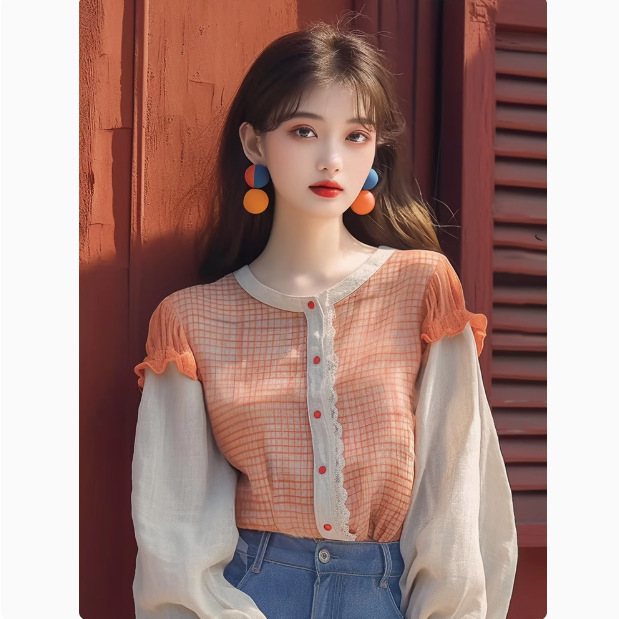2025 년 이른 봄 새 셔츠 폭발 틈새 세련된 고급 한국식 연령 감소 오렌지 격자 무늬 여성용 긴팔 탑스토어 가기
