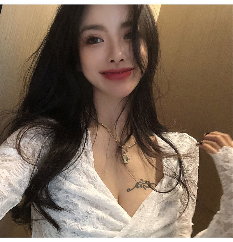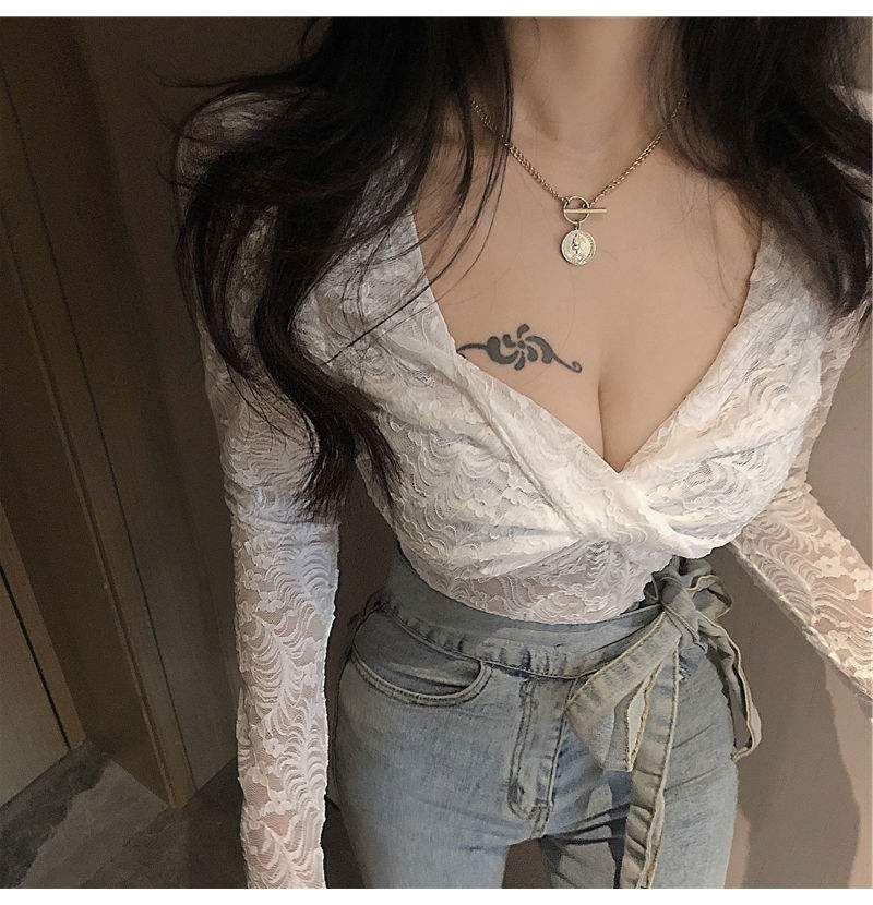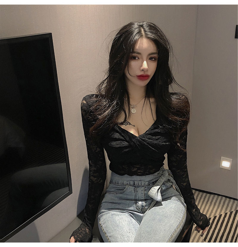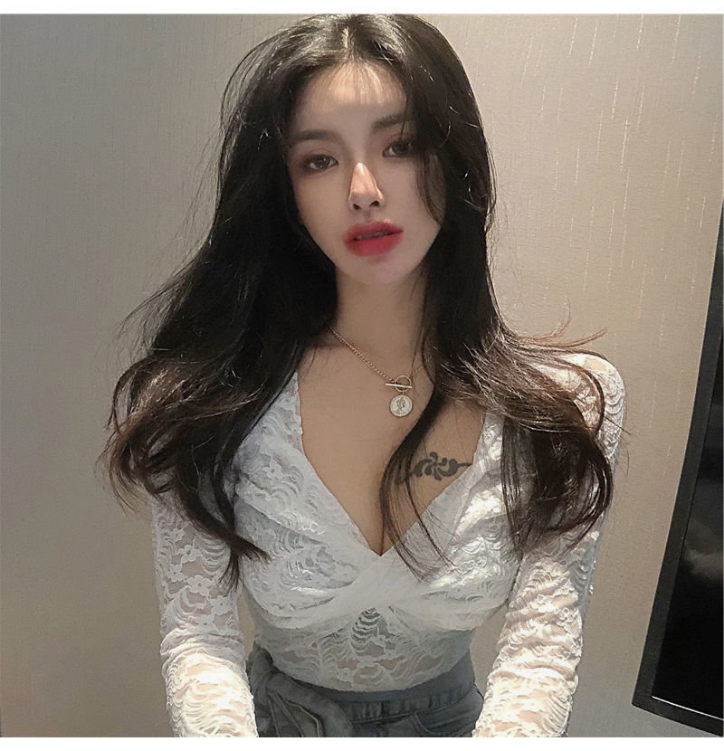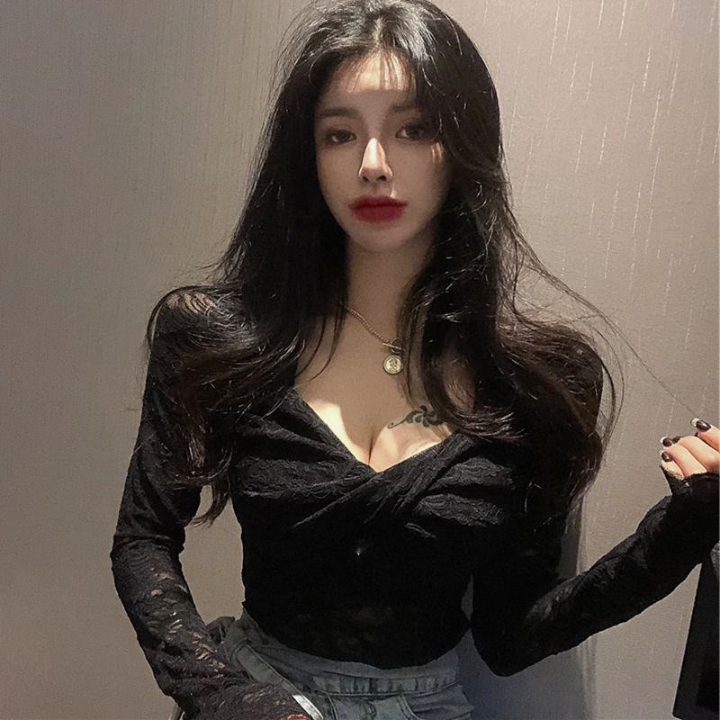 가을과 겨울 새로운 한국 스타일 슬림핏 슬리밍 우아한 V 넥 긴팔 티셔츠 여성용 섹시한 레이스베이스 셔츠 최고 트렌디스토어 가기