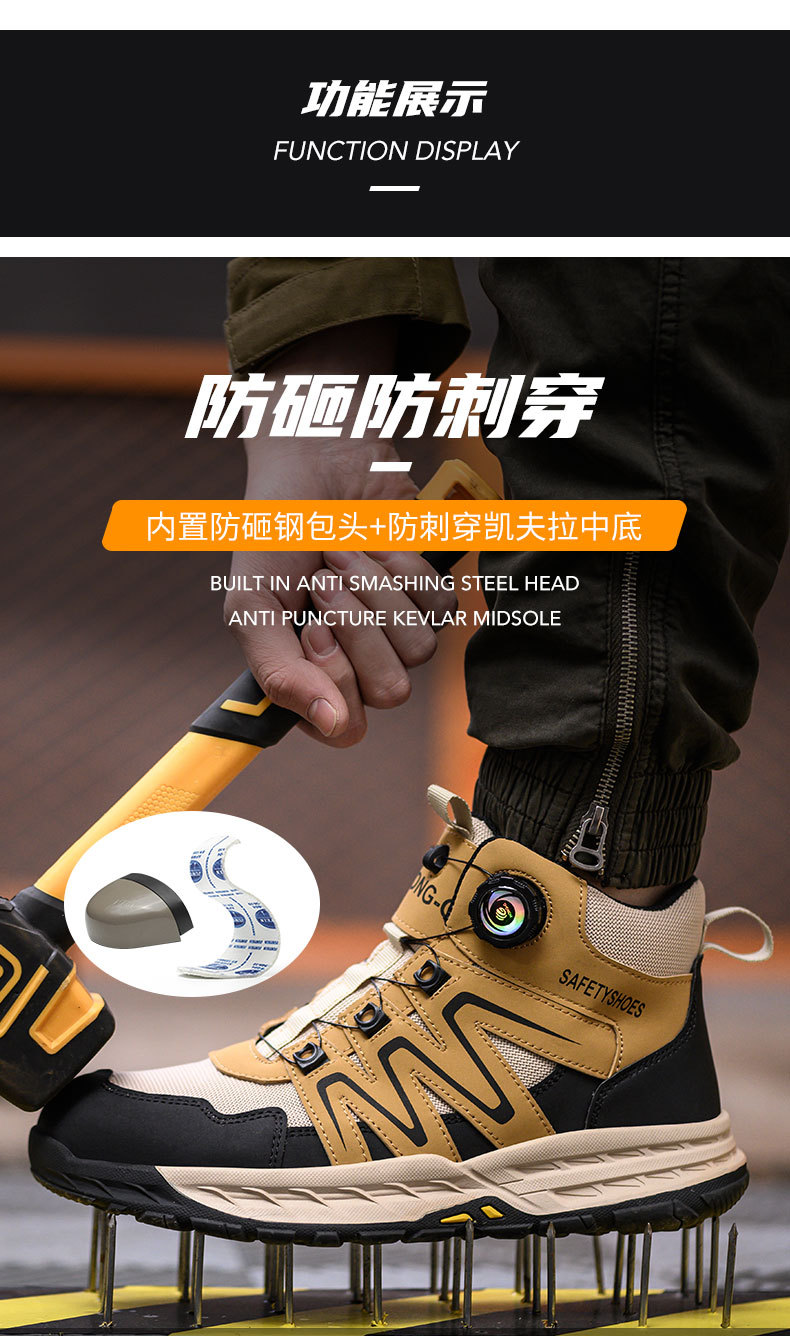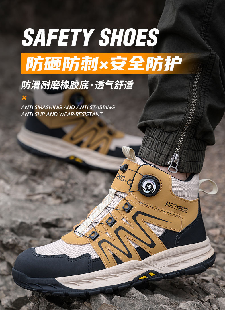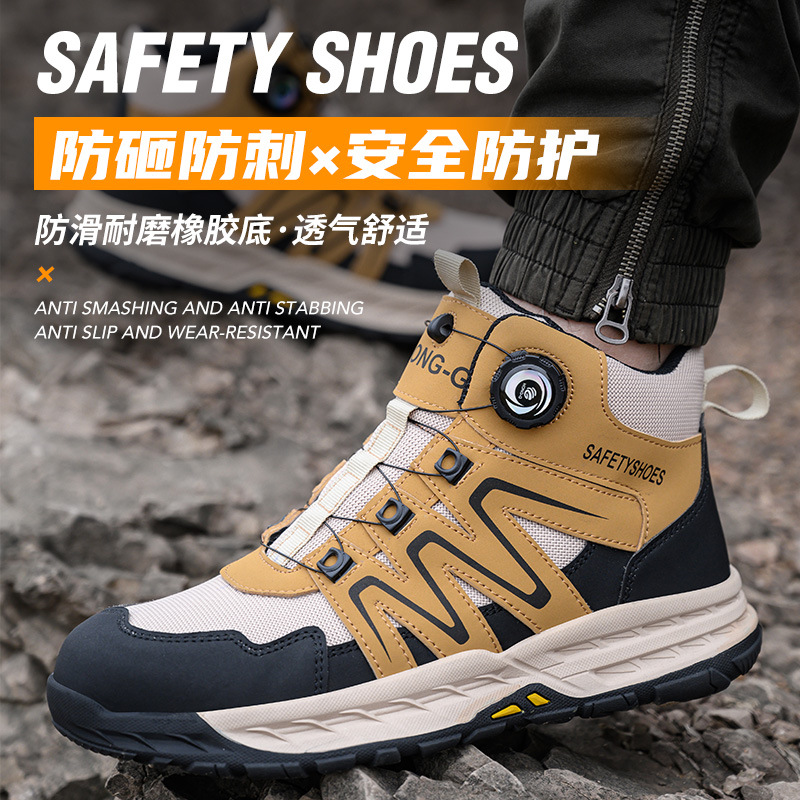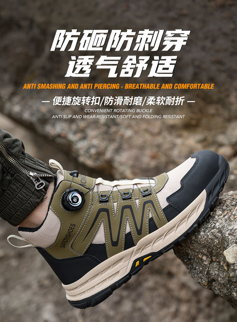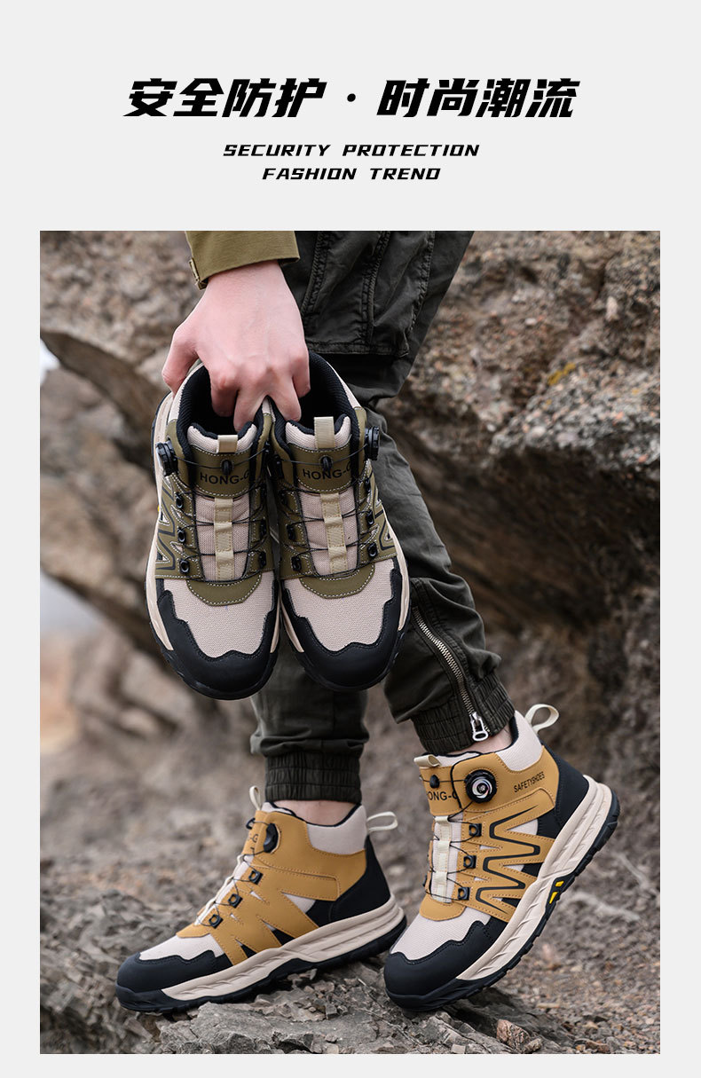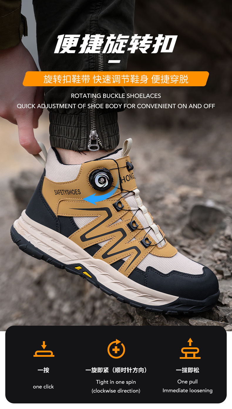 크로스보더 패션 회전 버튼 하이탑 안전화, 충격 방지 및 관통 방지 안전화, 끈 없는 편리한 신발, 내마모성 신발