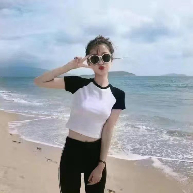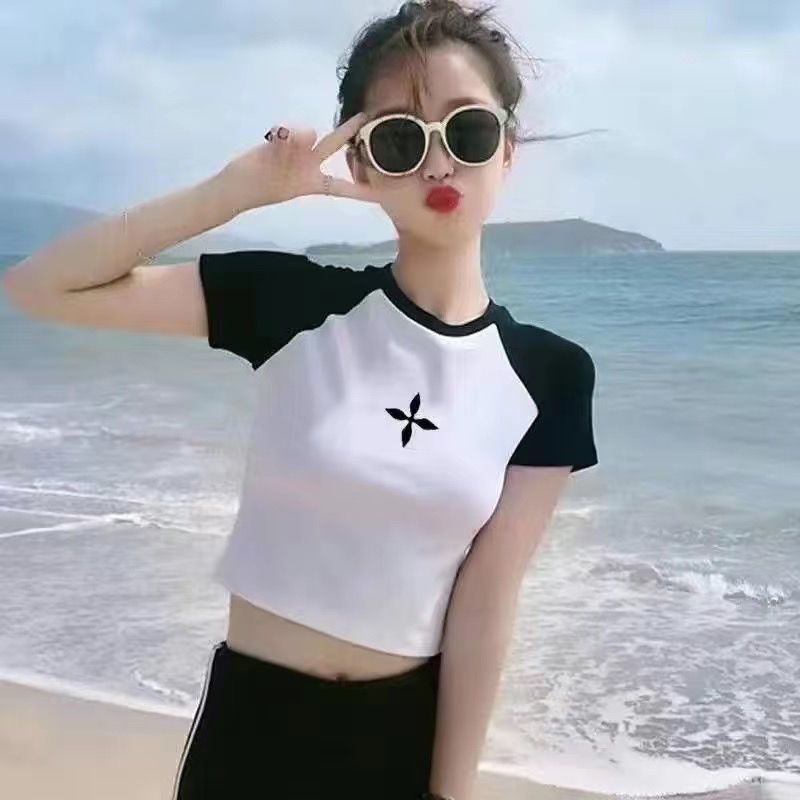 여름 높은 허리 꽉 맞는 컬러 블록 라글란 슬리브 디자인 탑을위한 오픈 숄더가있는 여성용 반소매 티셔츠스토어 가기