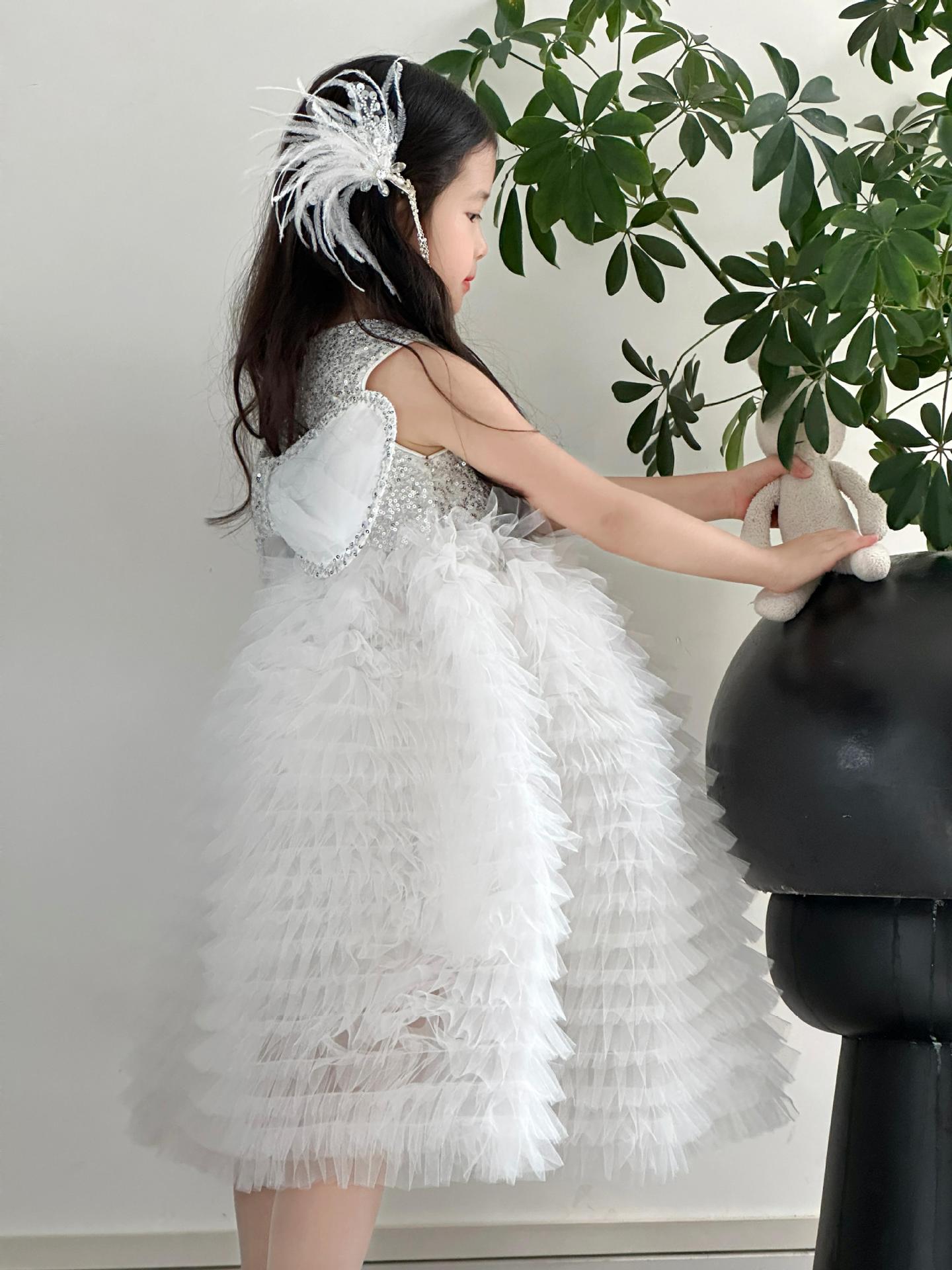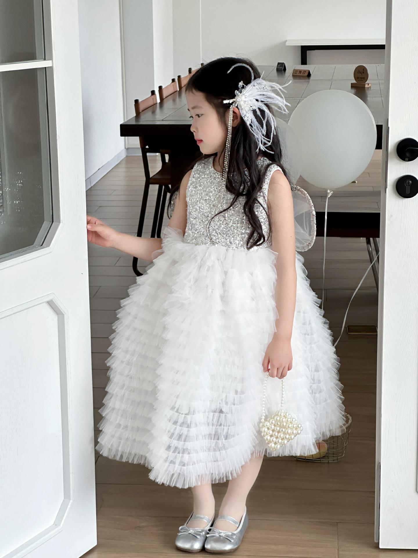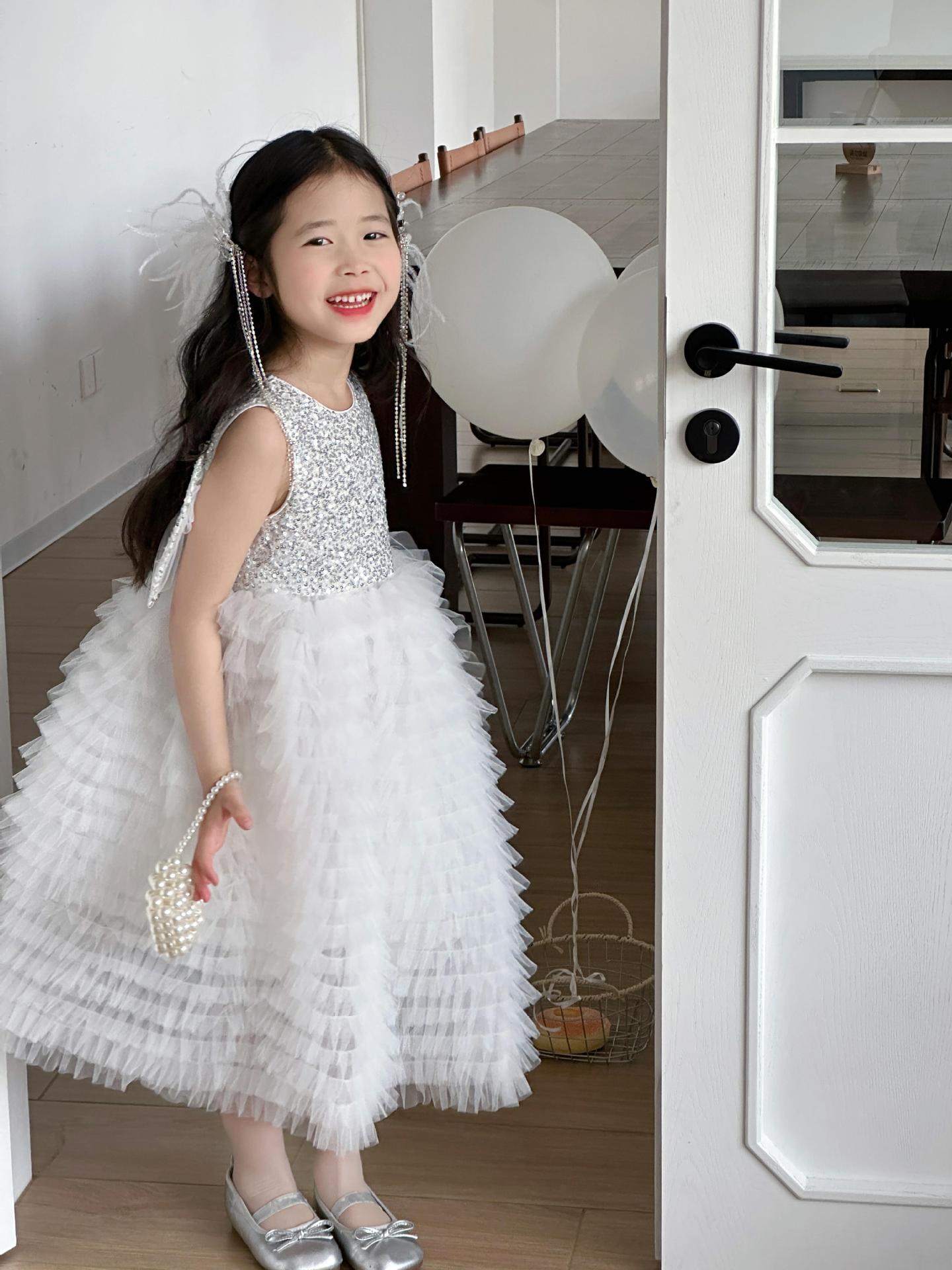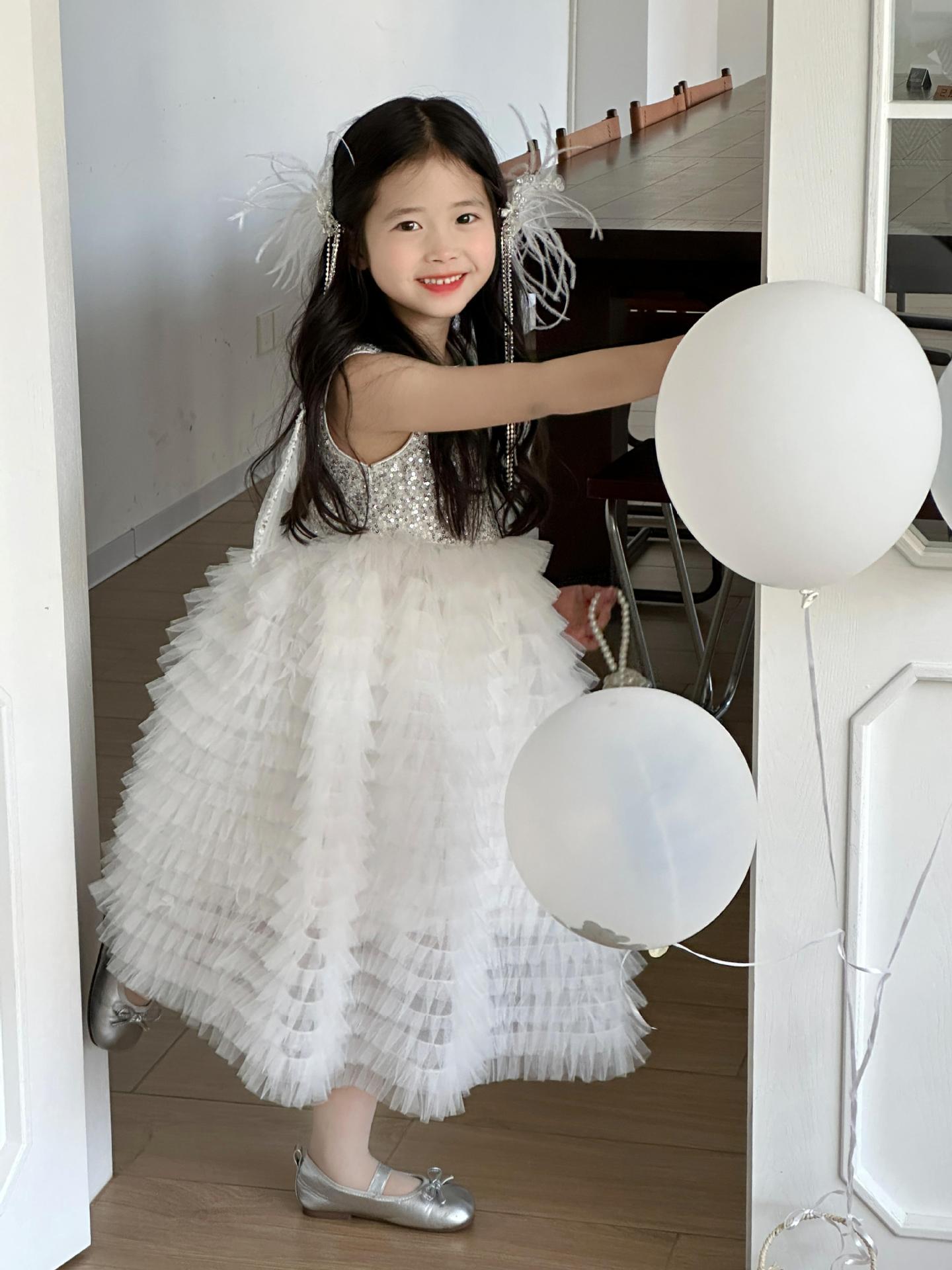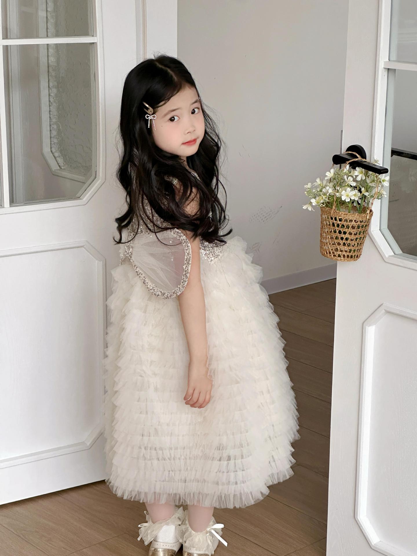 2025 소녀의 원피스 소녀의 구슬 퐁폰 베일 원피스 날개와 함께 어린이 생일 원피스 꽃 소녀의 원피스스토어 가기