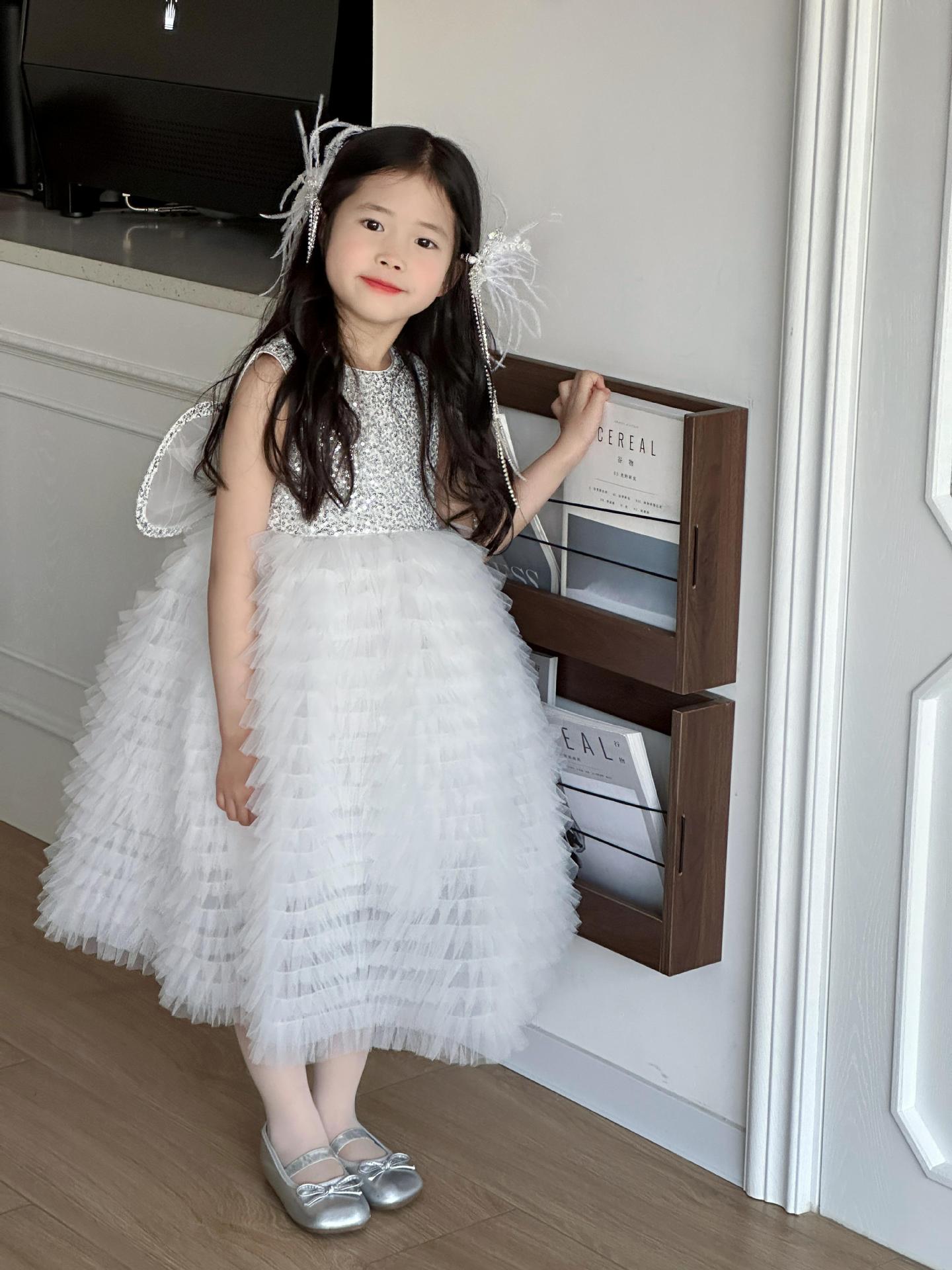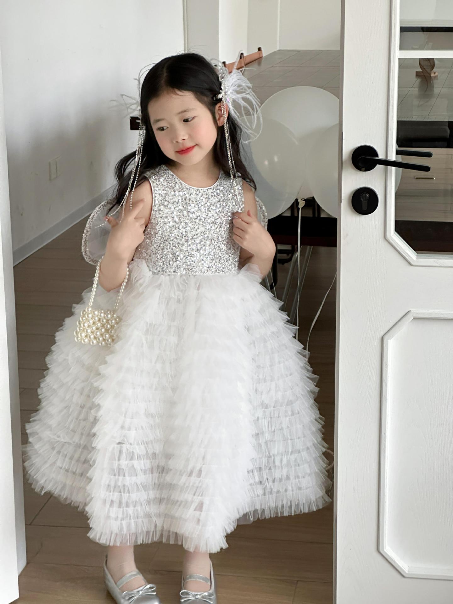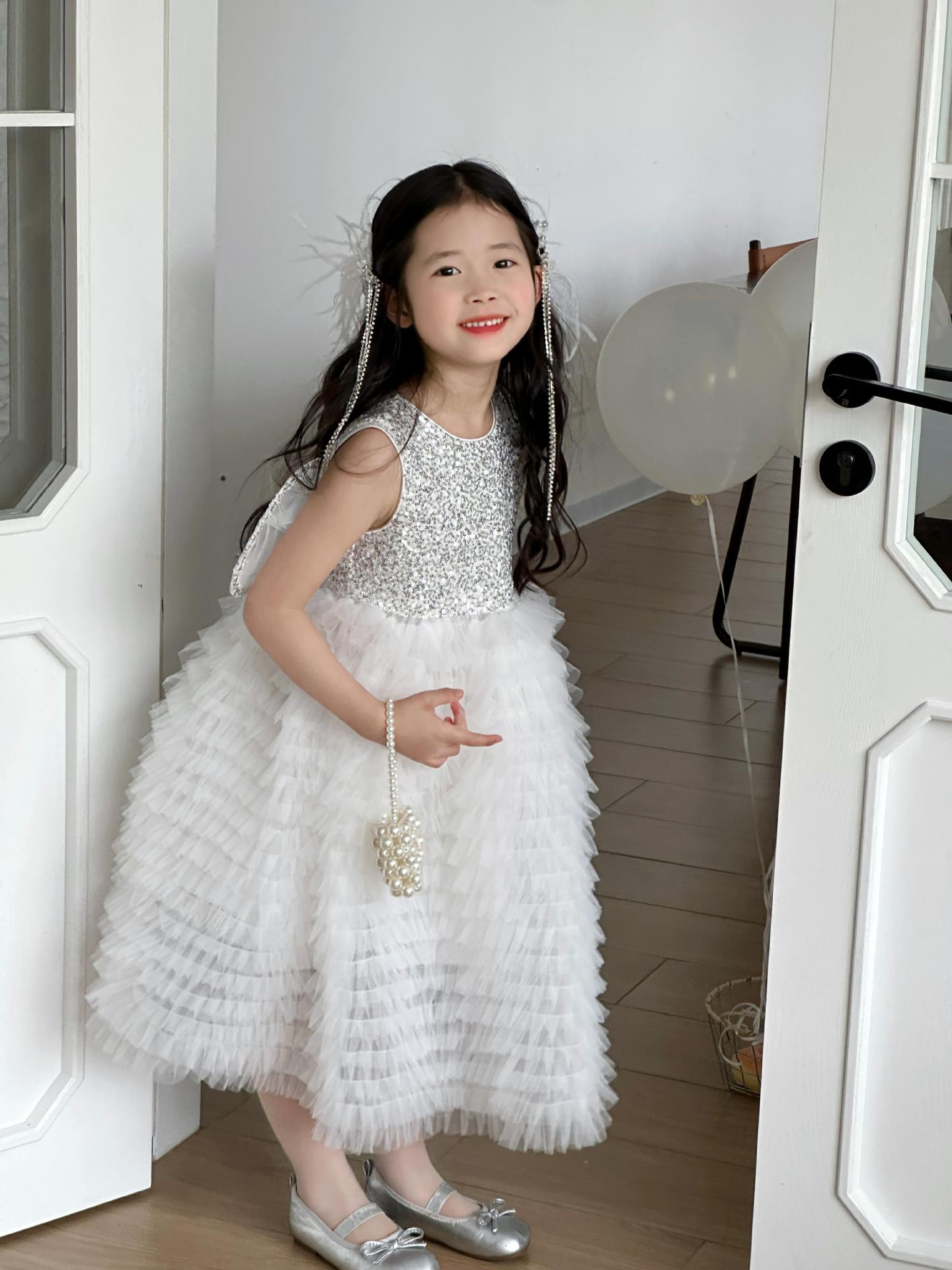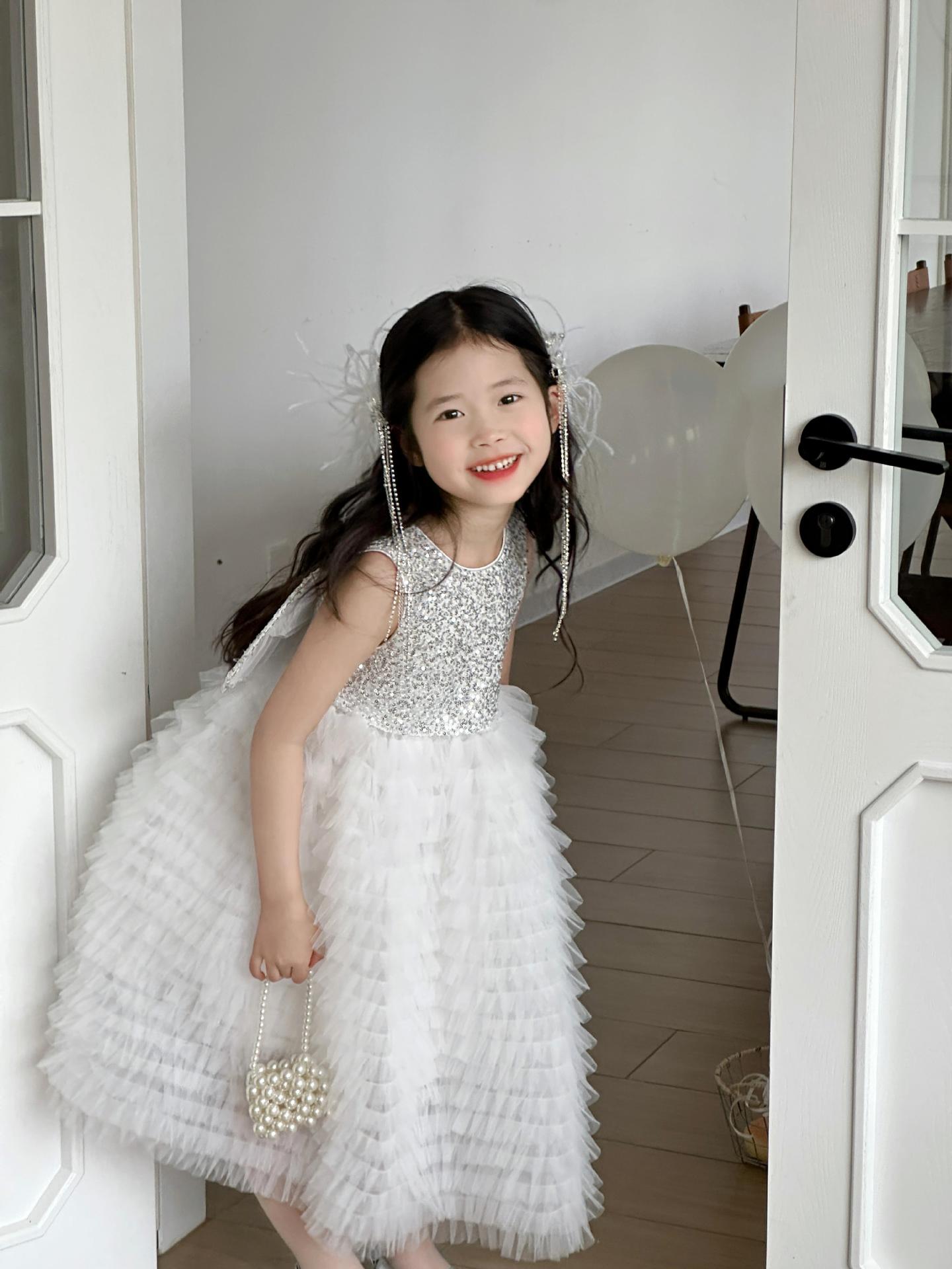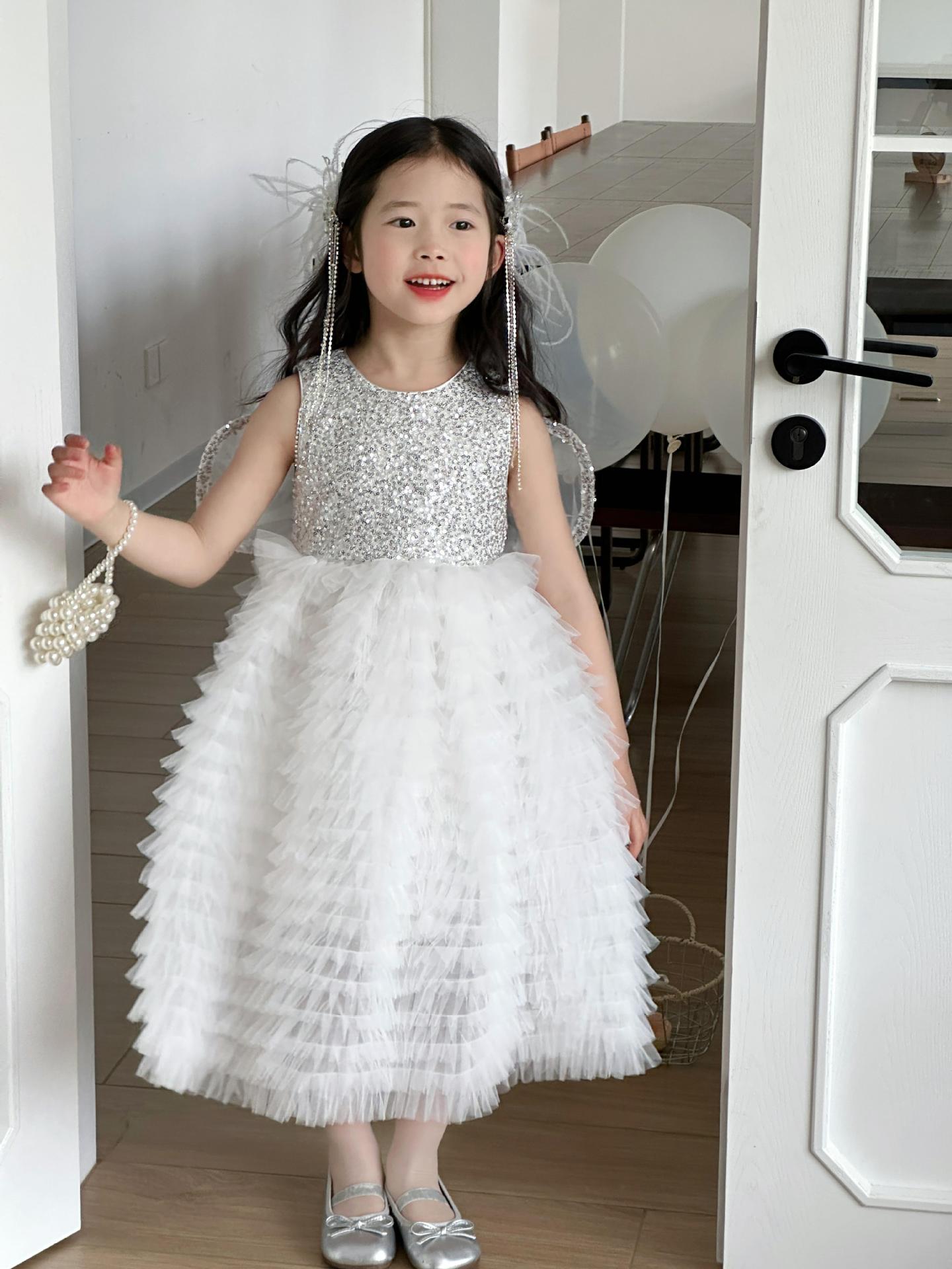 2025 소녀의 원피스 소녀의 구슬 퐁폰 베일 원피스 날개와 함께 어린이 생일 원피스 꽃 소녀의 원피스스토어 가기