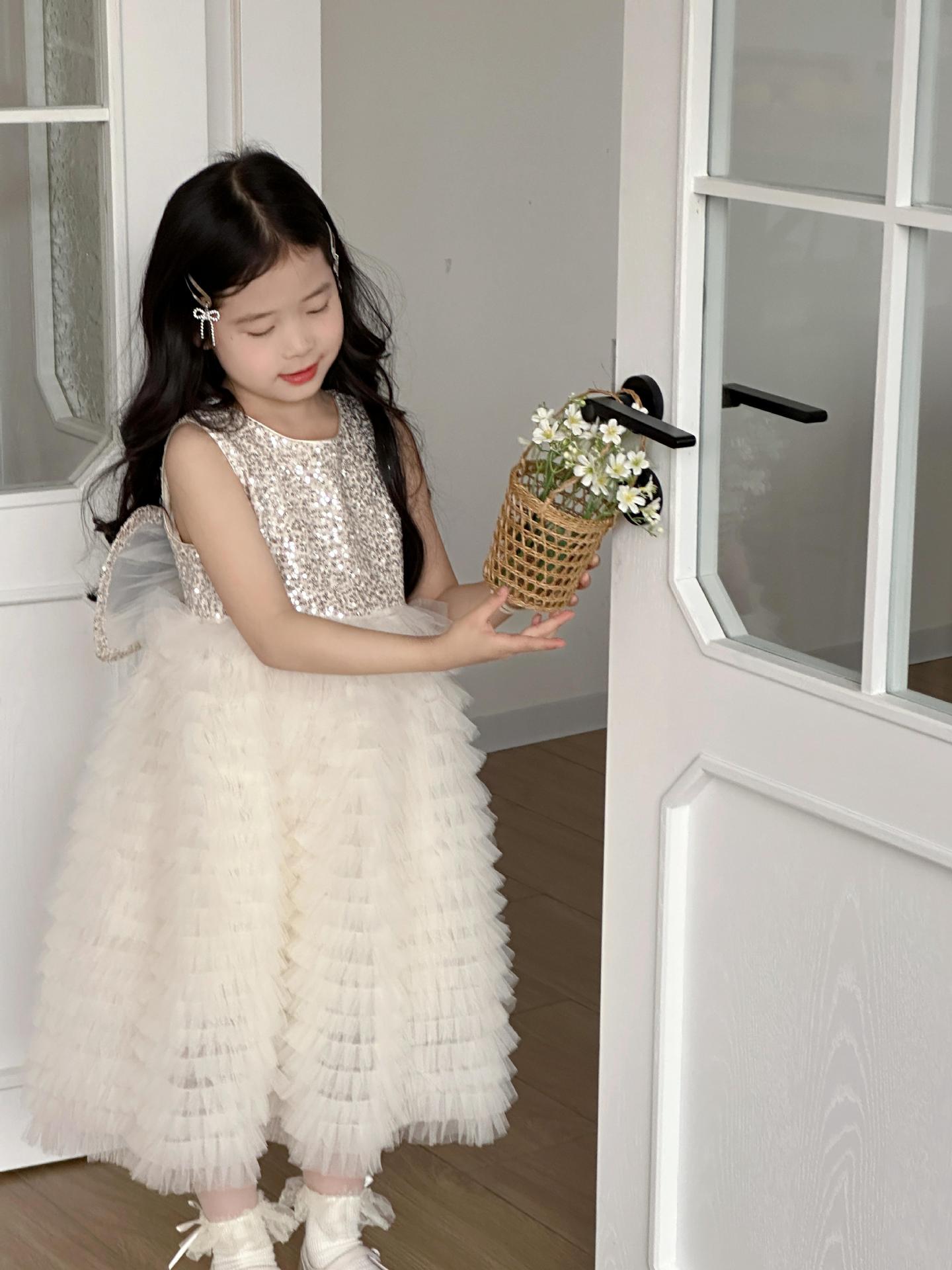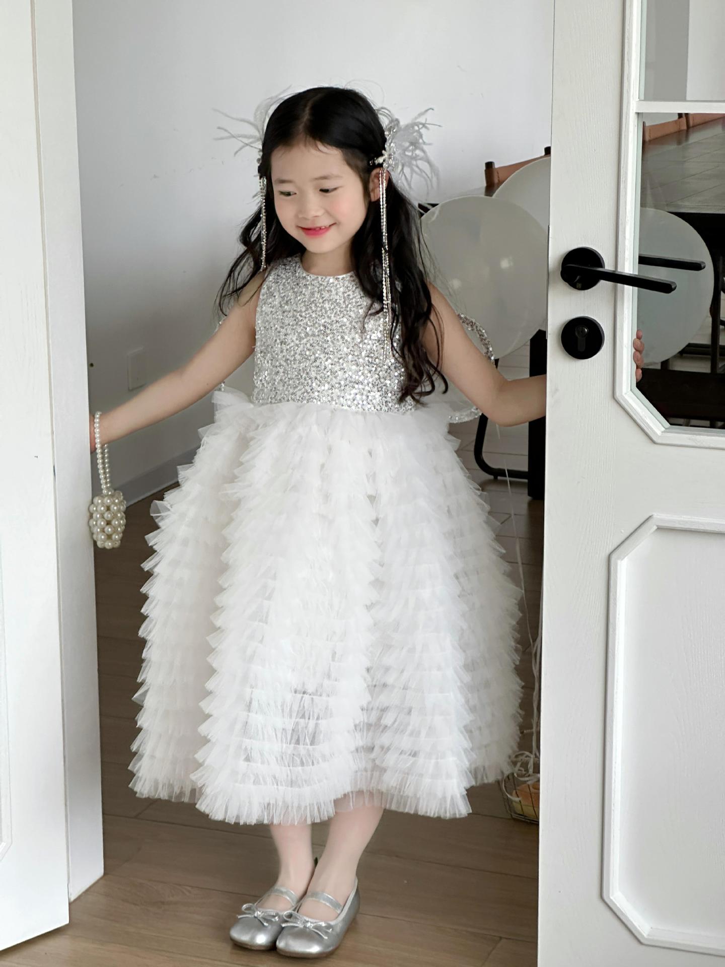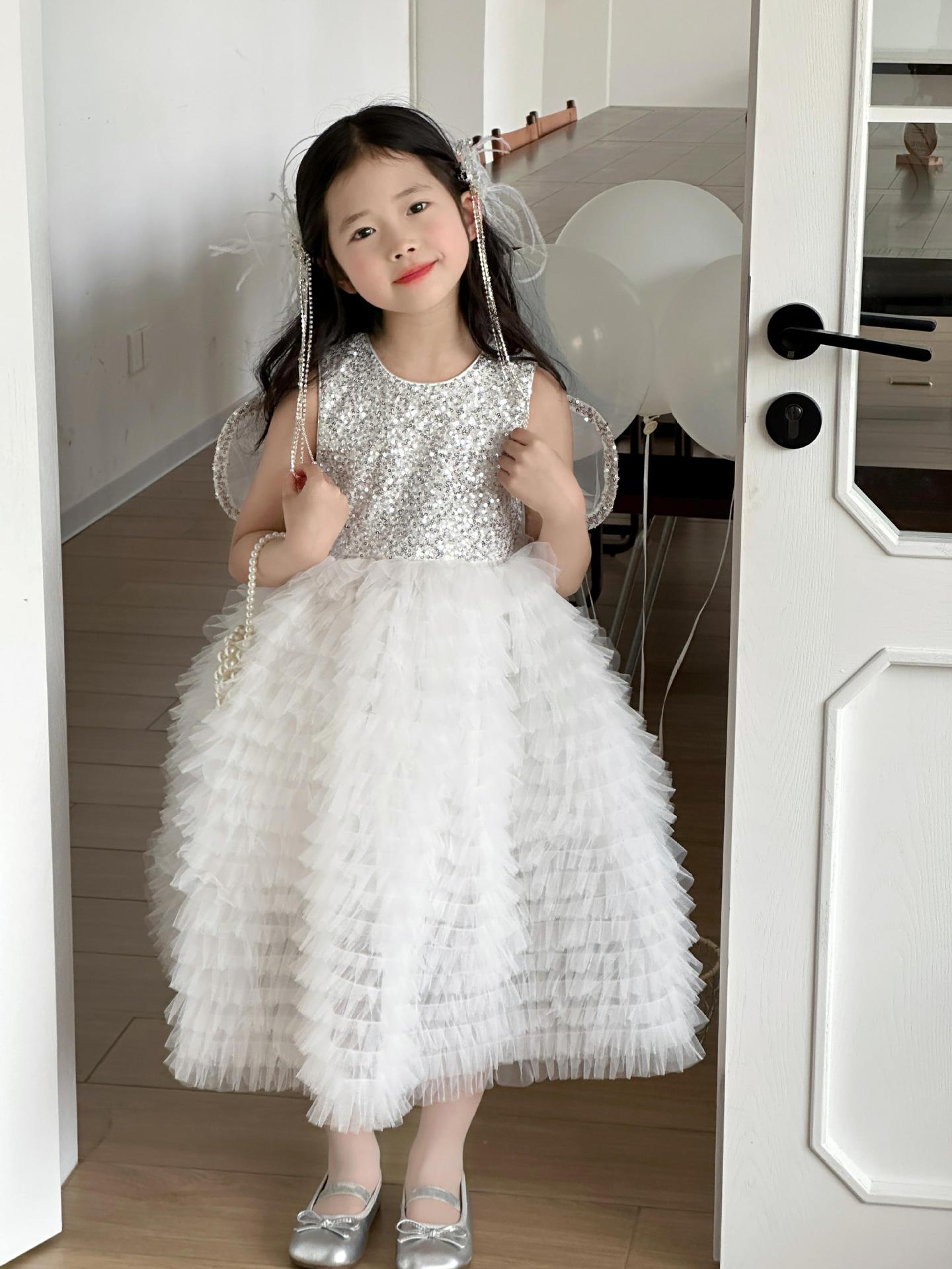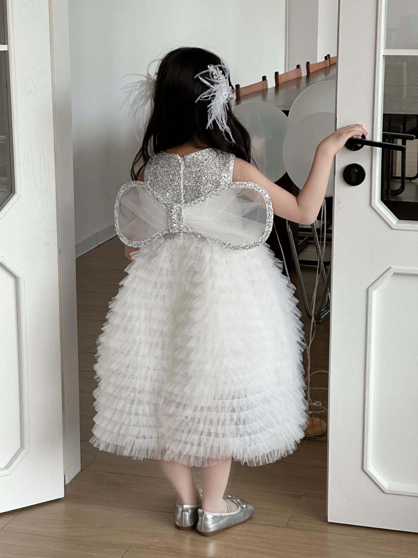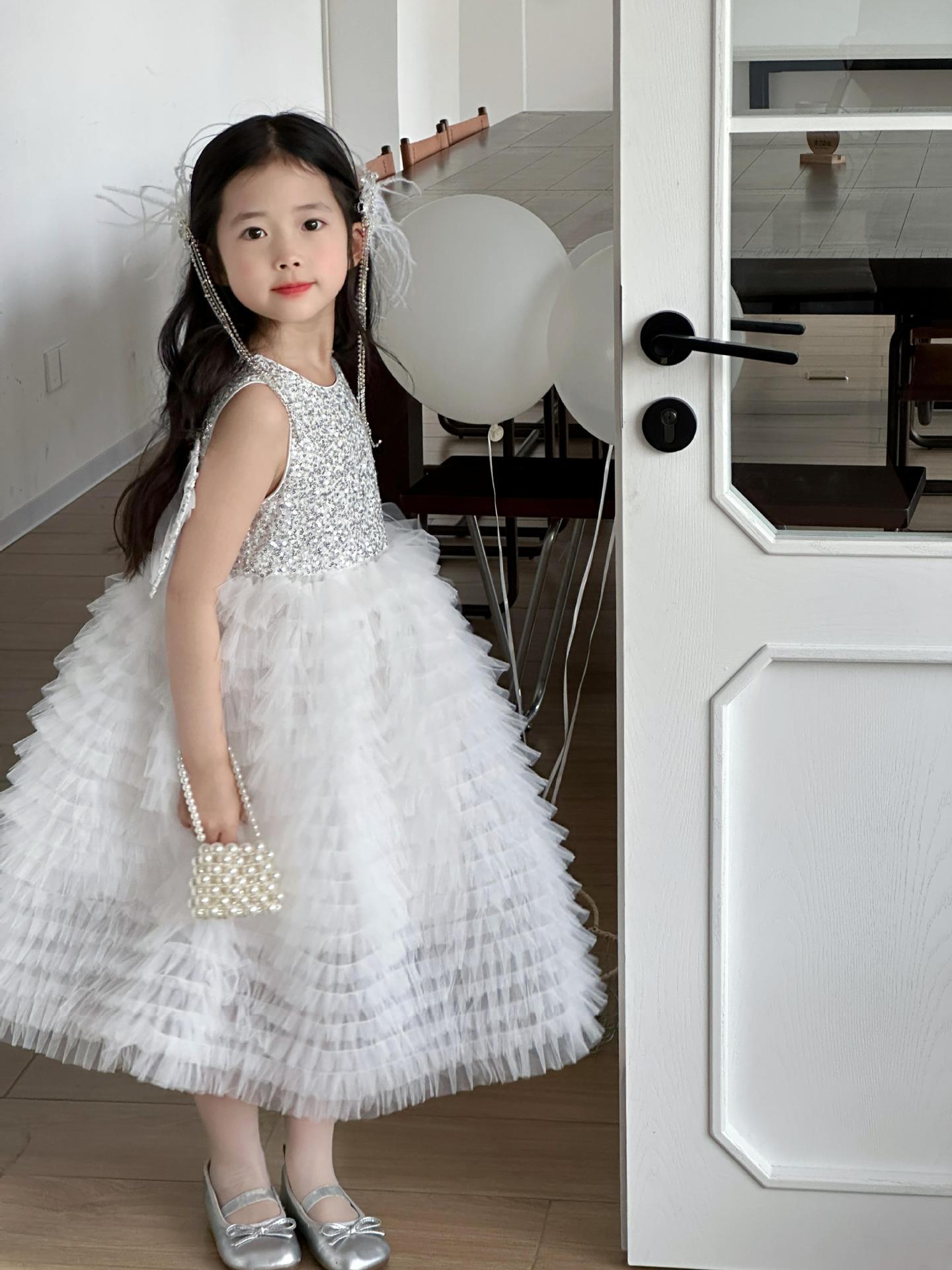 2025 소녀의 원피스 소녀의 구슬 퐁폰 베일 원피스 날개와 함께 어린이 생일 원피스 꽃 소녀의 원피스스토어 가기