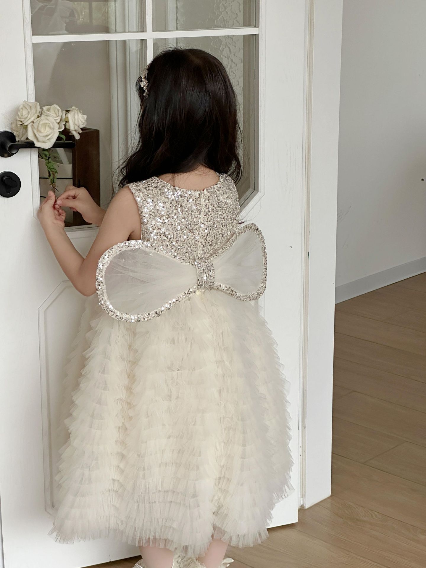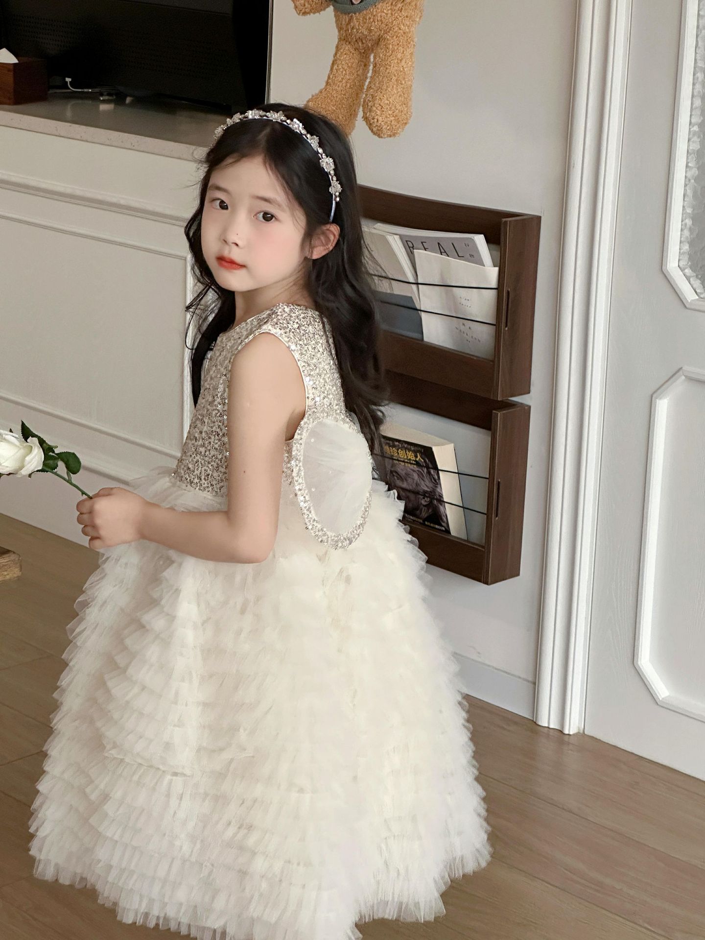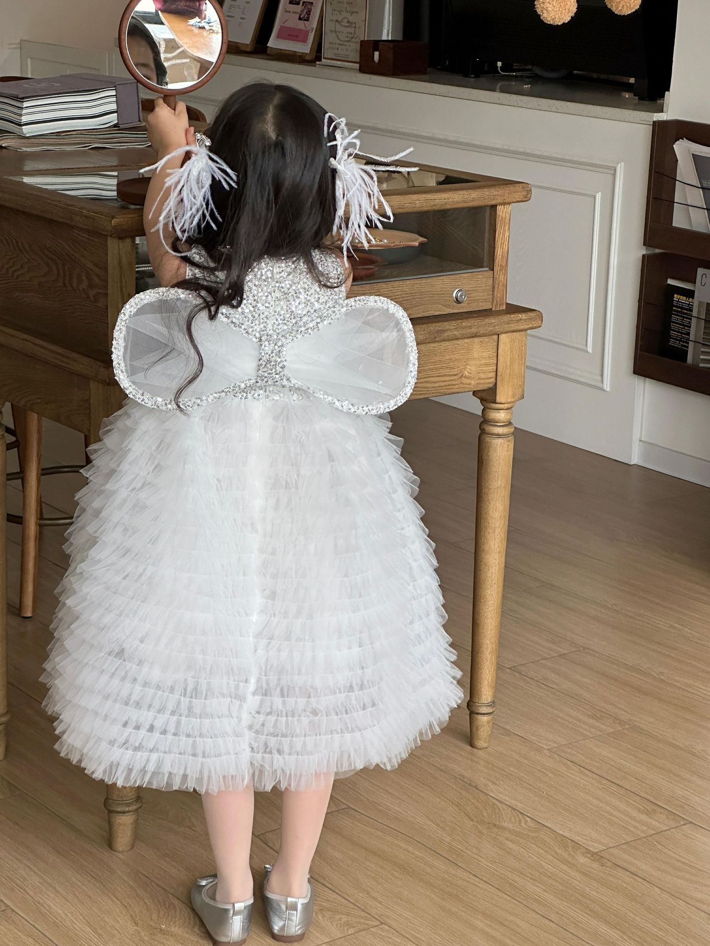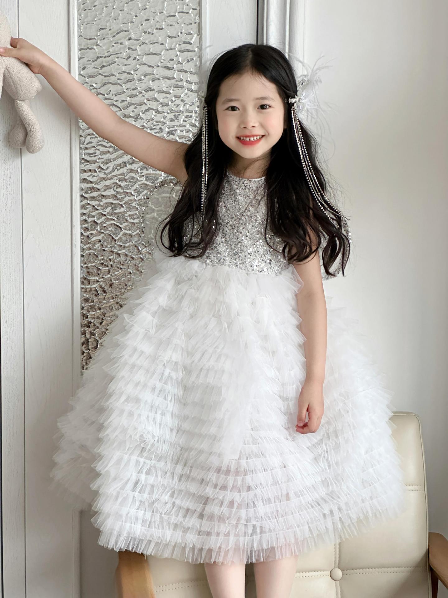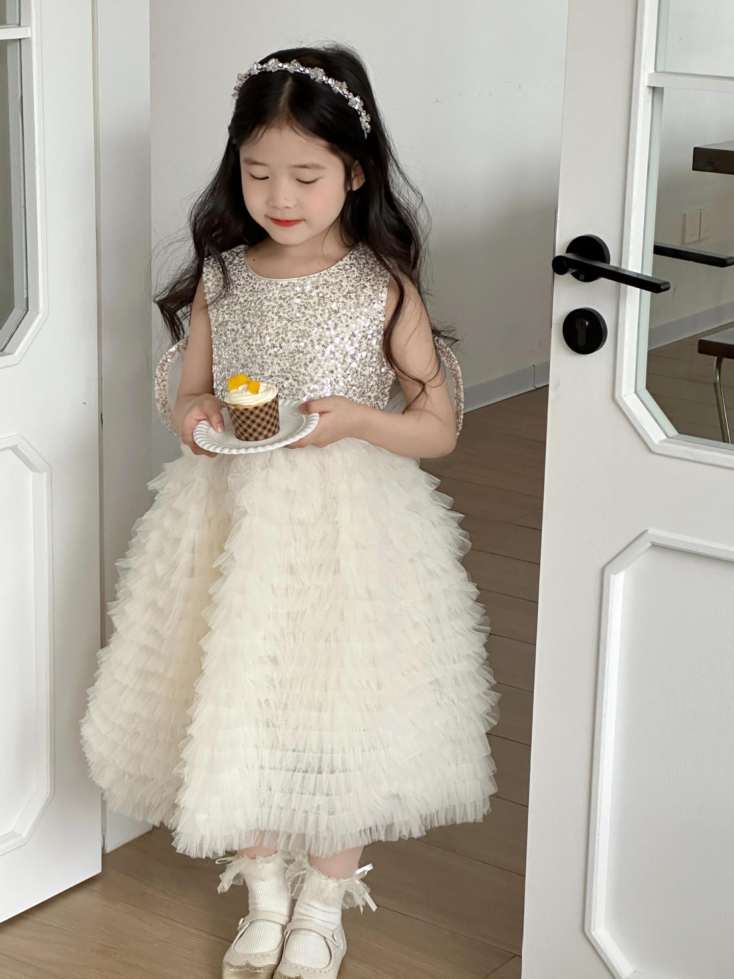 2025 소녀의 원피스 소녀의 구슬 퐁폰 베일 원피스 날개와 함께 어린이 생일 원피스 꽃 소녀의 원피스스토어 가기