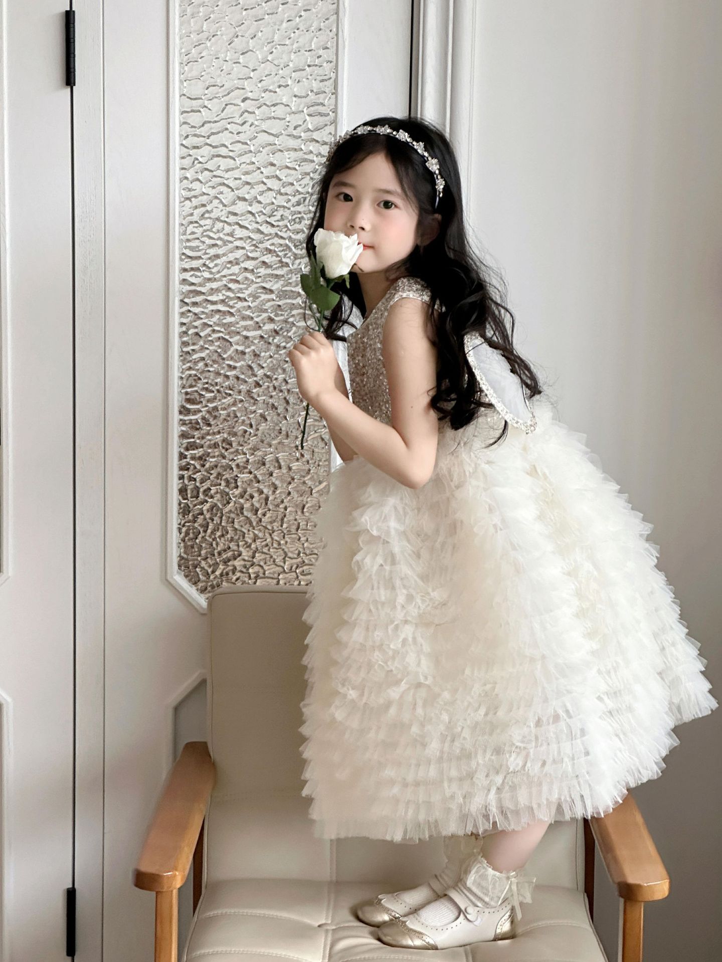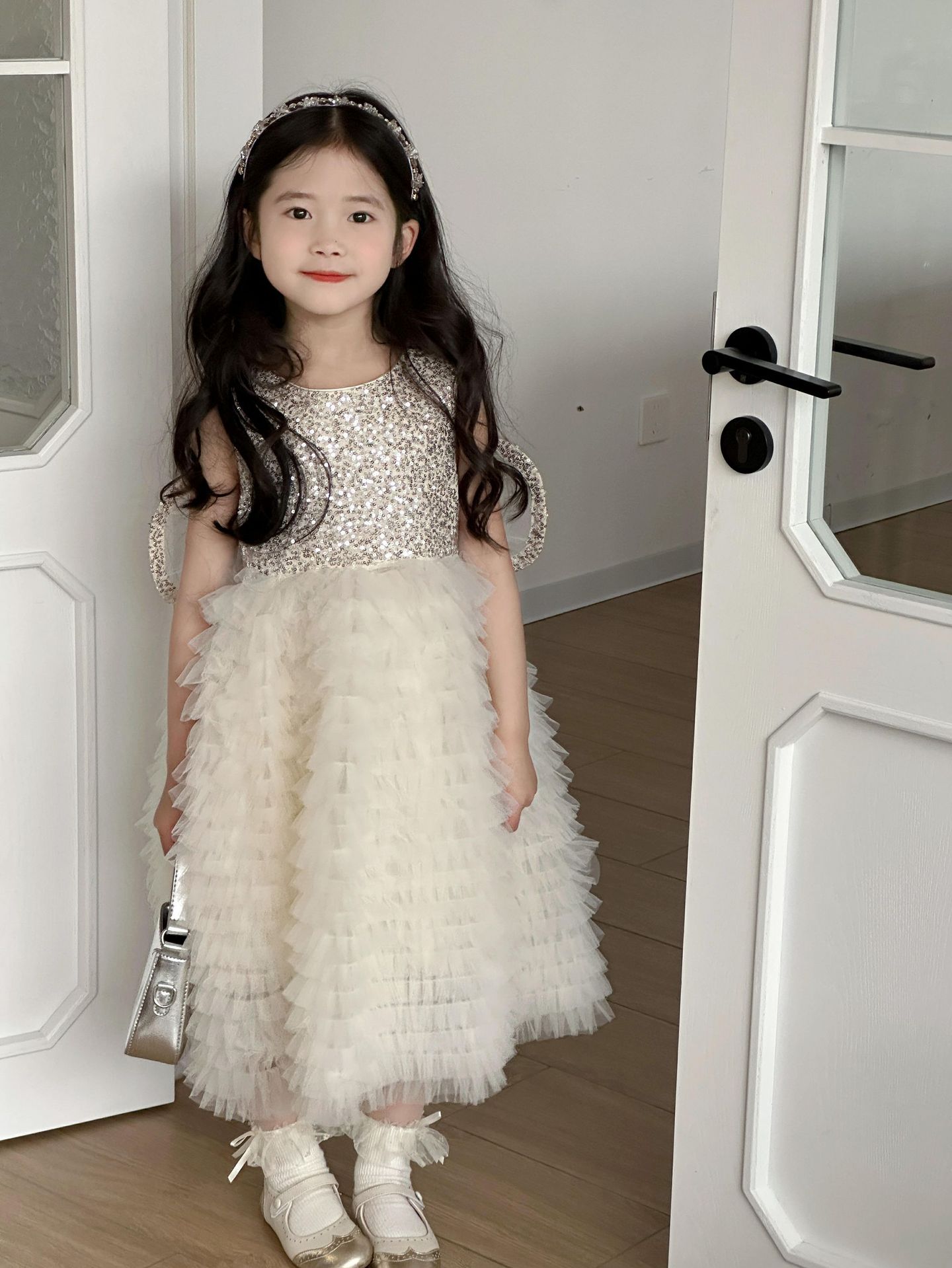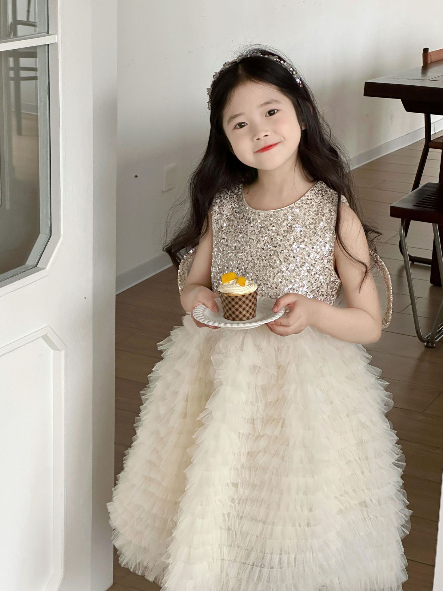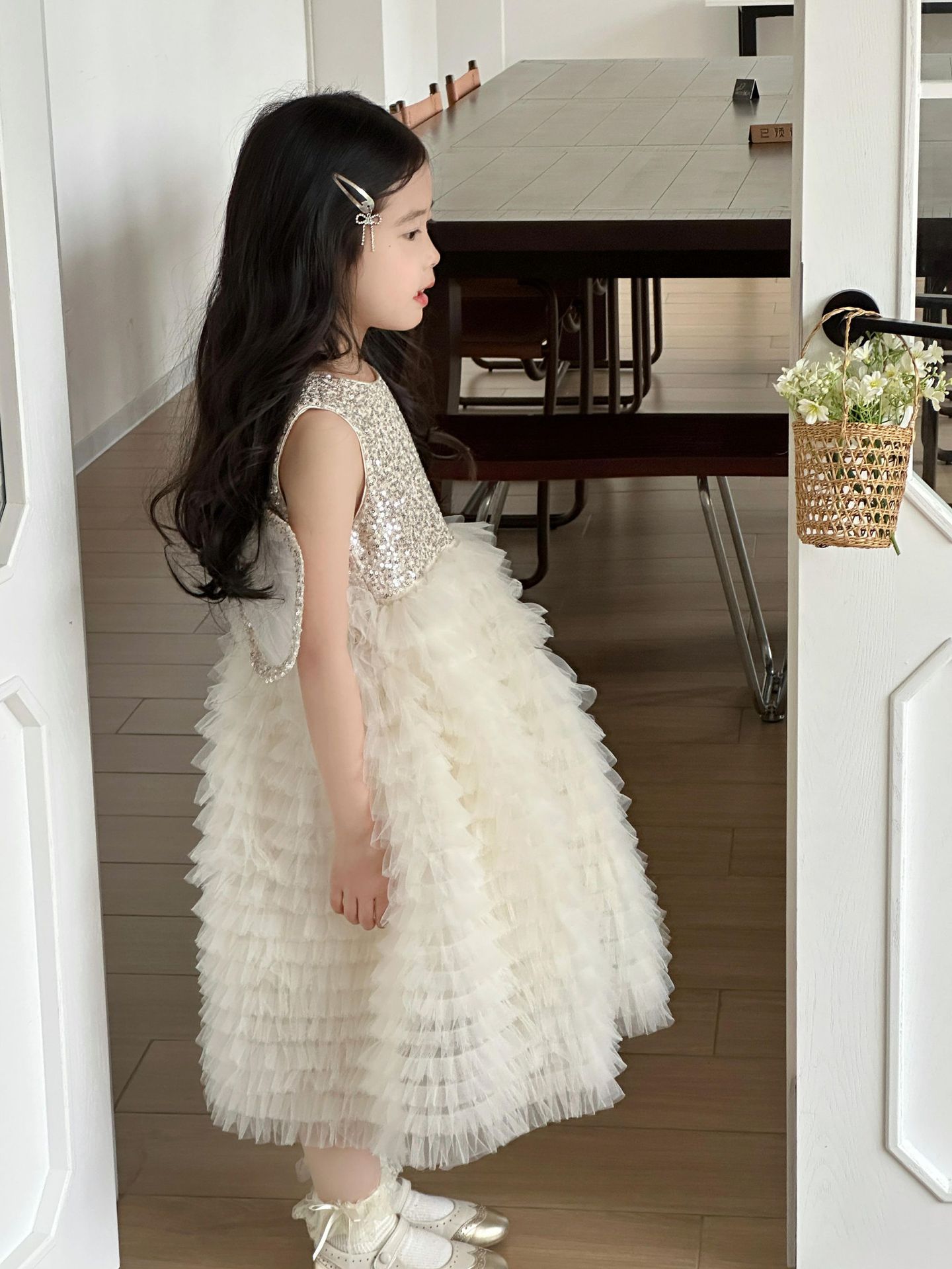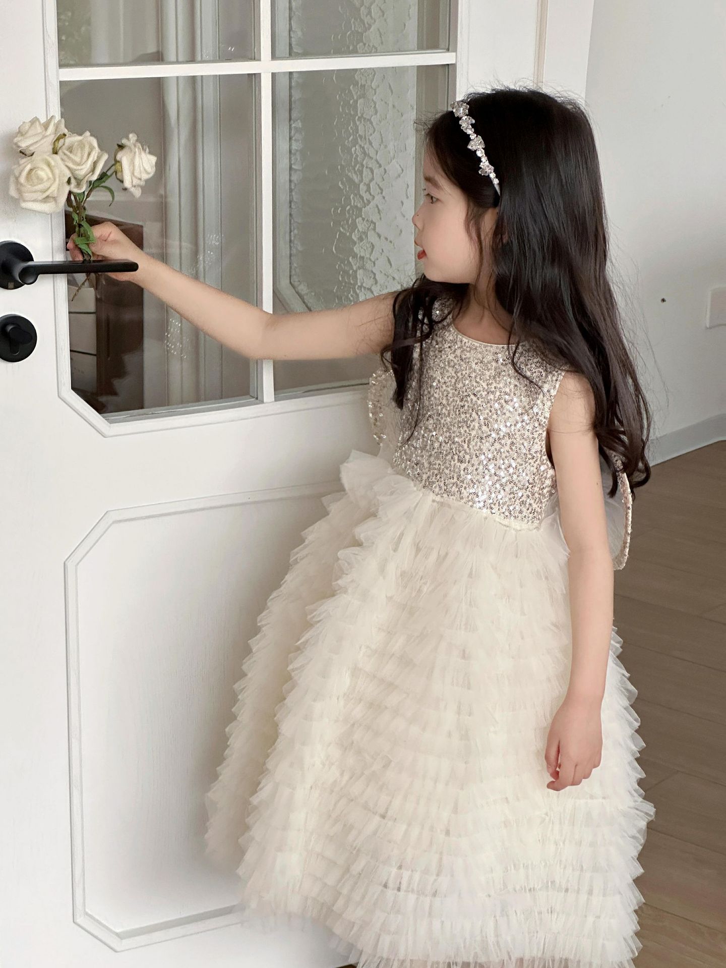 2025 소녀의 원피스 소녀의 구슬 퐁폰 베일 원피스 날개와 함께 어린이 생일 원피스 꽃 소녀의 원피스스토어 가기
