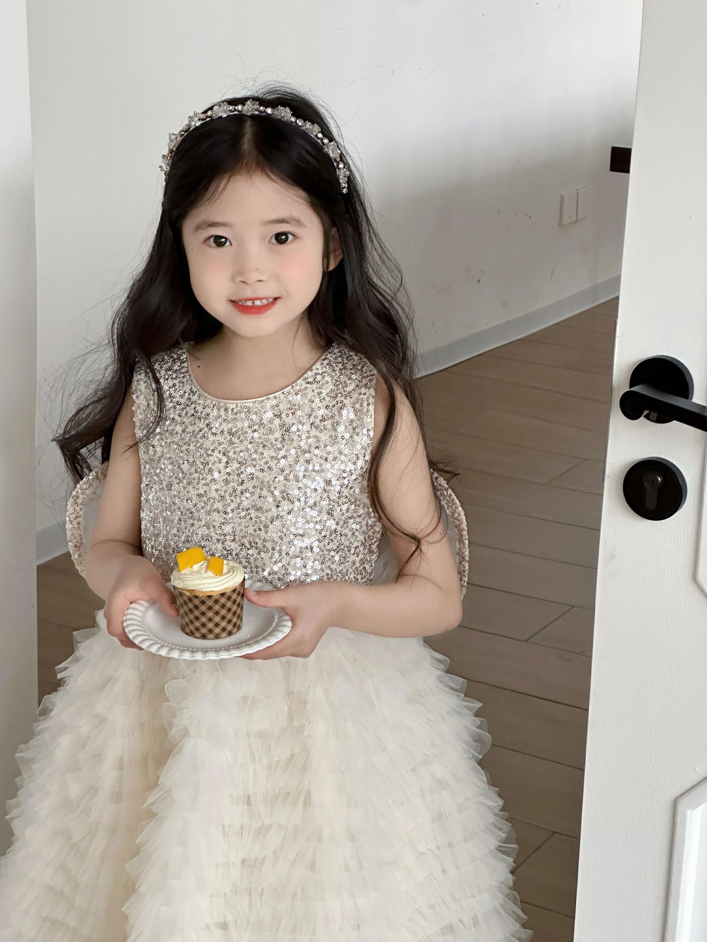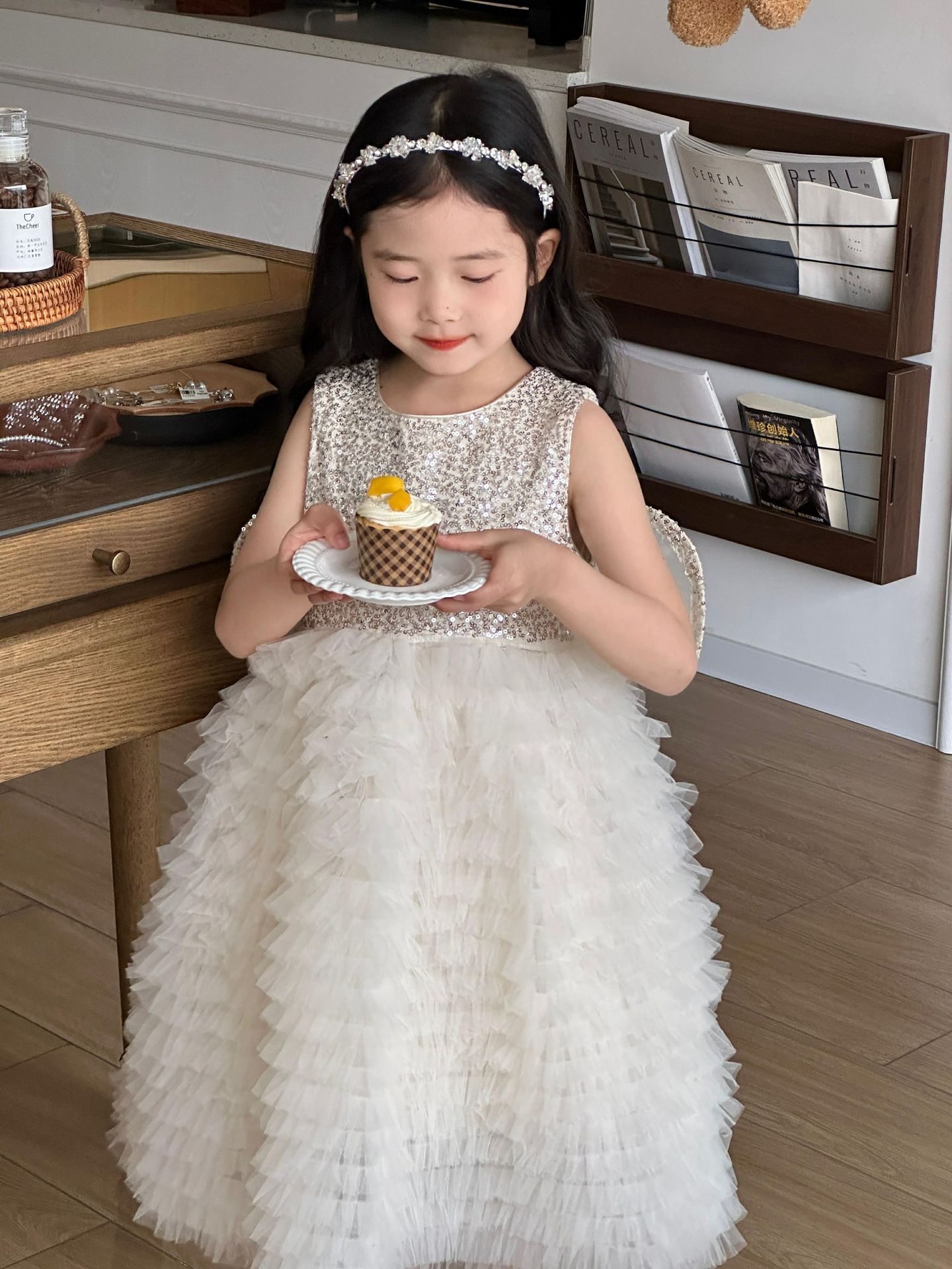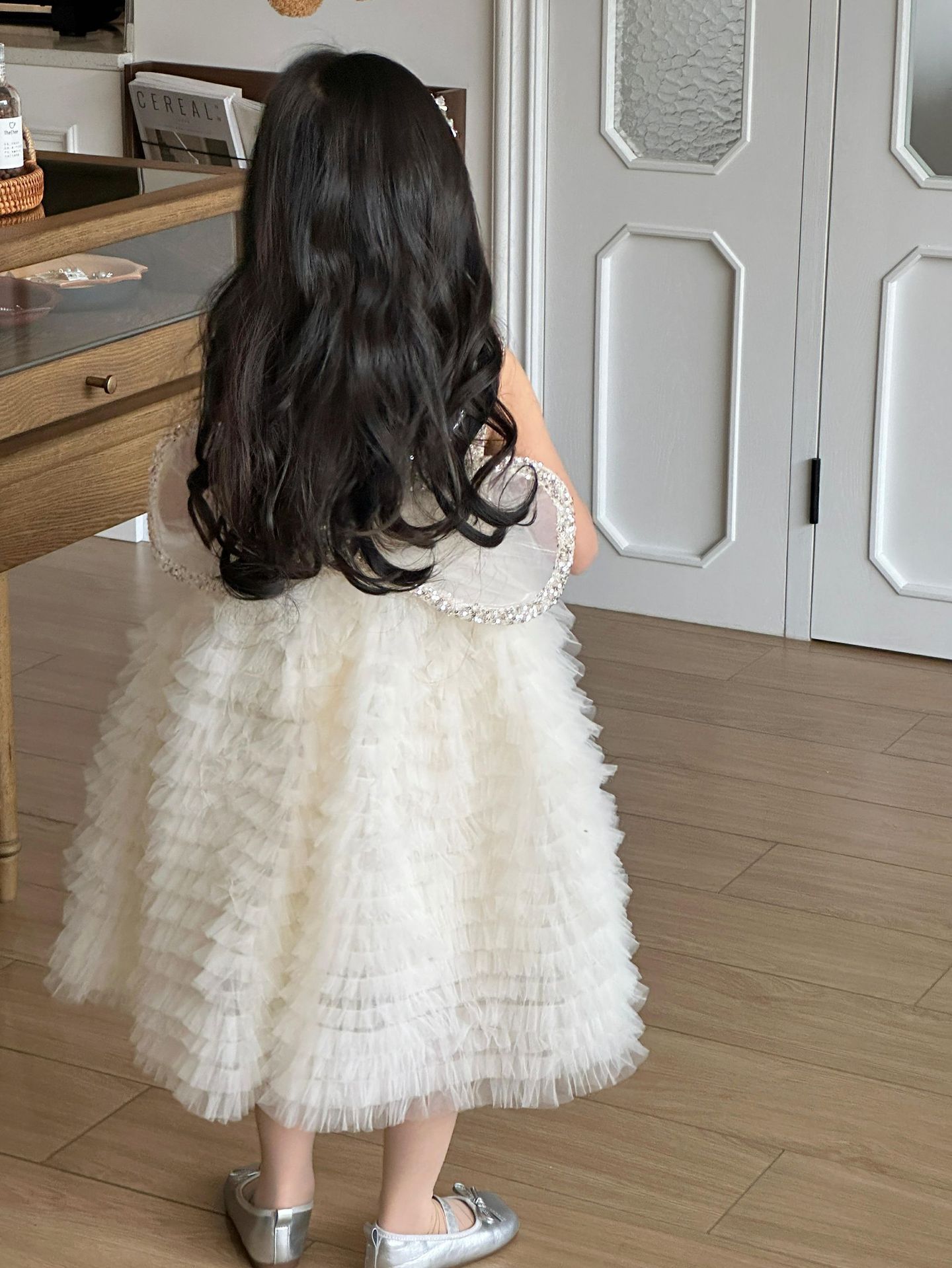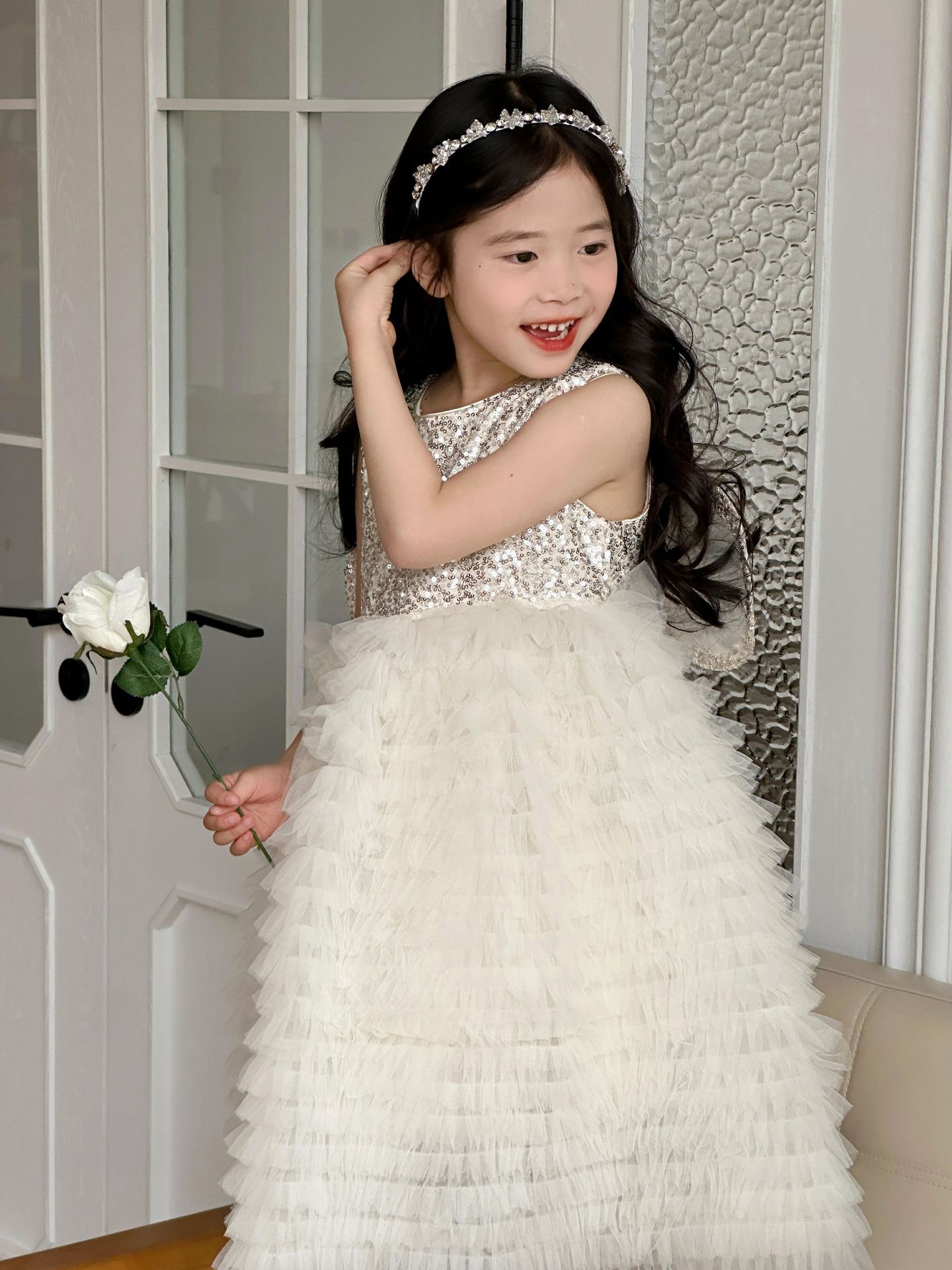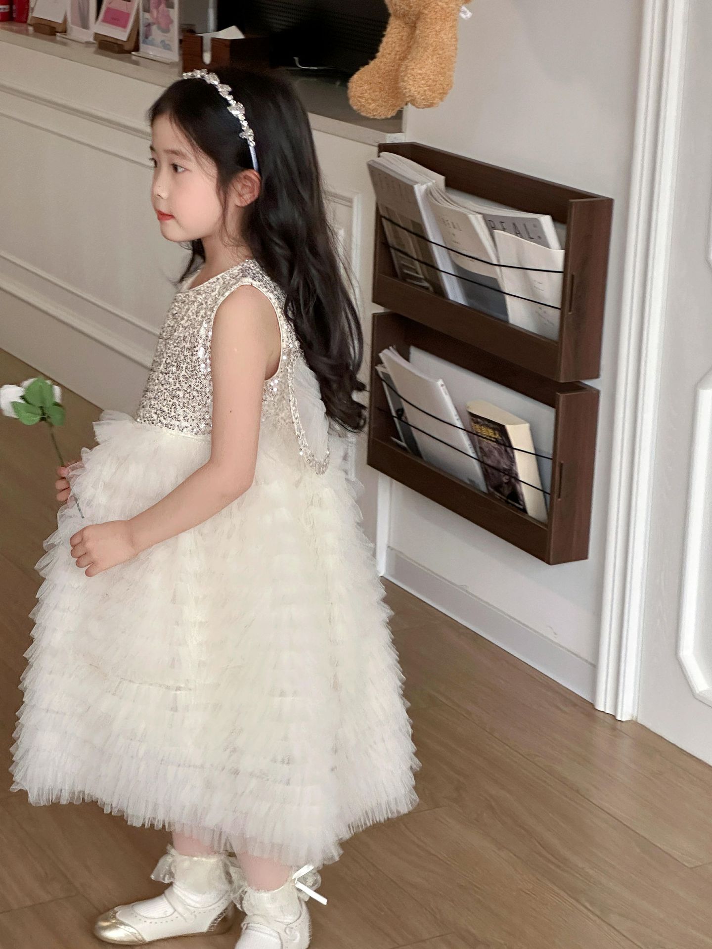 2025 소녀의 원피스 소녀의 구슬 퐁폰 베일 원피스 날개와 함께 어린이 생일 원피스 꽃 소녀의 원피스스토어 가기