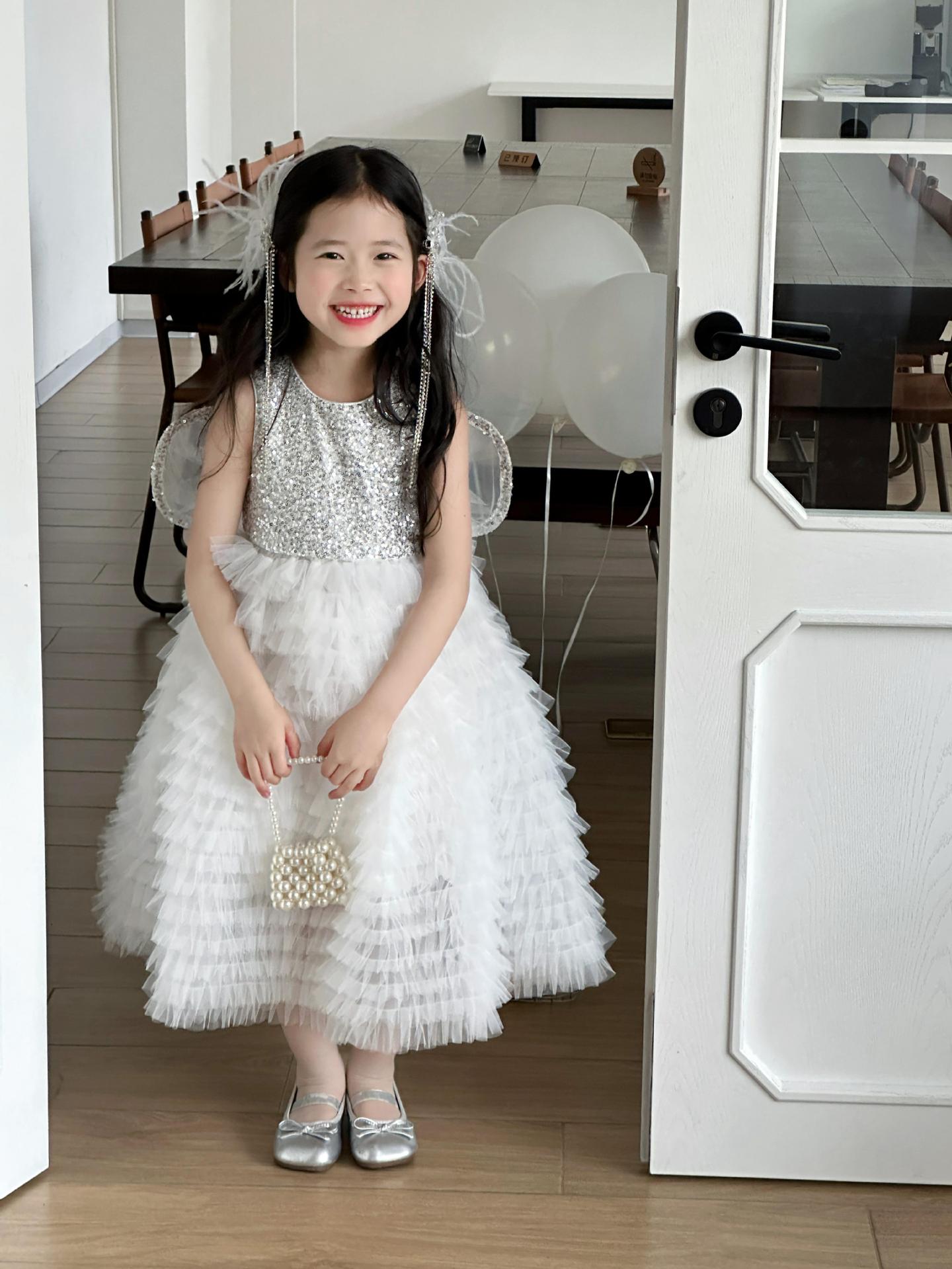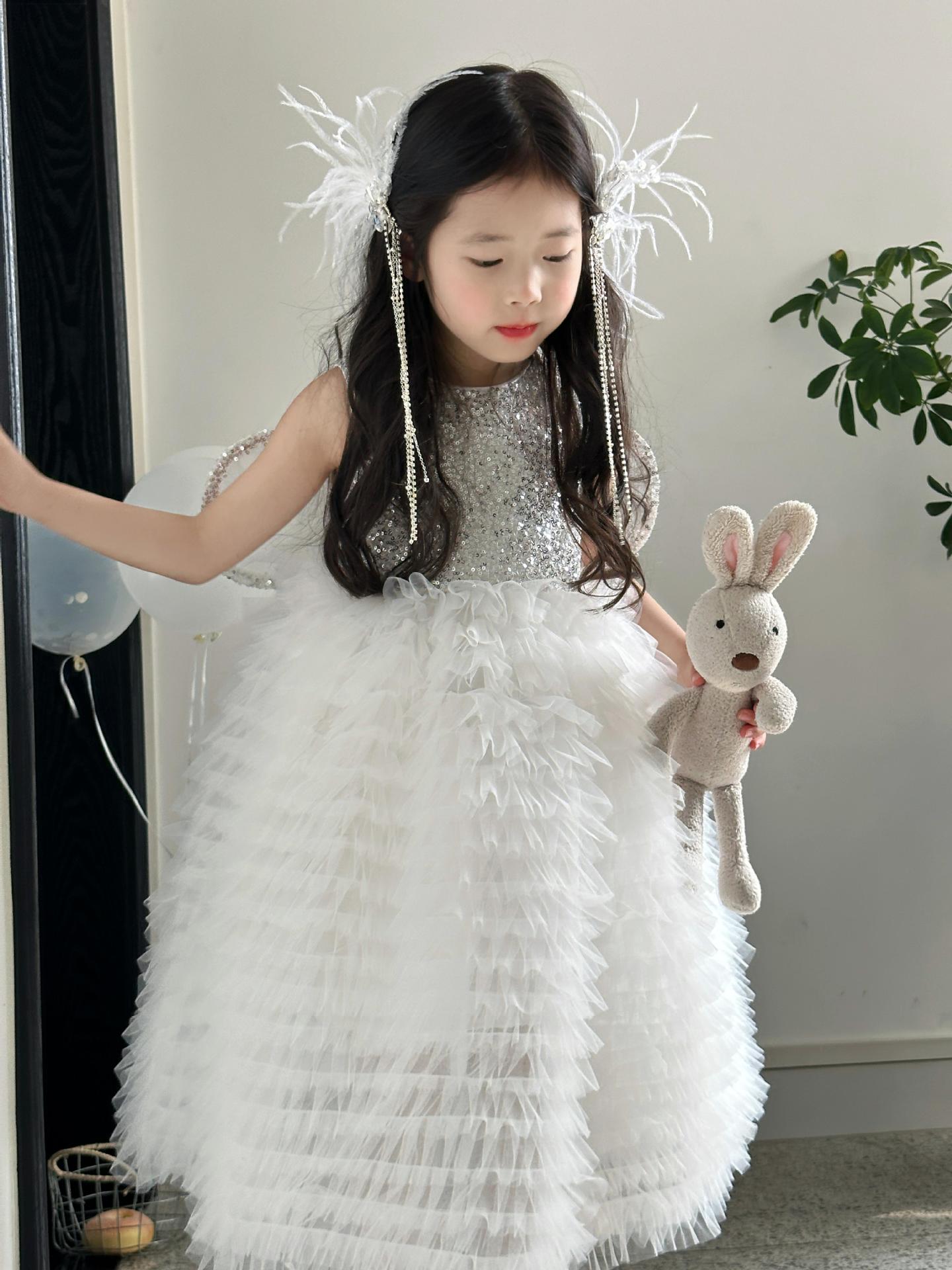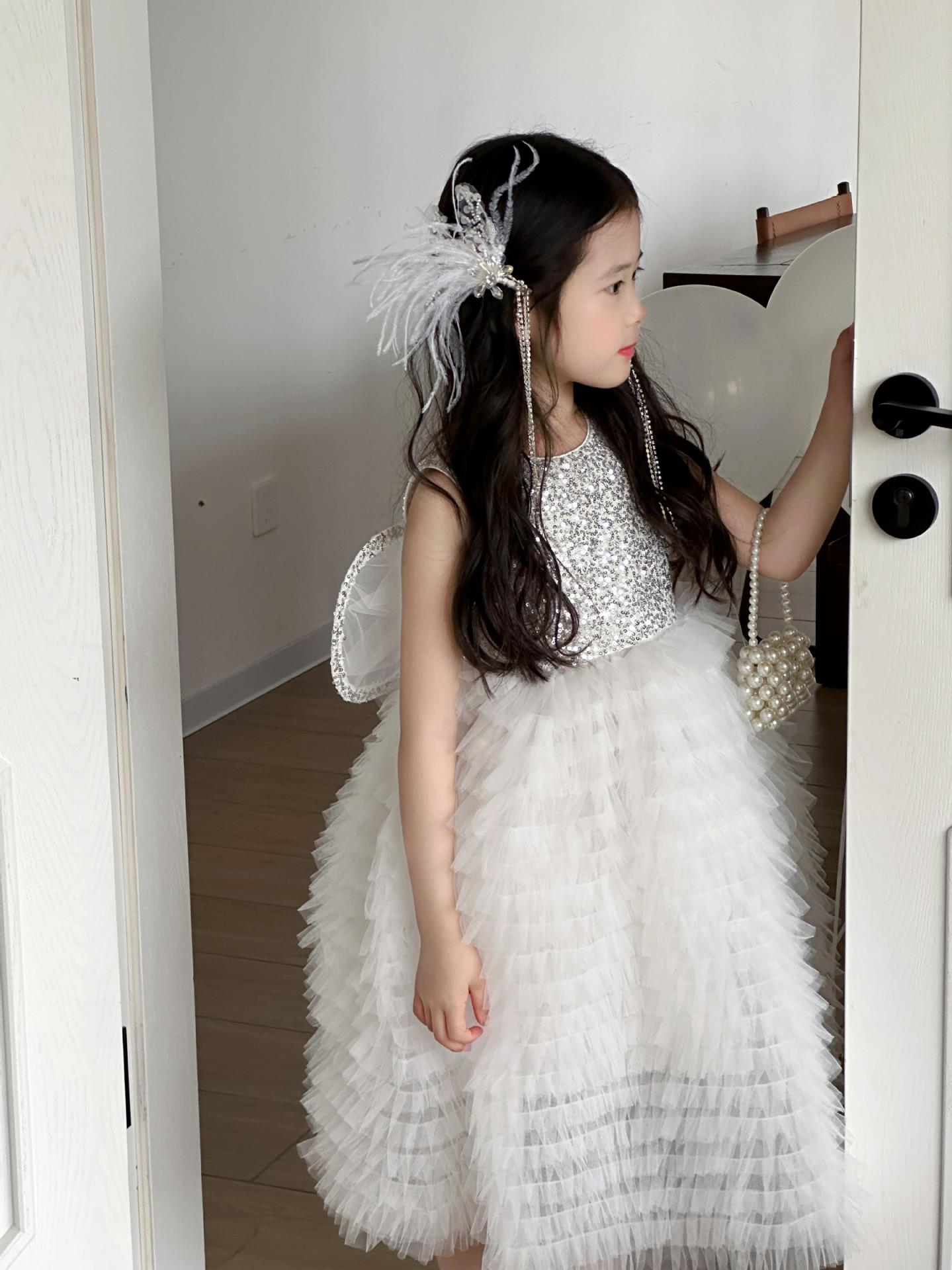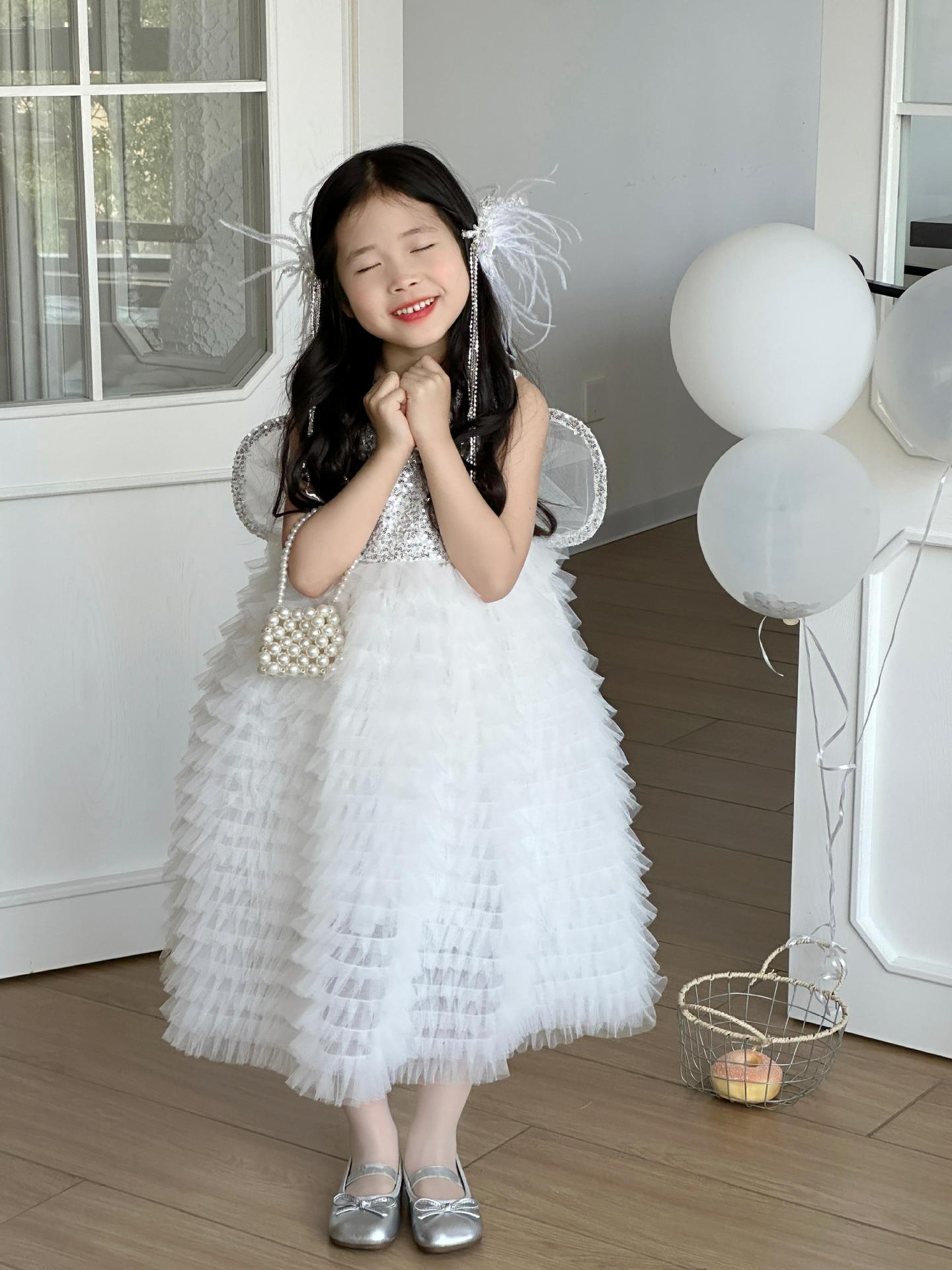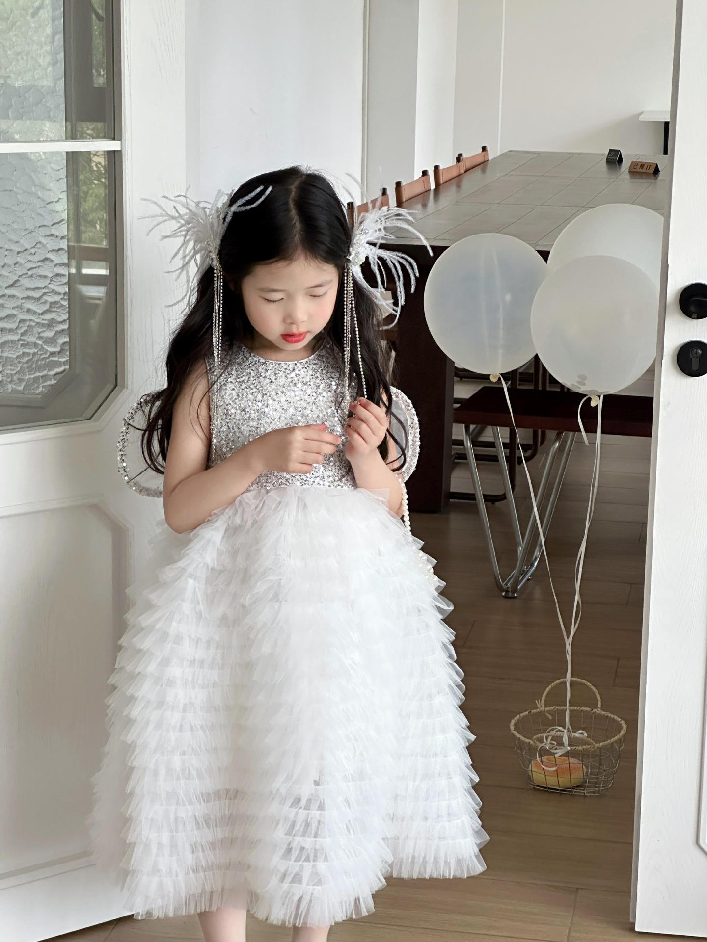 2025 소녀의 원피스 소녀의 구슬 퐁폰 베일 원피스 날개와 함께 어린이 생일 원피스 꽃 소녀의 원피스