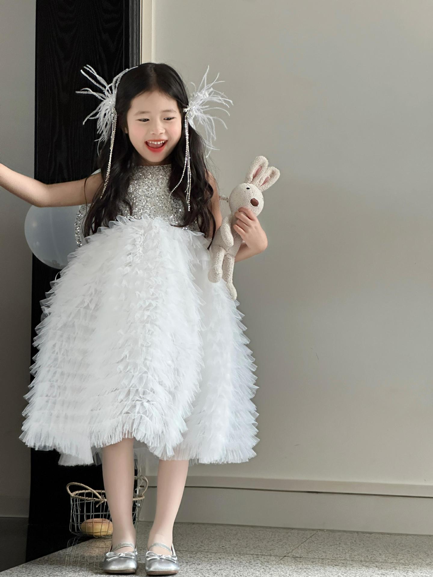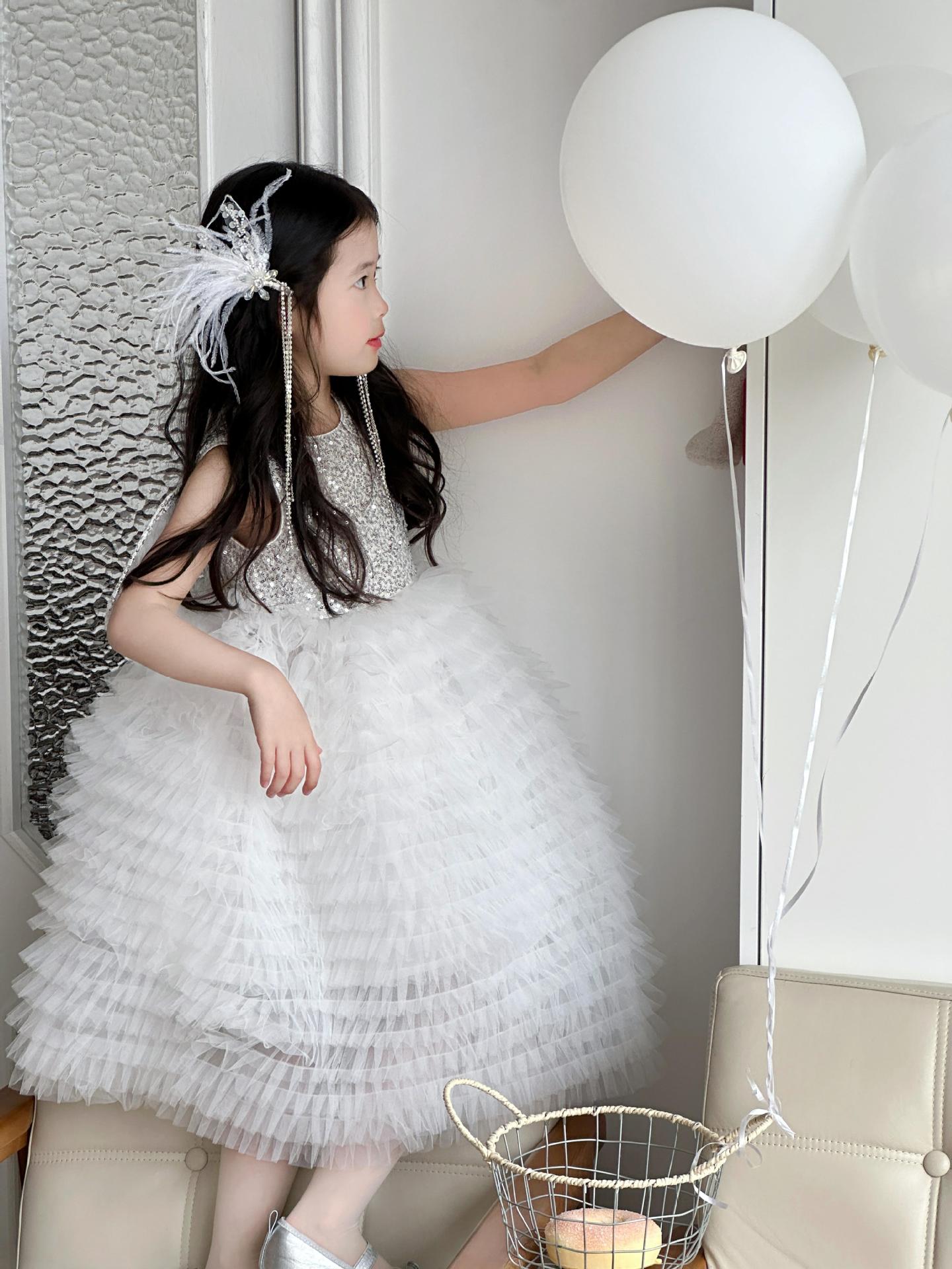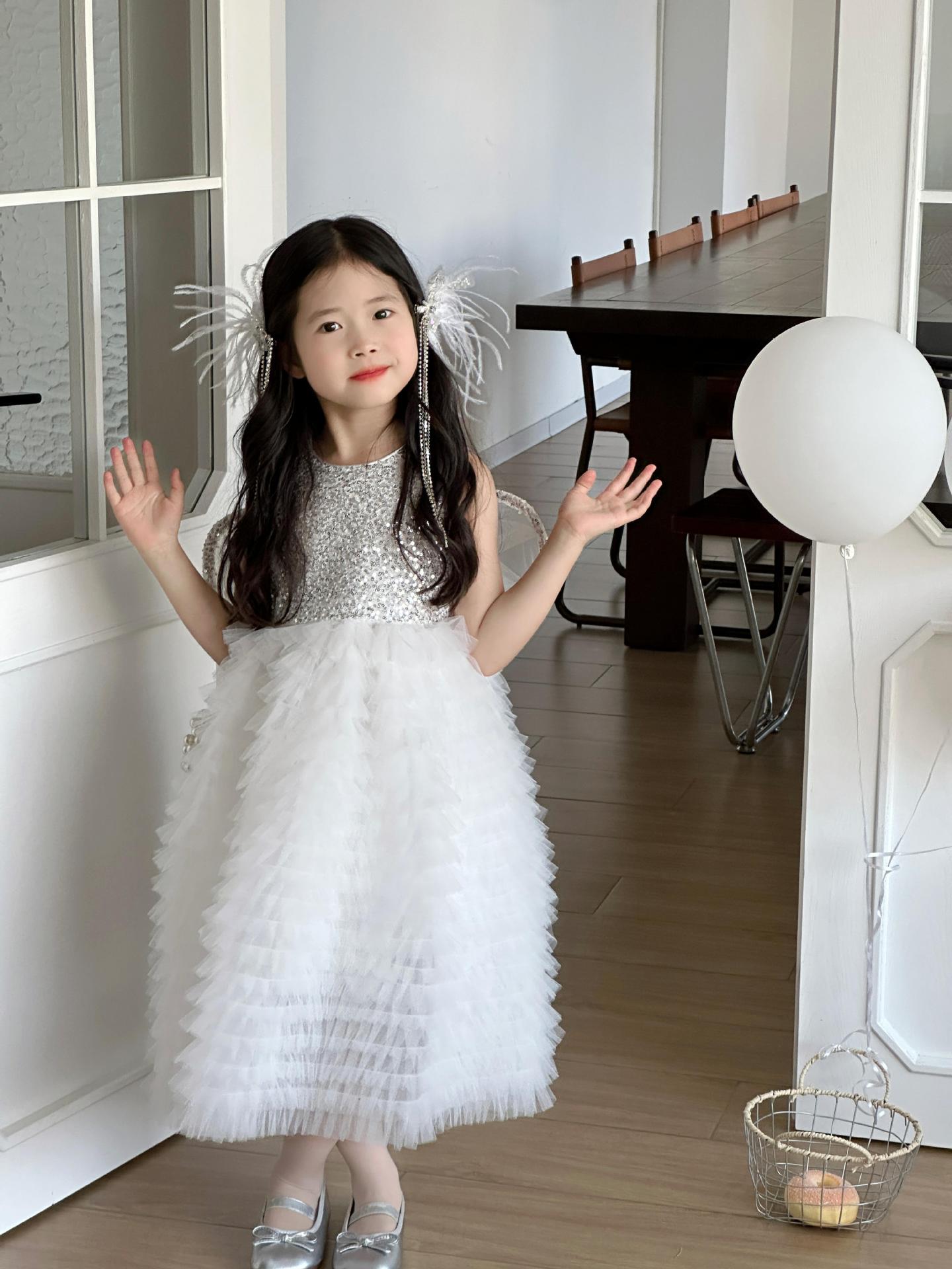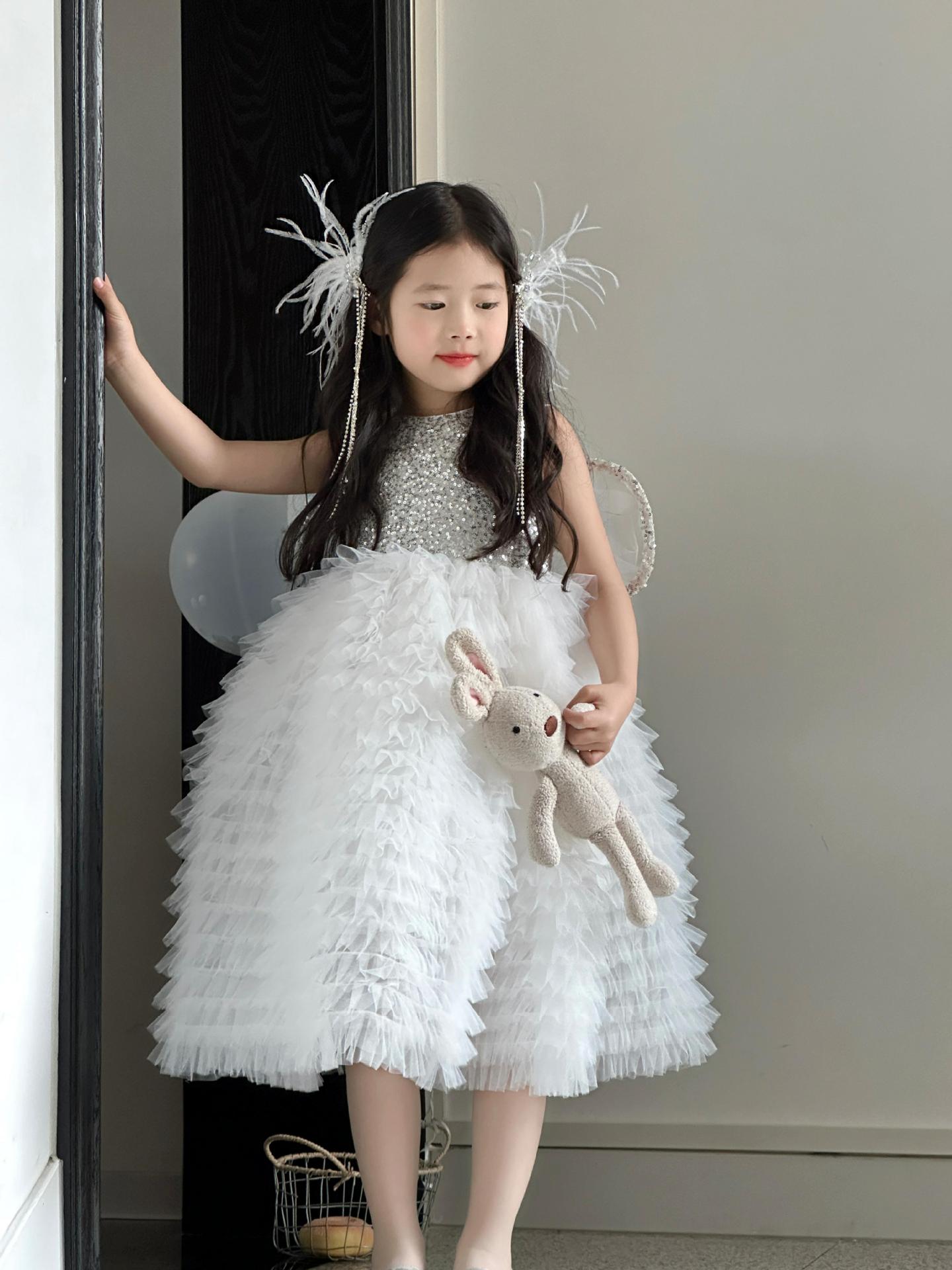 2025 소녀의 원피스 소녀의 구슬 퐁폰 베일 원피스 날개와 함께 어린이 생일 원피스 꽃 소녀의 원피스