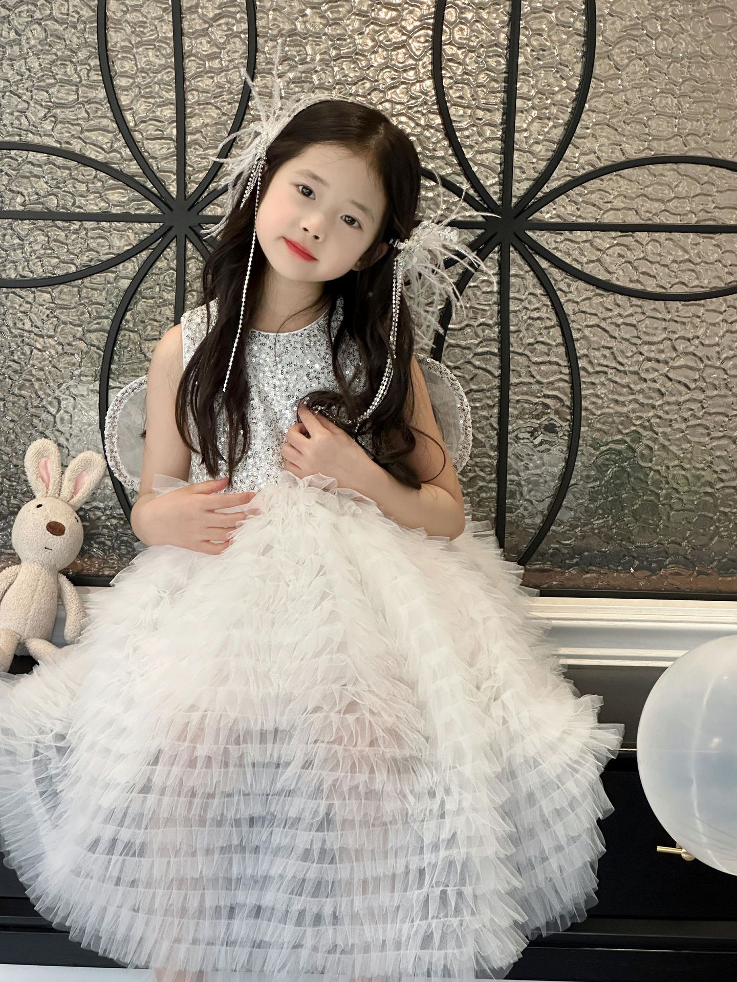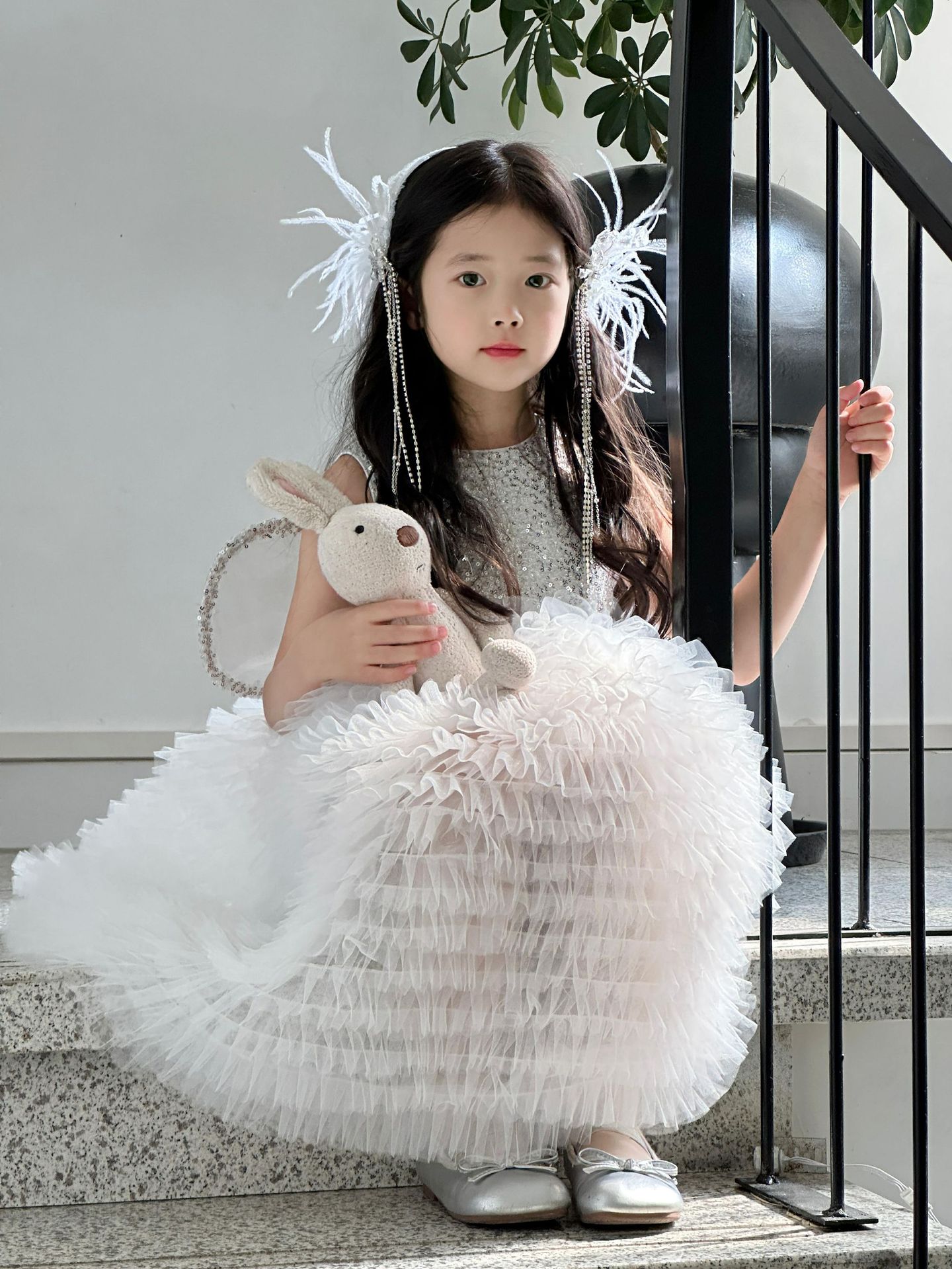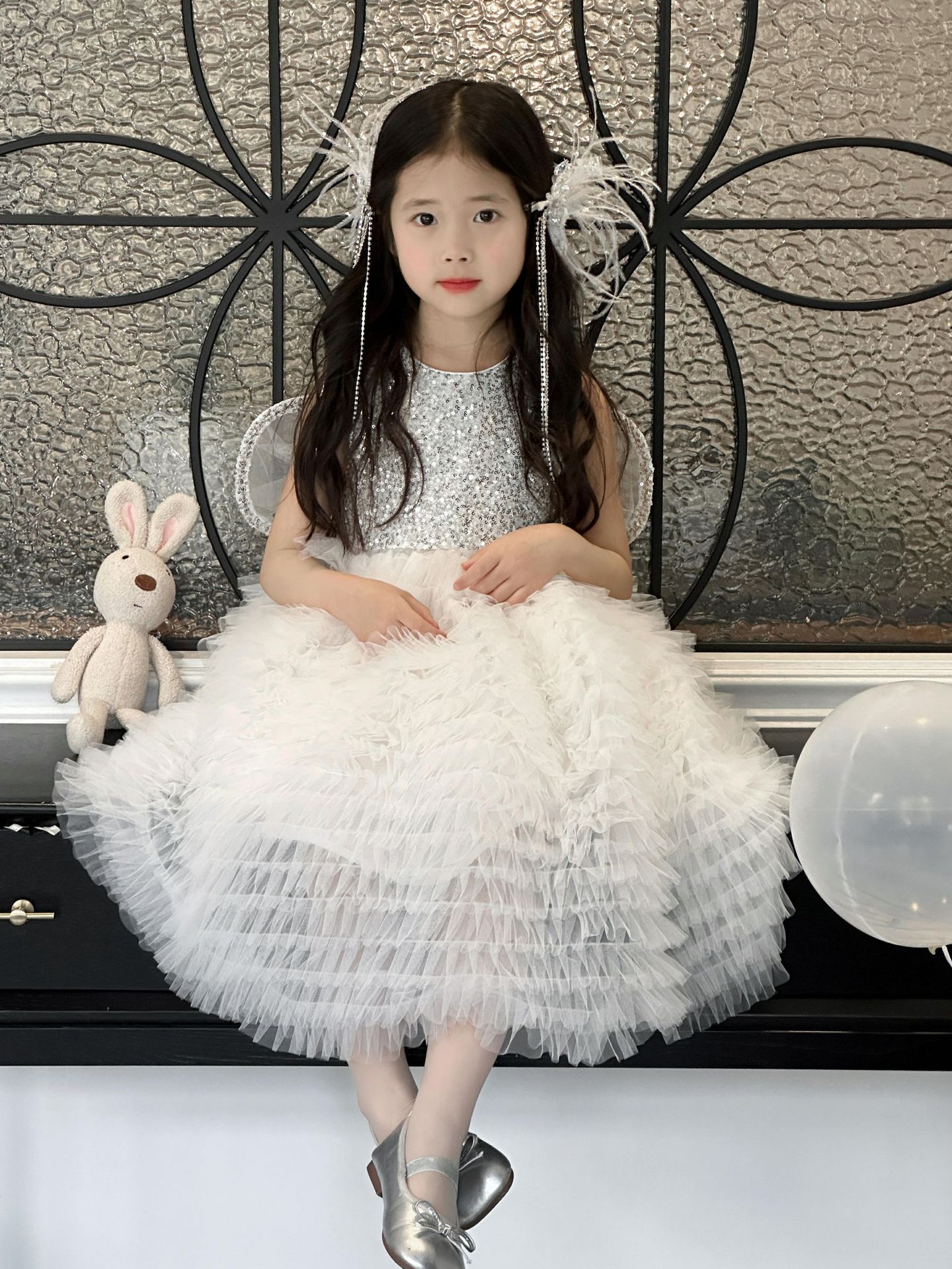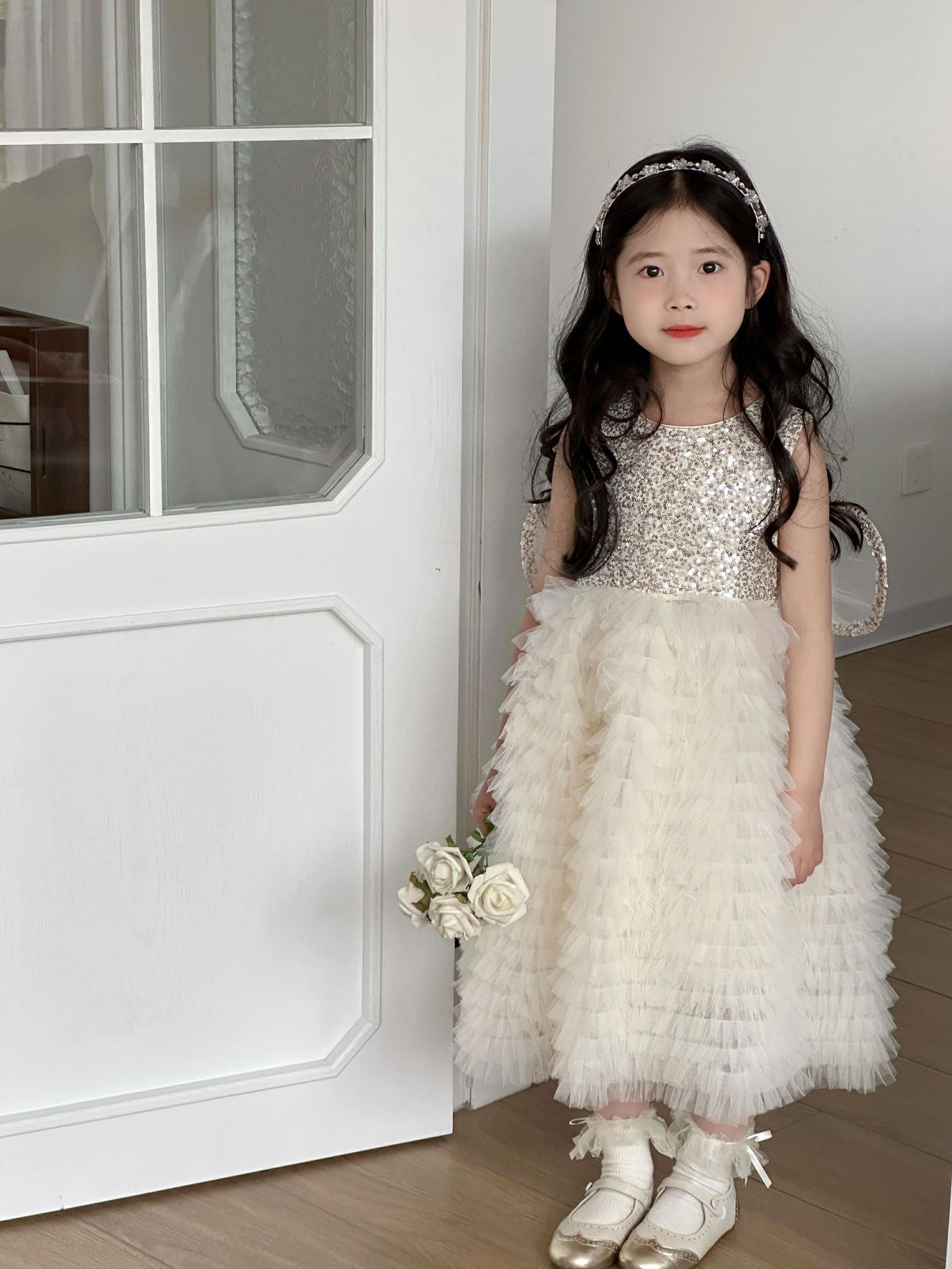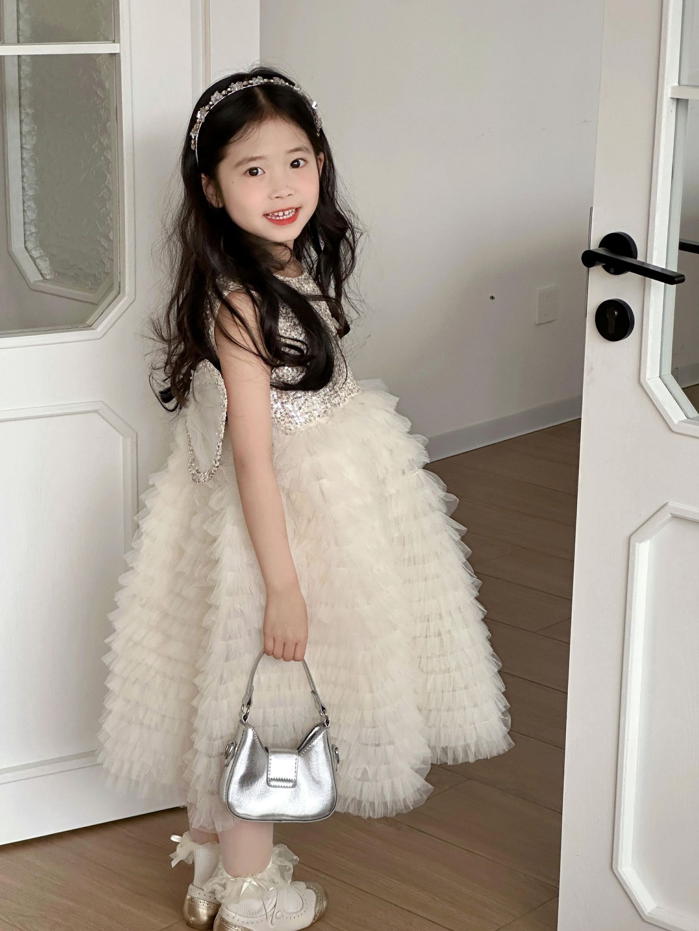2025 소녀의 원피스 소녀의 구슬 퐁폰 베일 원피스 날개와 함께 어린이 생일 원피스 꽃 소녀의 원피스