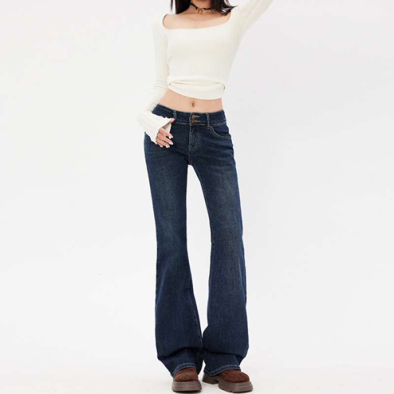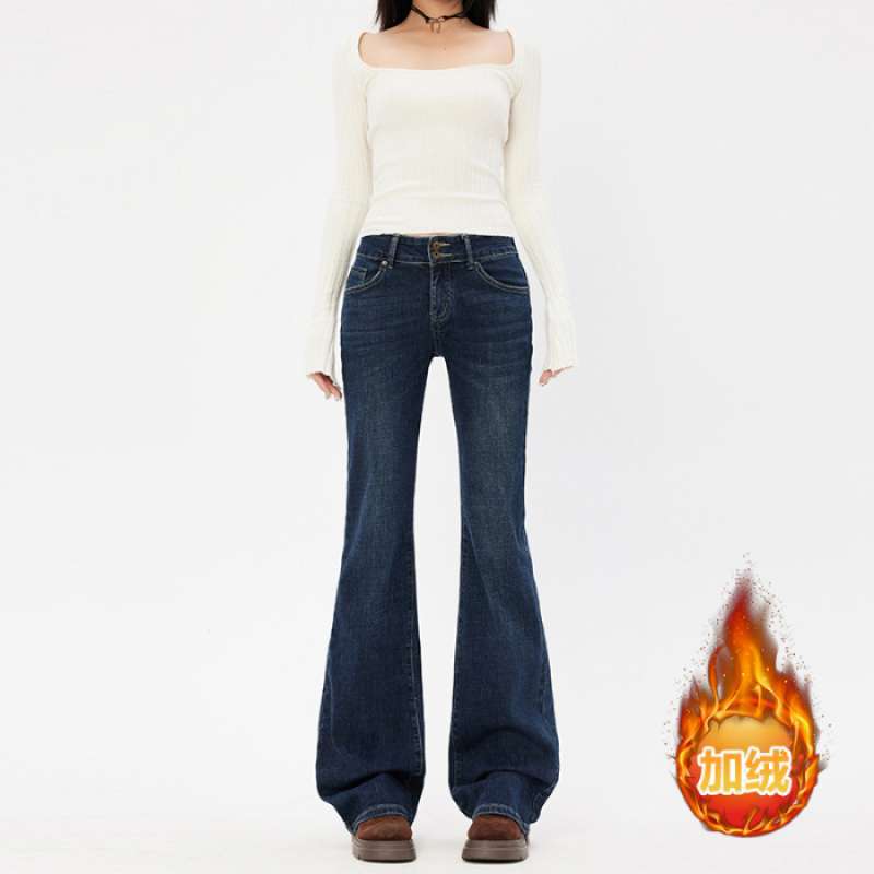 무료 배송 기모 아메리칸 스타일 레트로 핫 소녀 낮은 허리 슬립 바닥 청바지 여성용 플레어 바지 작은 긴 머리