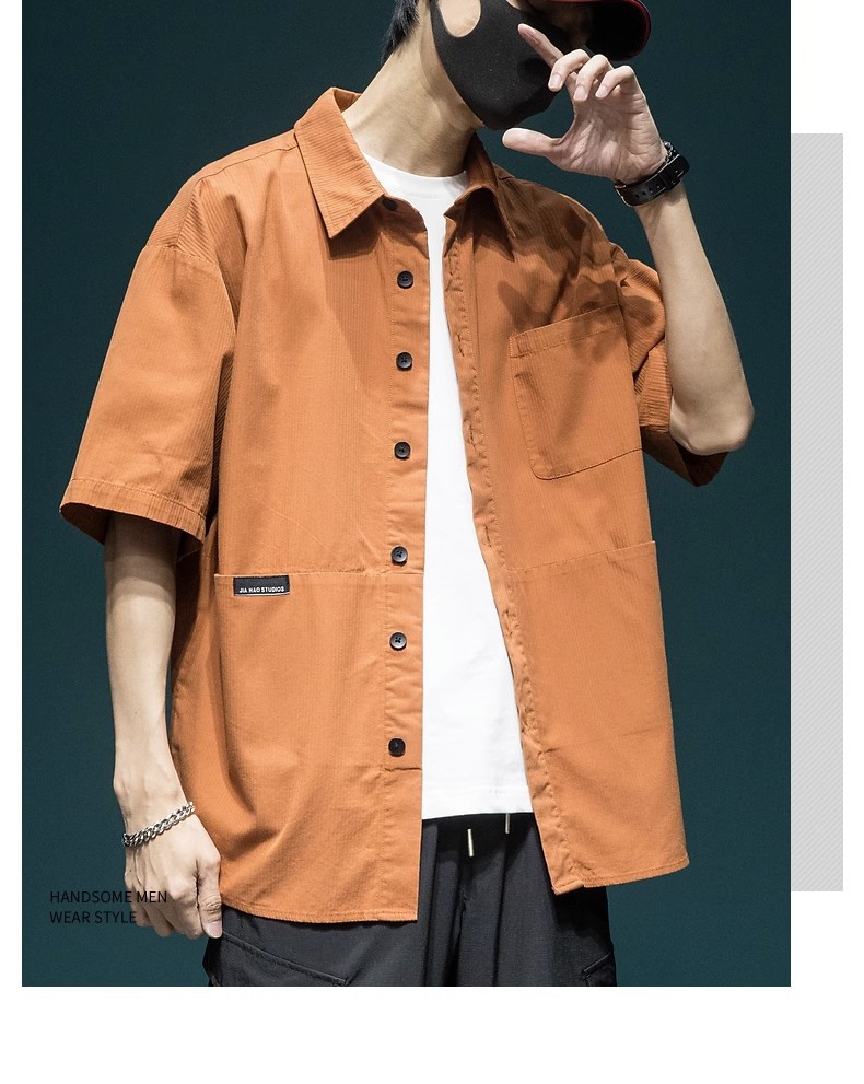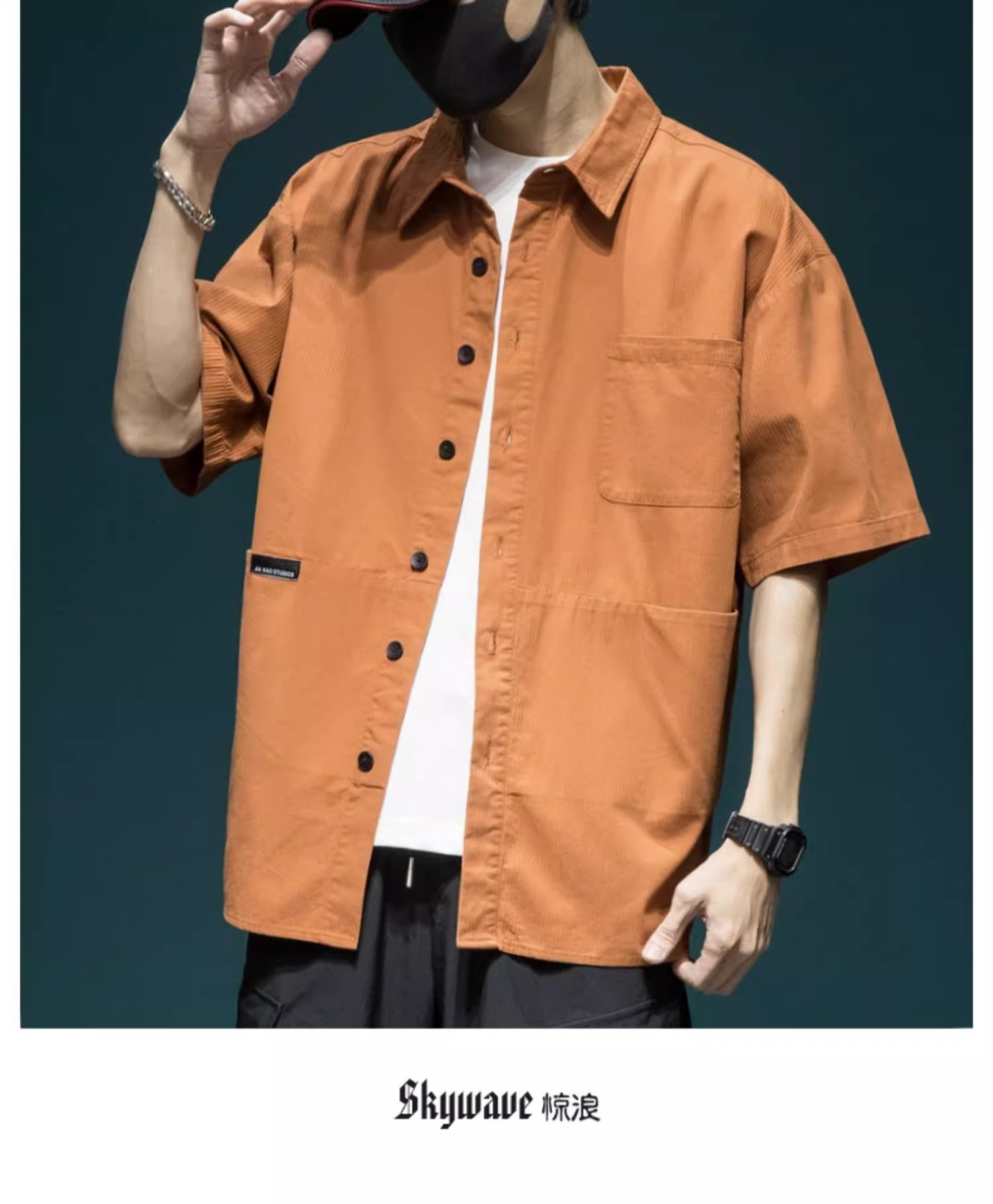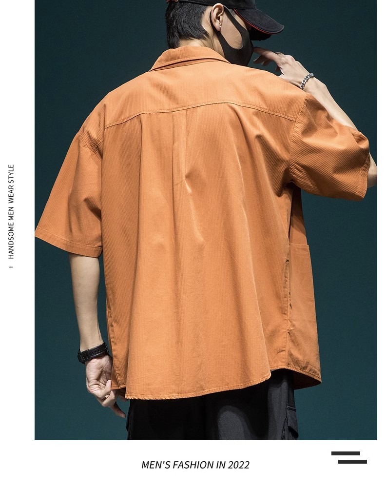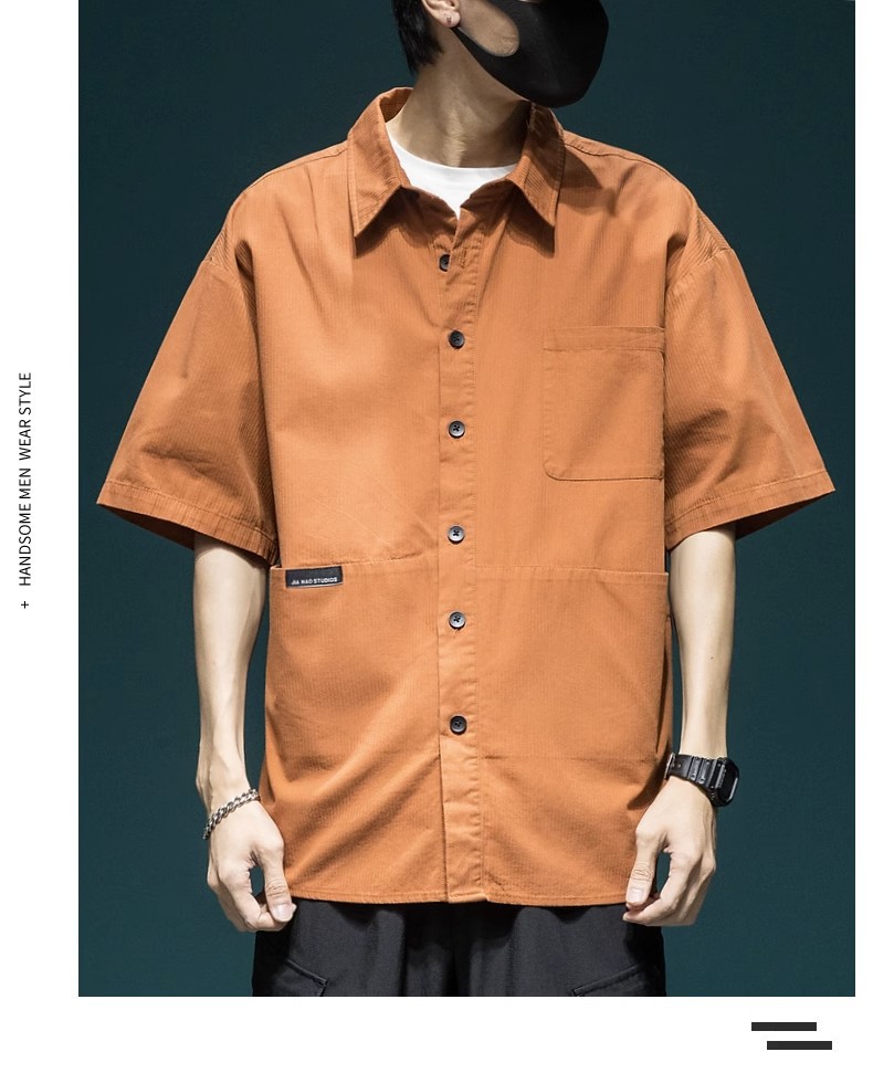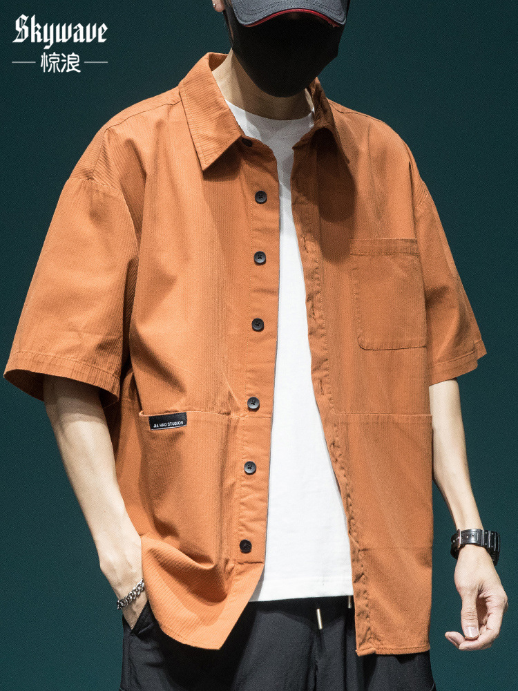 고급 오렌지 일본식 반팔 셔츠 남성용 여름 새 느슨한 플러스 사이즈 작업복 셔츠 푹신한 핸섬 옷깃 탑