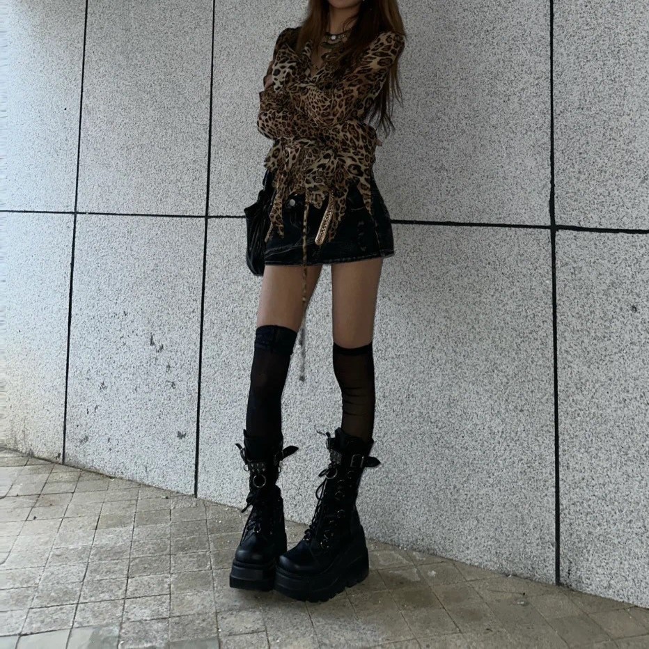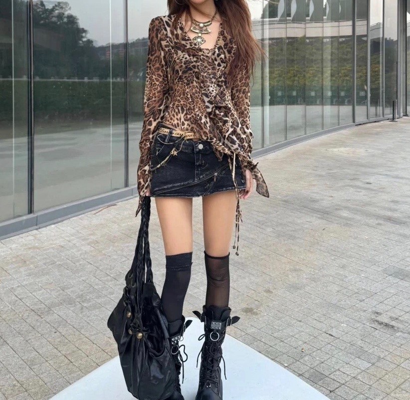 Y2K 아메리칸 스타일 레트로 스트리트 스파이스 소녀 탑 레오파드 무늬 V-넥 롱 슬리브 쉬폰 셔츠 슬림-핏 틈새 디자인 인 셔츠스토어 가기