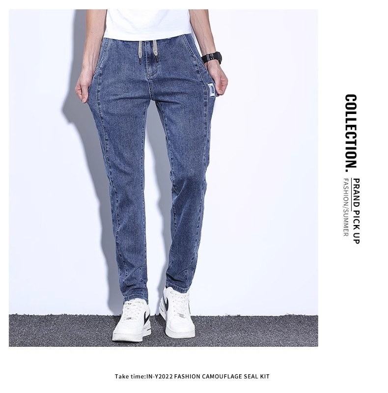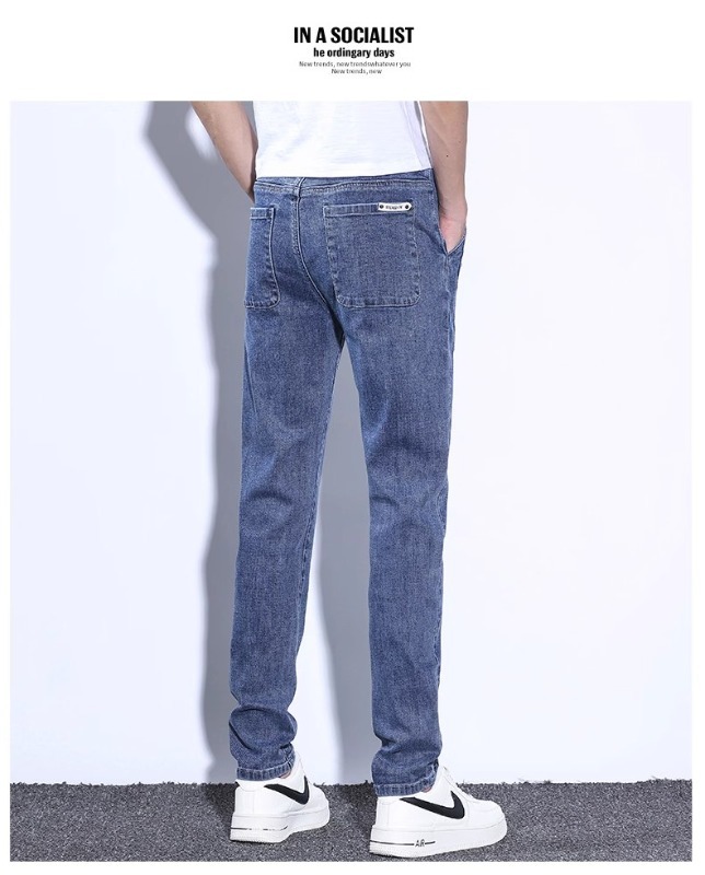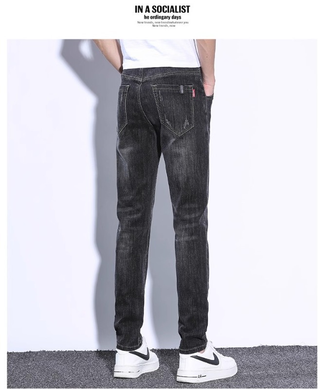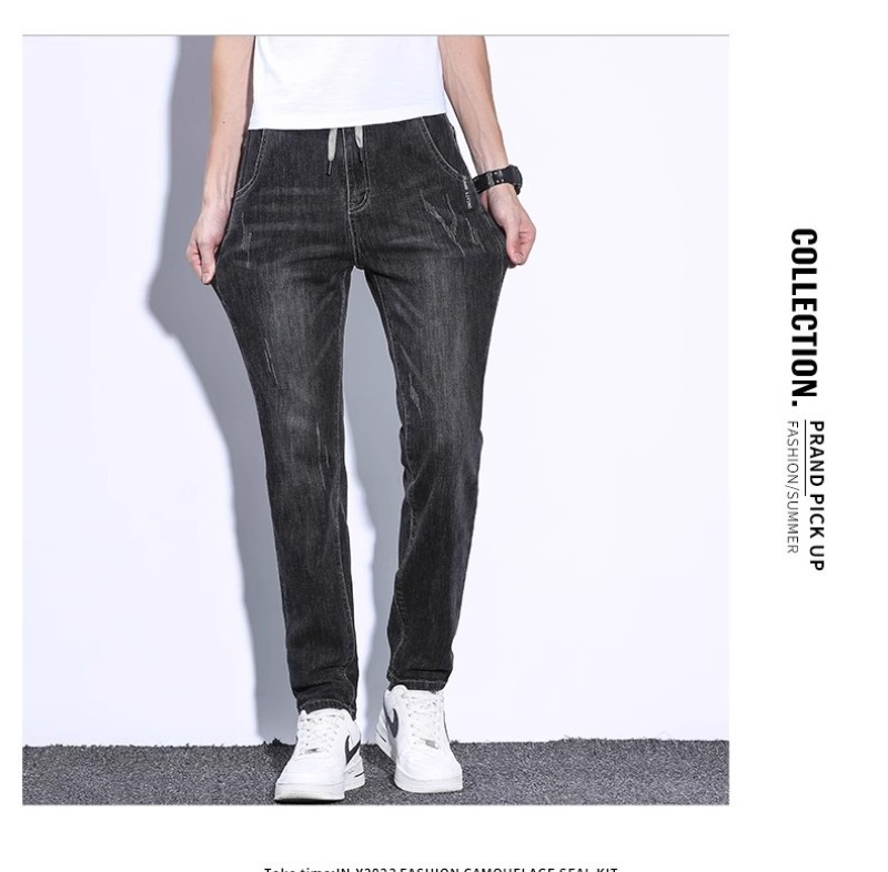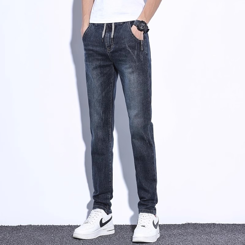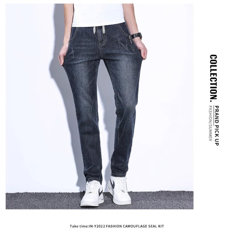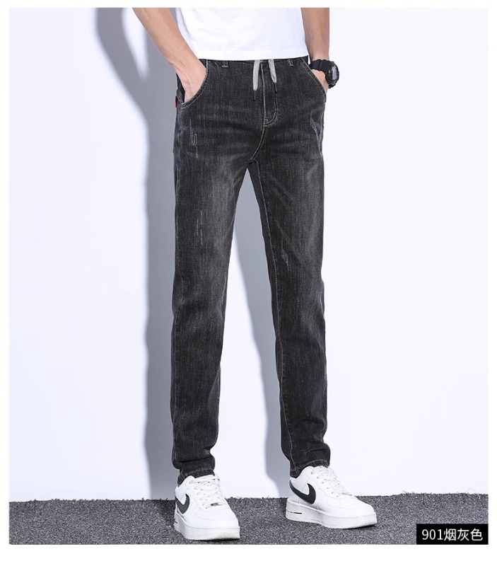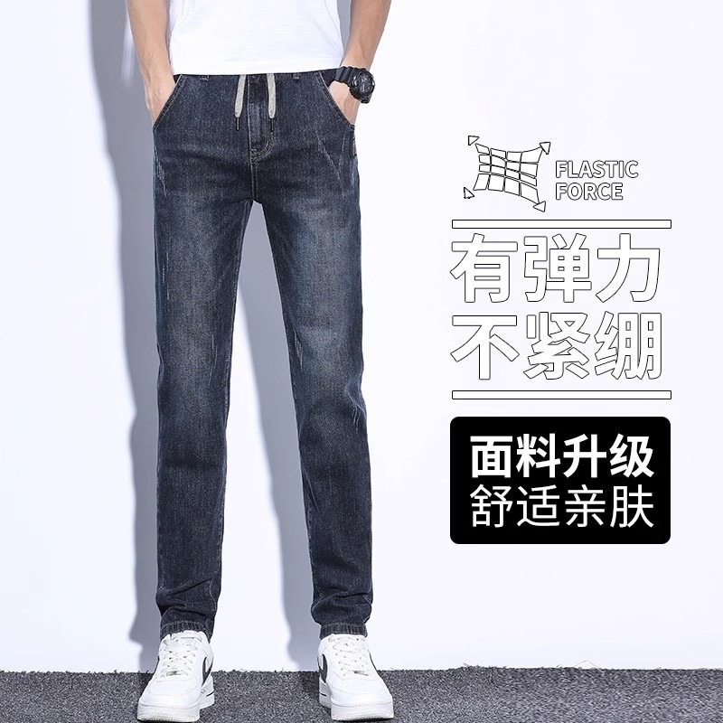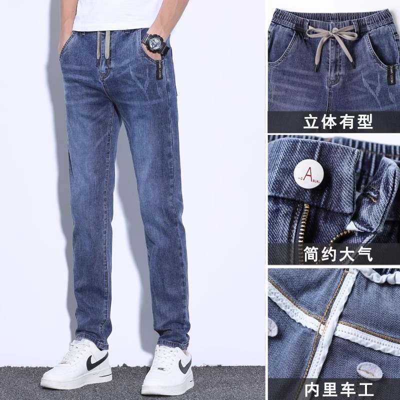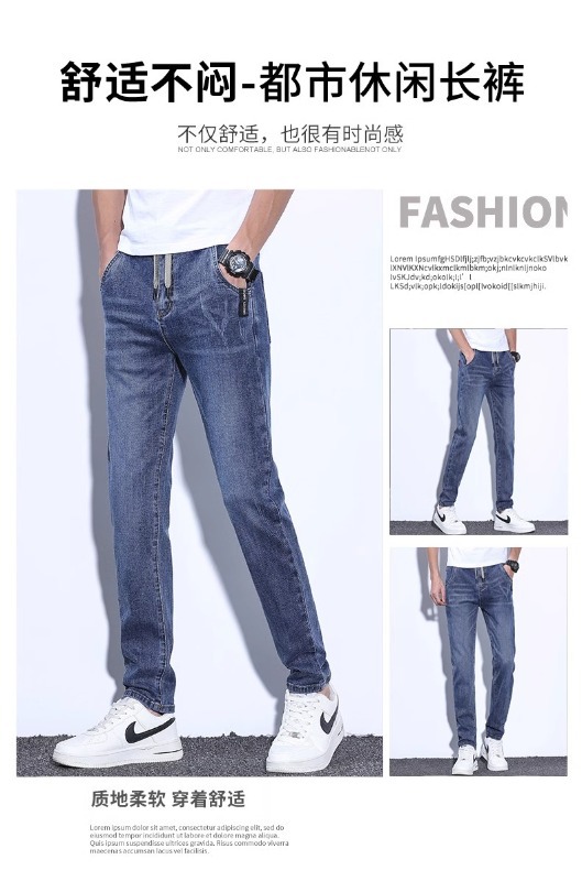 청바지 남성용 캐주얼 슬림 핏 작은 발 탄성 티더 봄과 가을 새로운 높은 텍스트 청바지 탄성 허리 바지스토어 가기