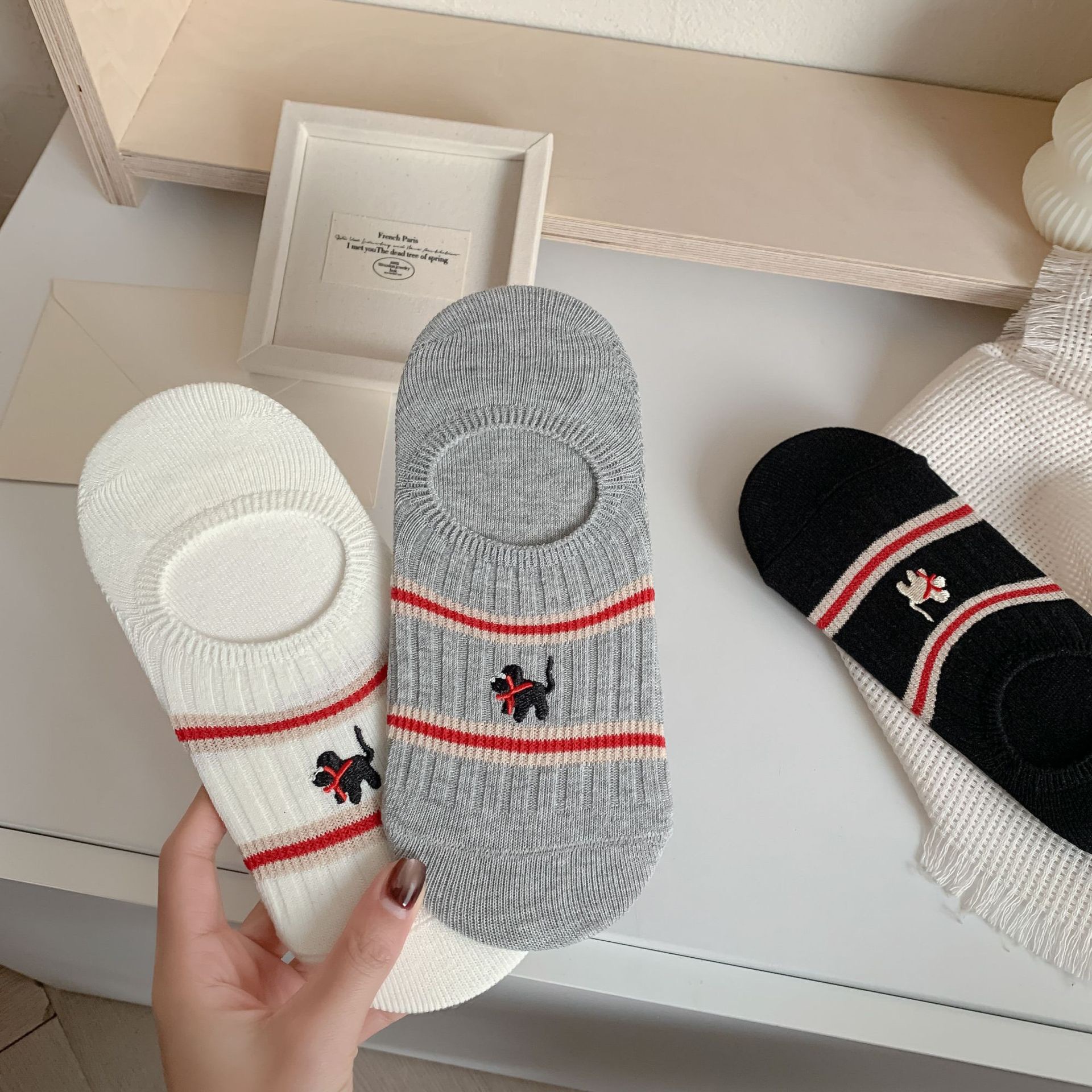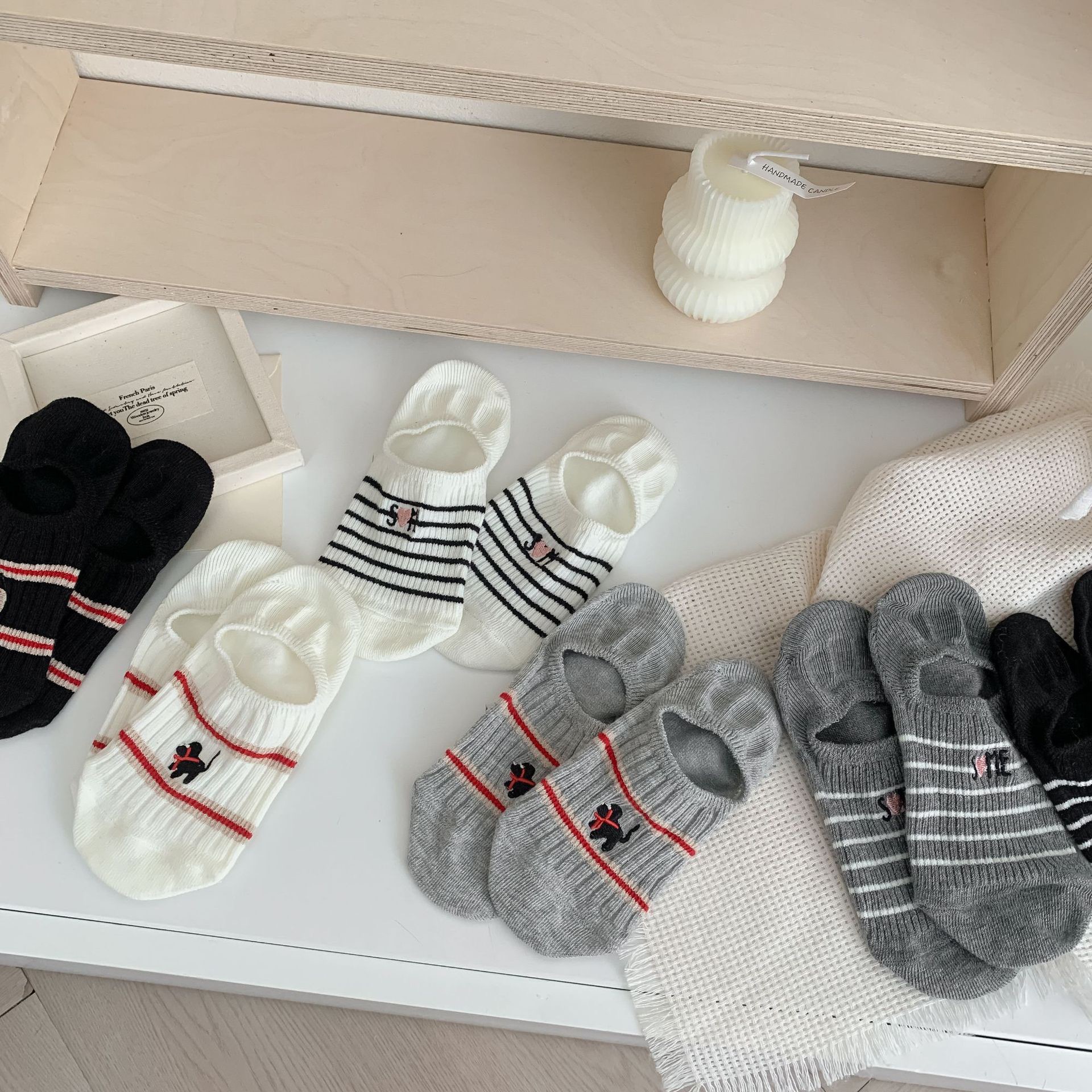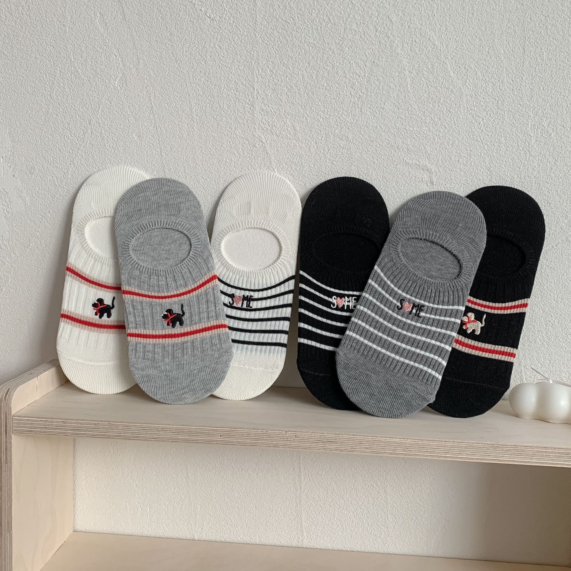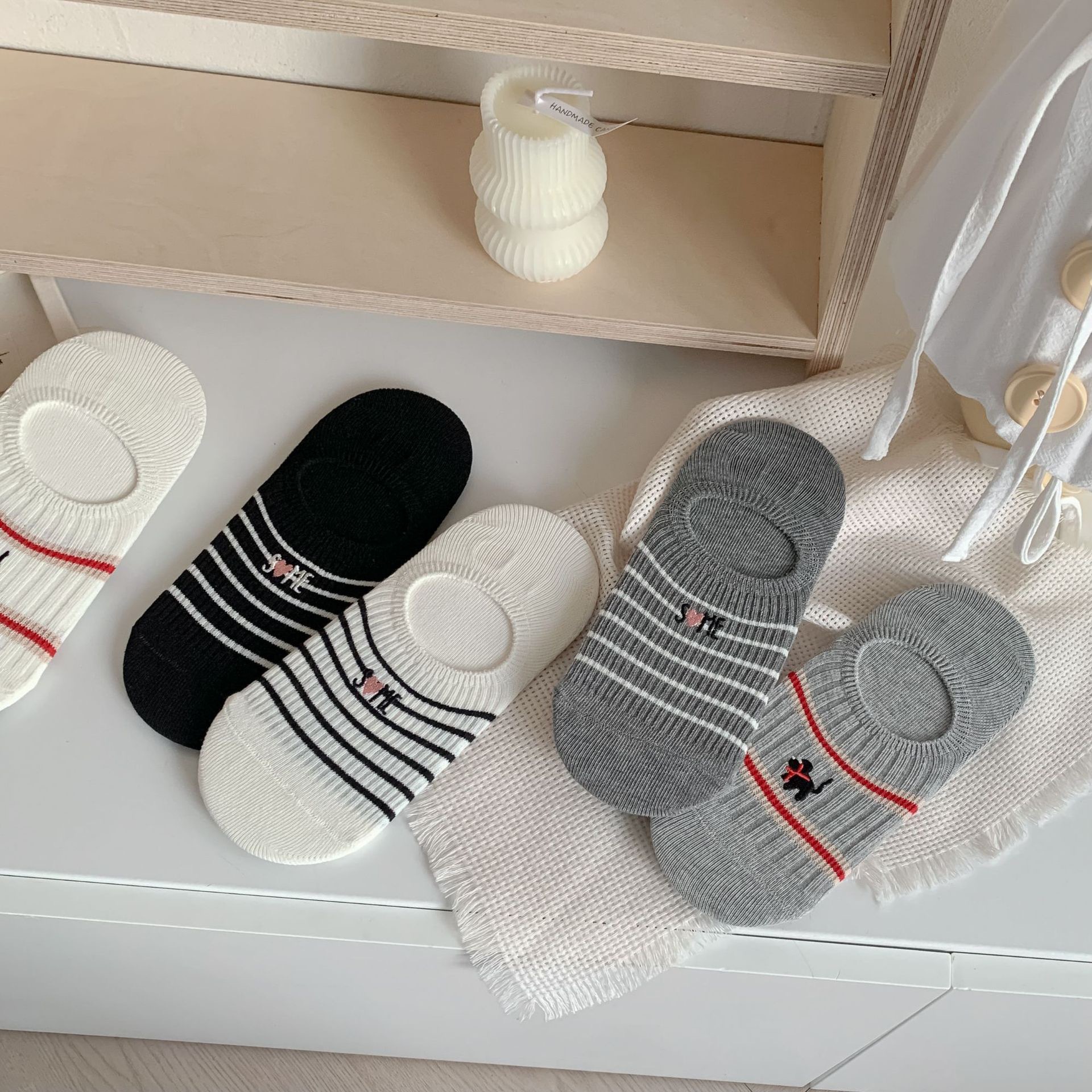 Yuanrun 홈 봄과 여름 대비 컬러 더블 바늘 안티 드롭 힐 보이지 않는 여성 양말 핑크 블루 스트라이프 자수 간단한 올 매치 여름