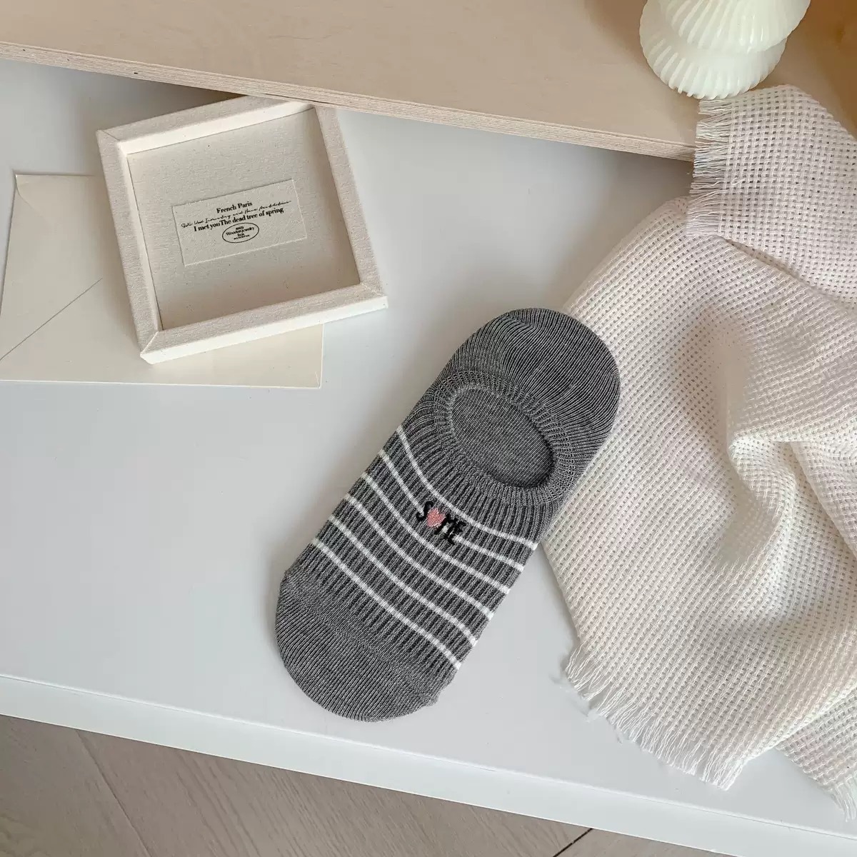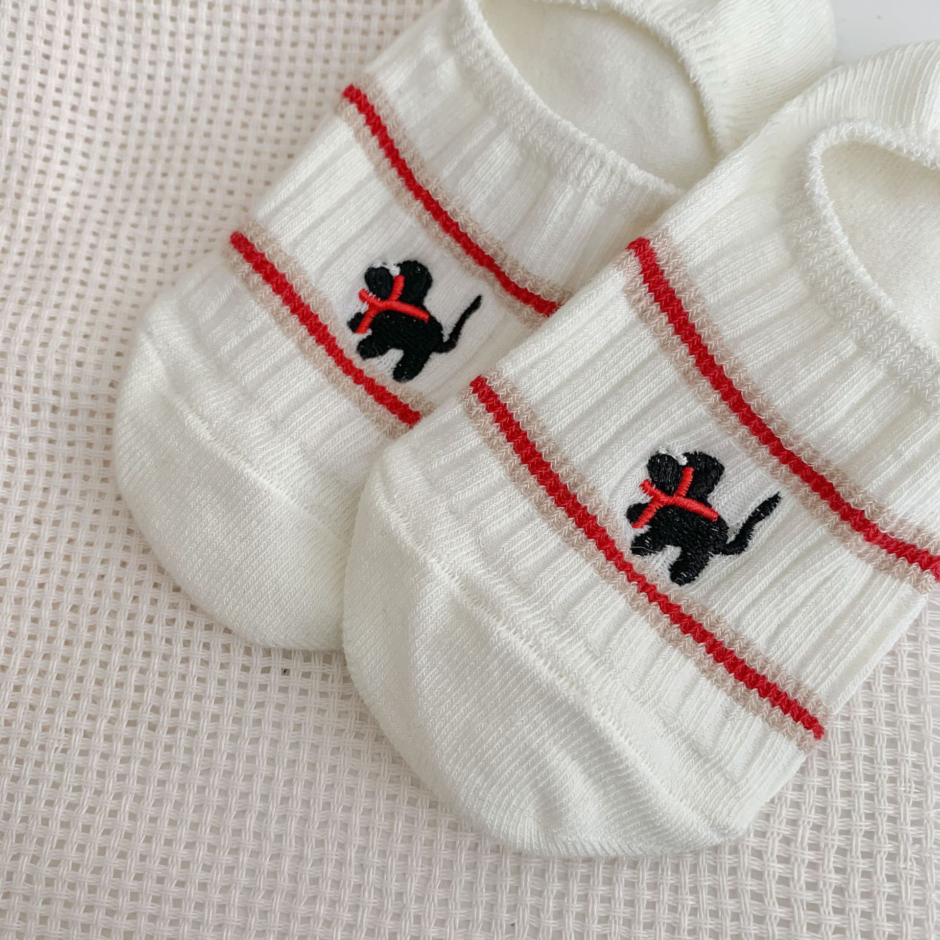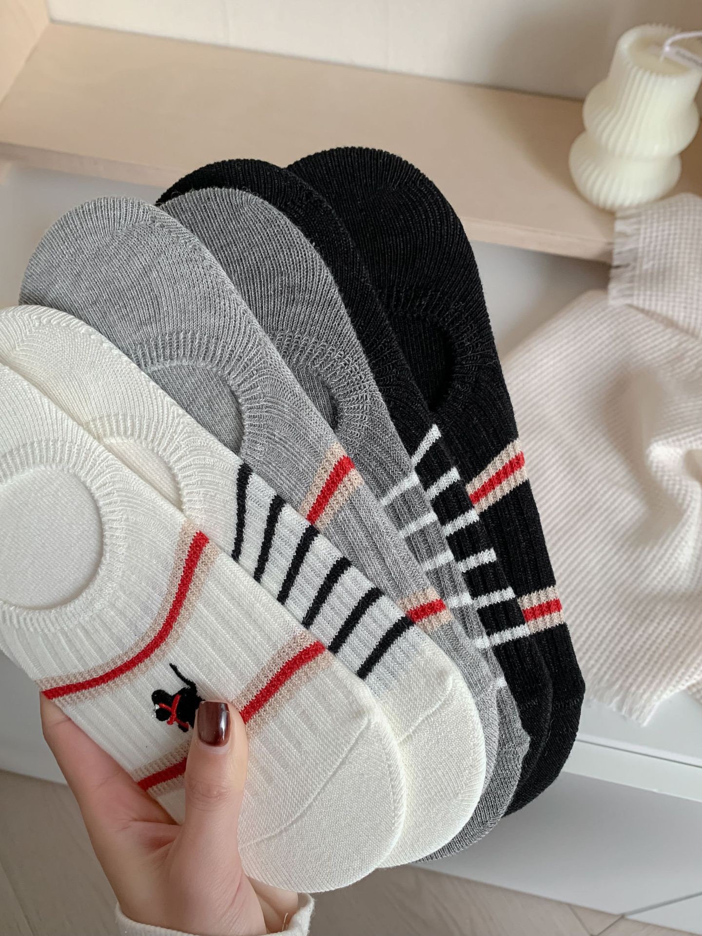 Yuanrun 홈 봄과 여름 대비 컬러 더블 바늘 안티 드롭 힐 보이지 않는 여성 양말 핑크 블루 스트라이프 자수 간단한 올 매치 여름