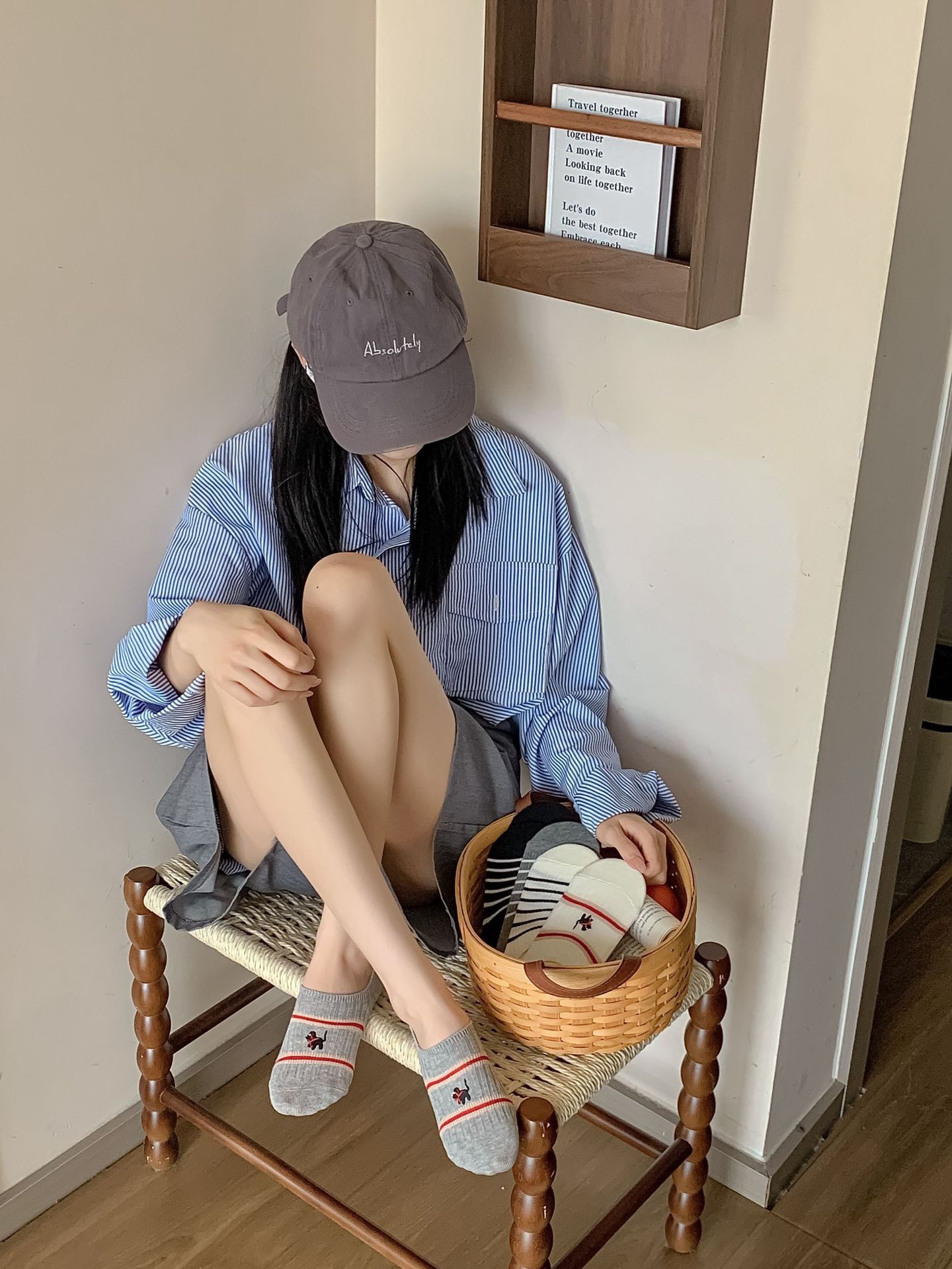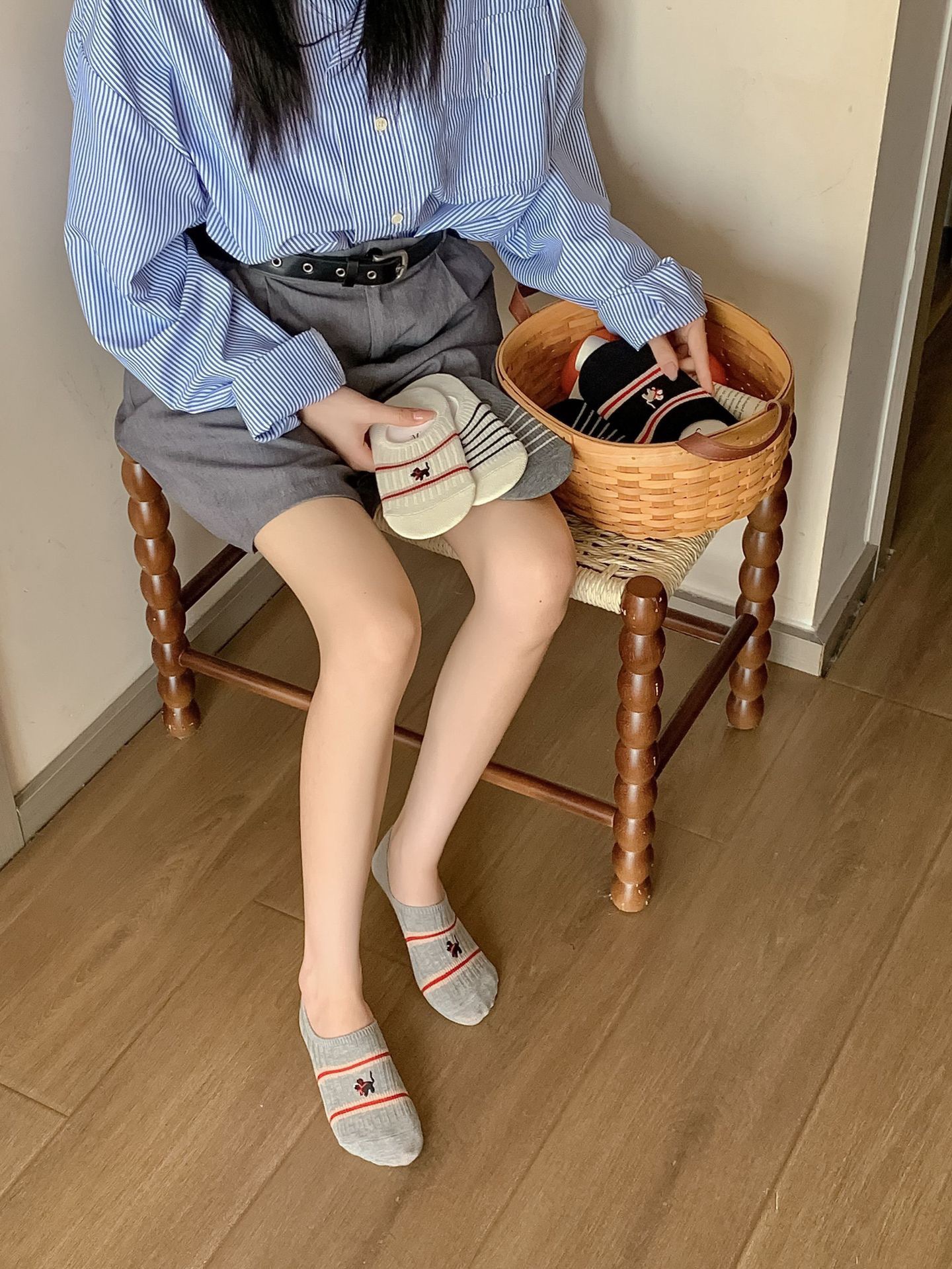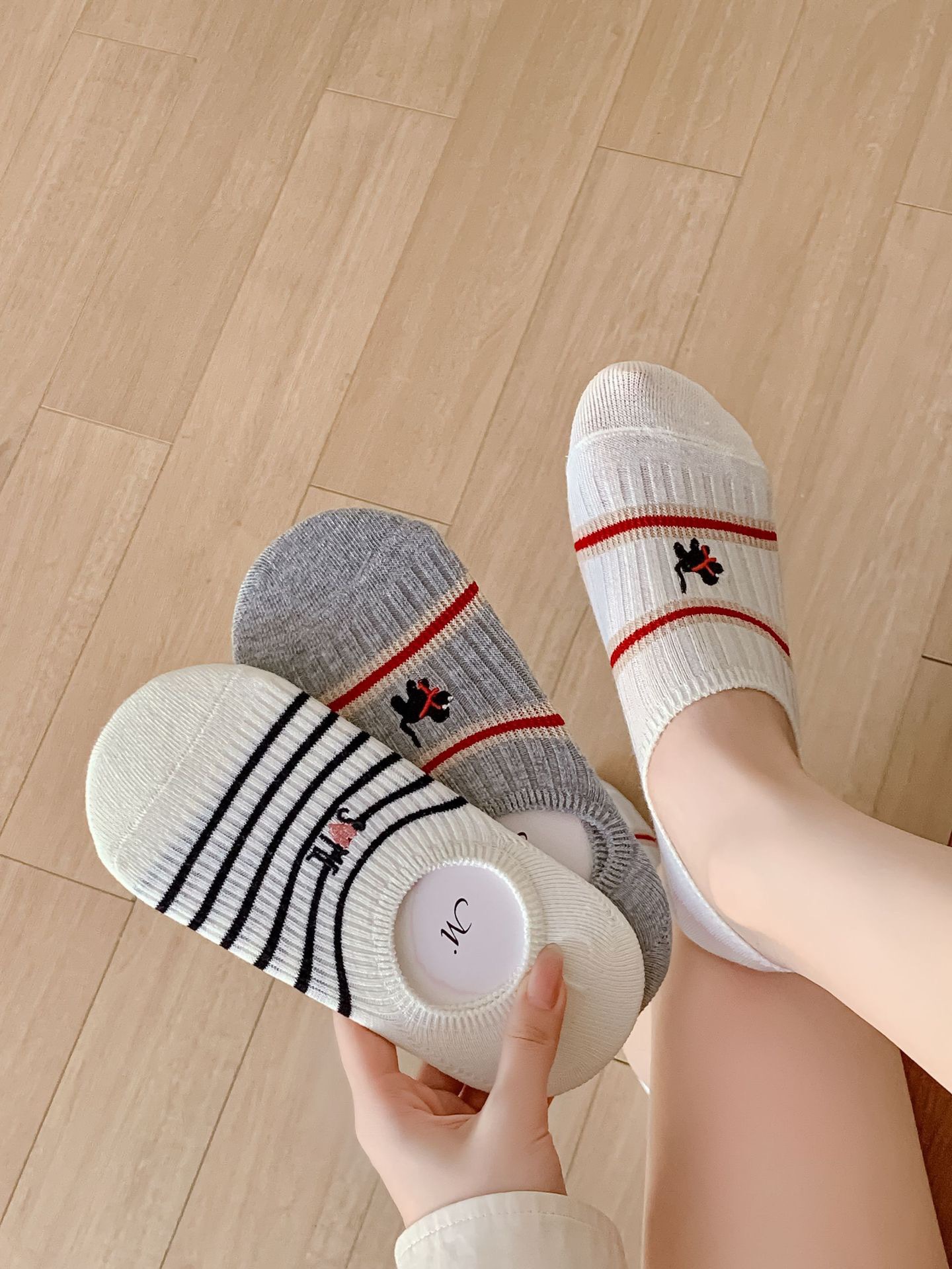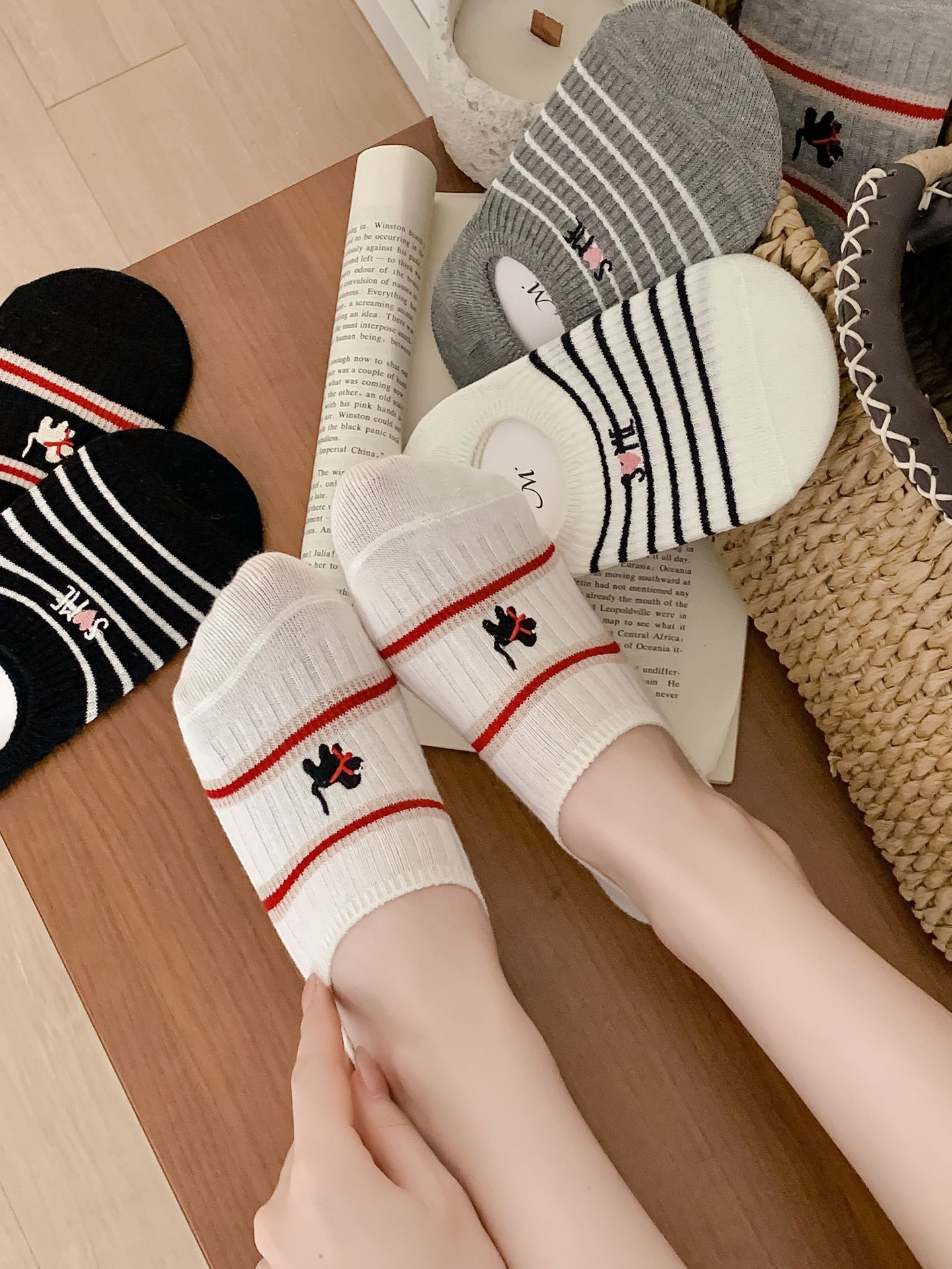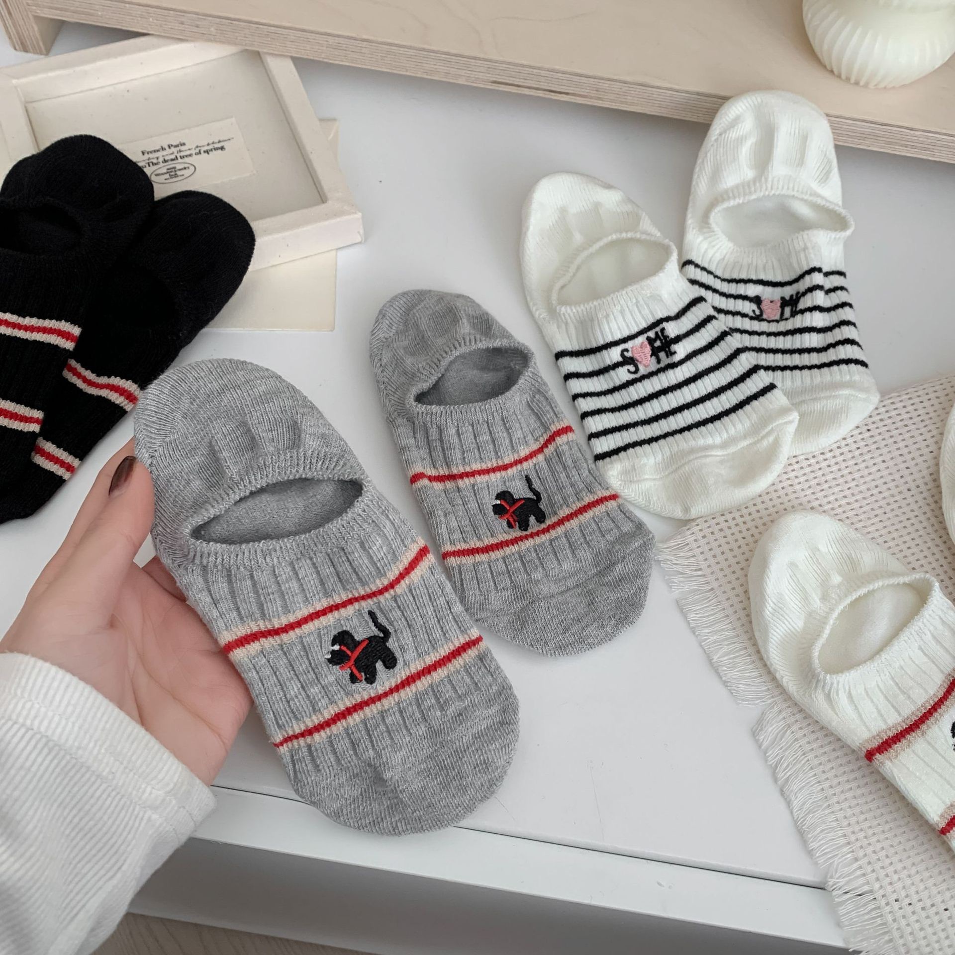 Yuanrun 홈 봄과 여름 대비 컬러 더블 바늘 안티 드롭 힐 보이지 않는 여성 양말 핑크 블루 스트라이프 자수 간단한 올 매치 여름스토어 가기
