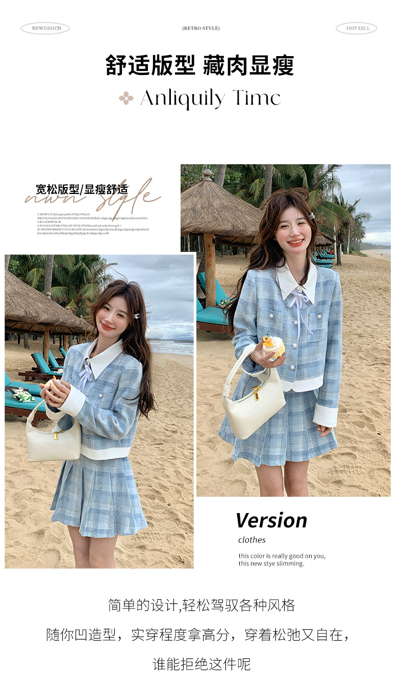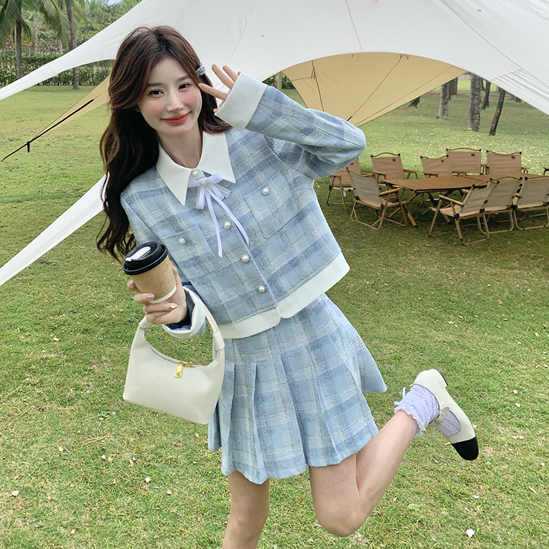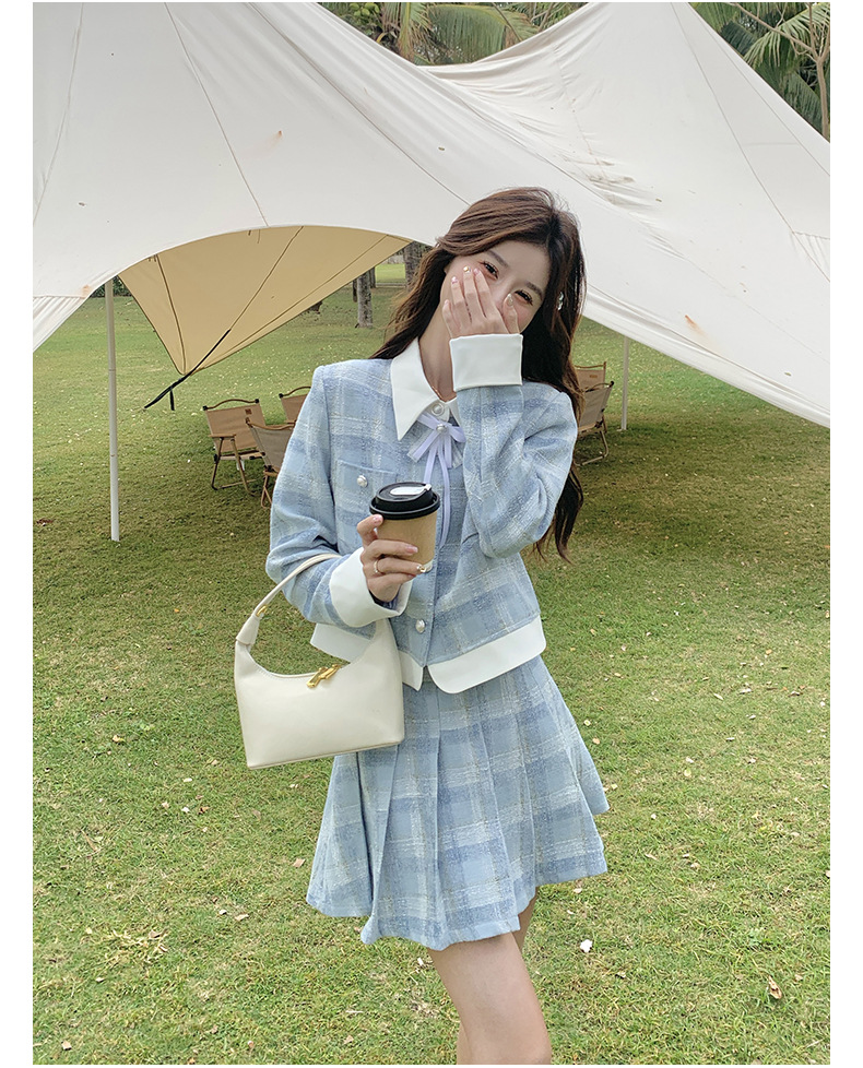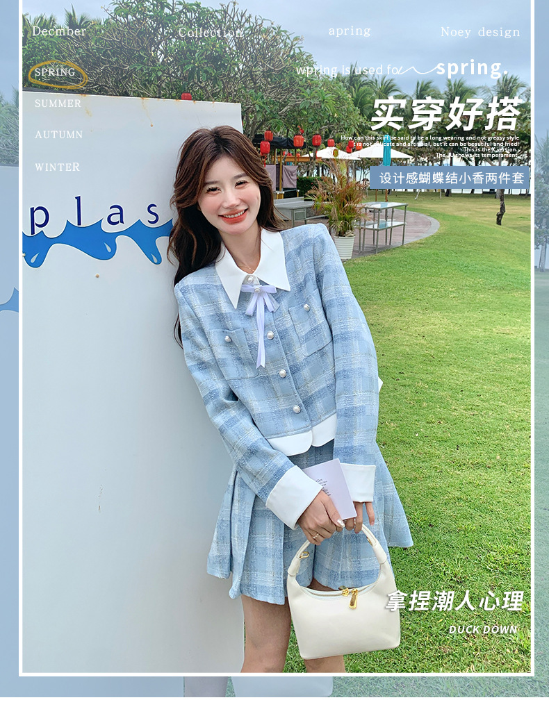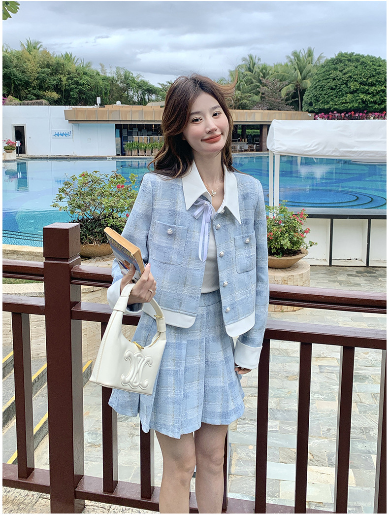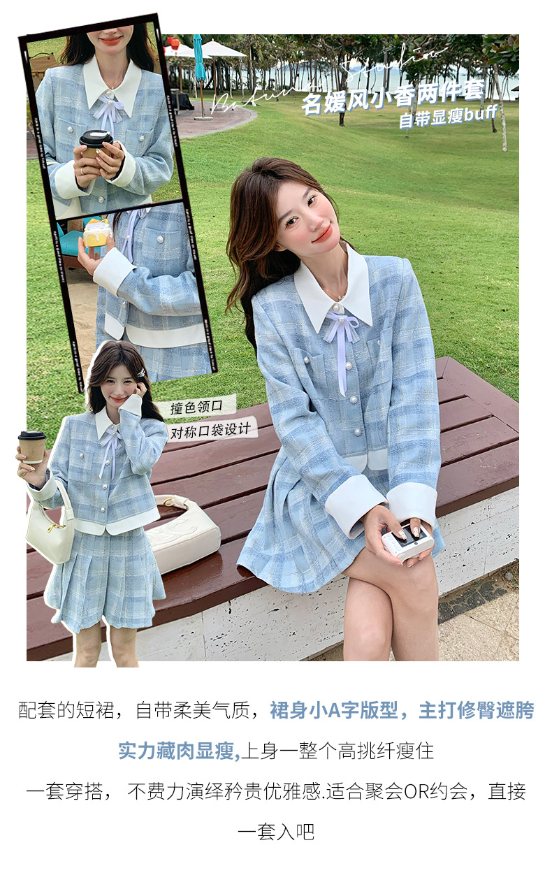 봄 가을 착용 2025 새로운 스타일 샤넬 스타일 빈티지 폴로 칼라 스티칭 스커트 세트 여성스토어 가기