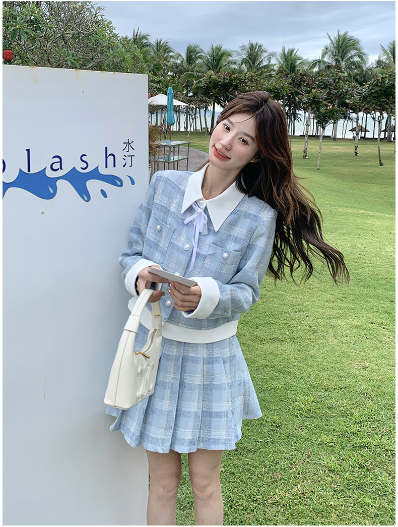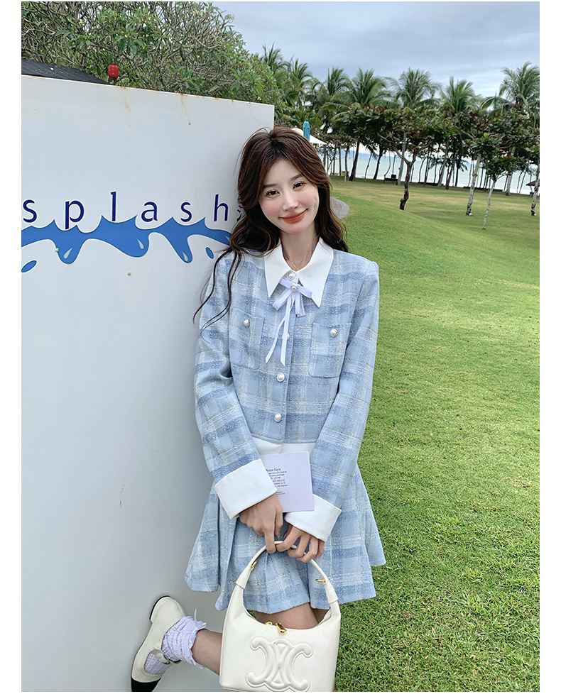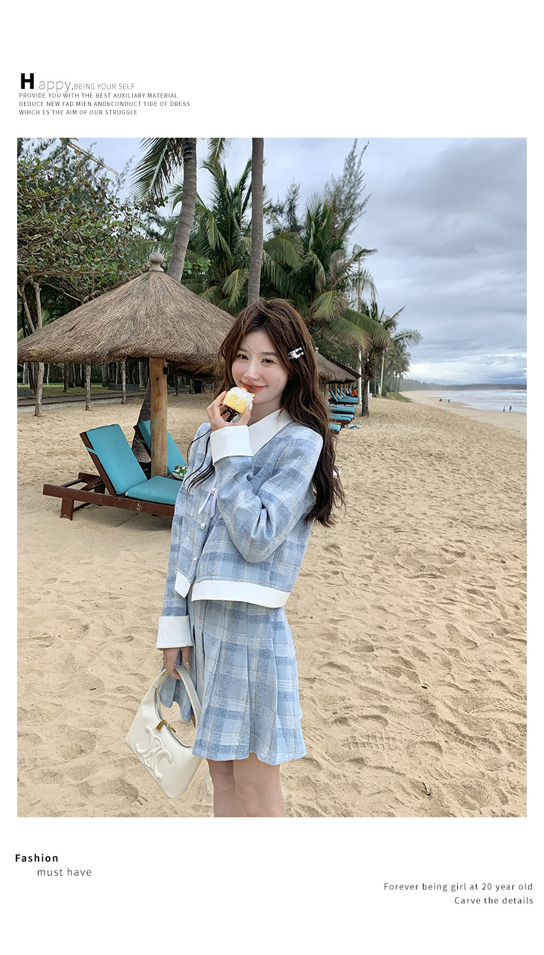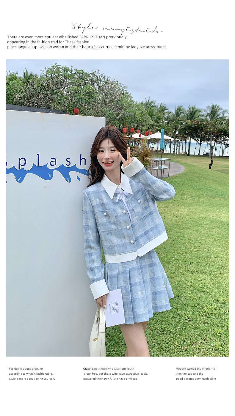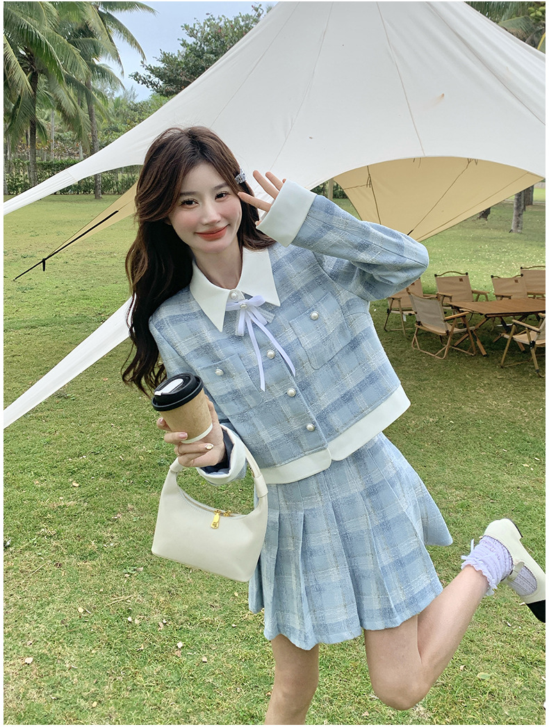 봄 가을 착용 2025 새로운 스타일 샤넬 스타일 빈티지 폴로 칼라 스티칭 스커트 세트 여성스토어 가기