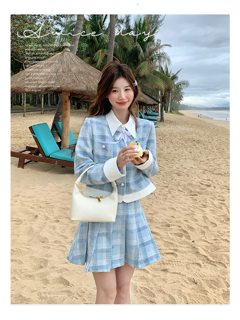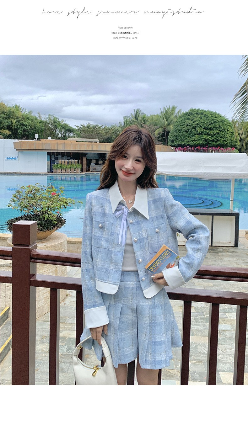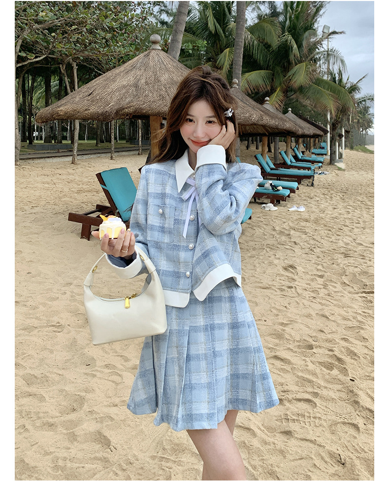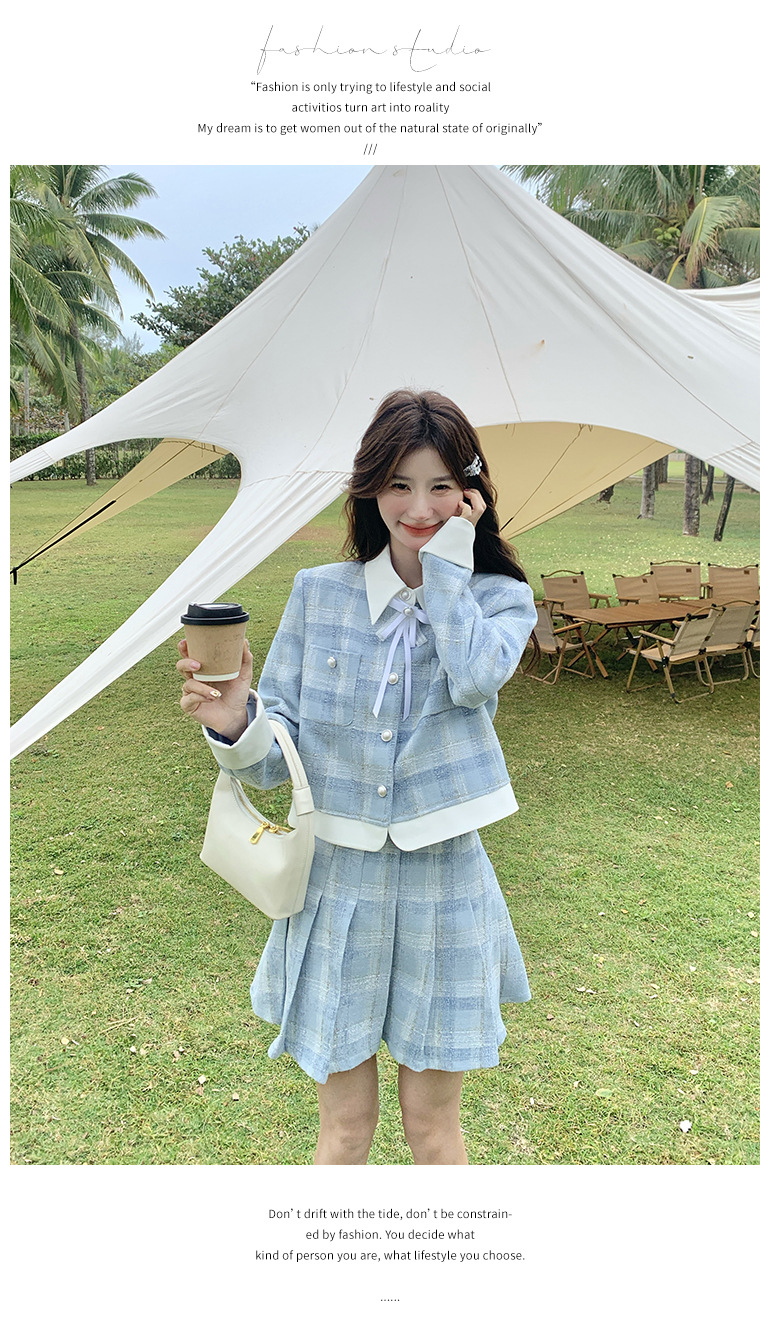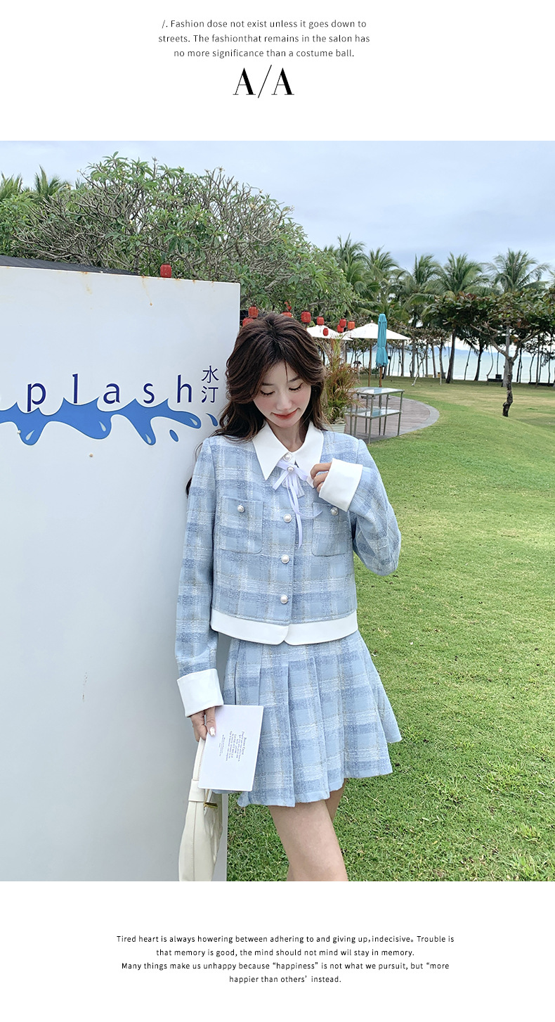 봄 가을 착용 2025 새로운 스타일 샤넬 스타일 빈티지 폴로 칼라 스티칭 스커트 세트 여성스토어 가기