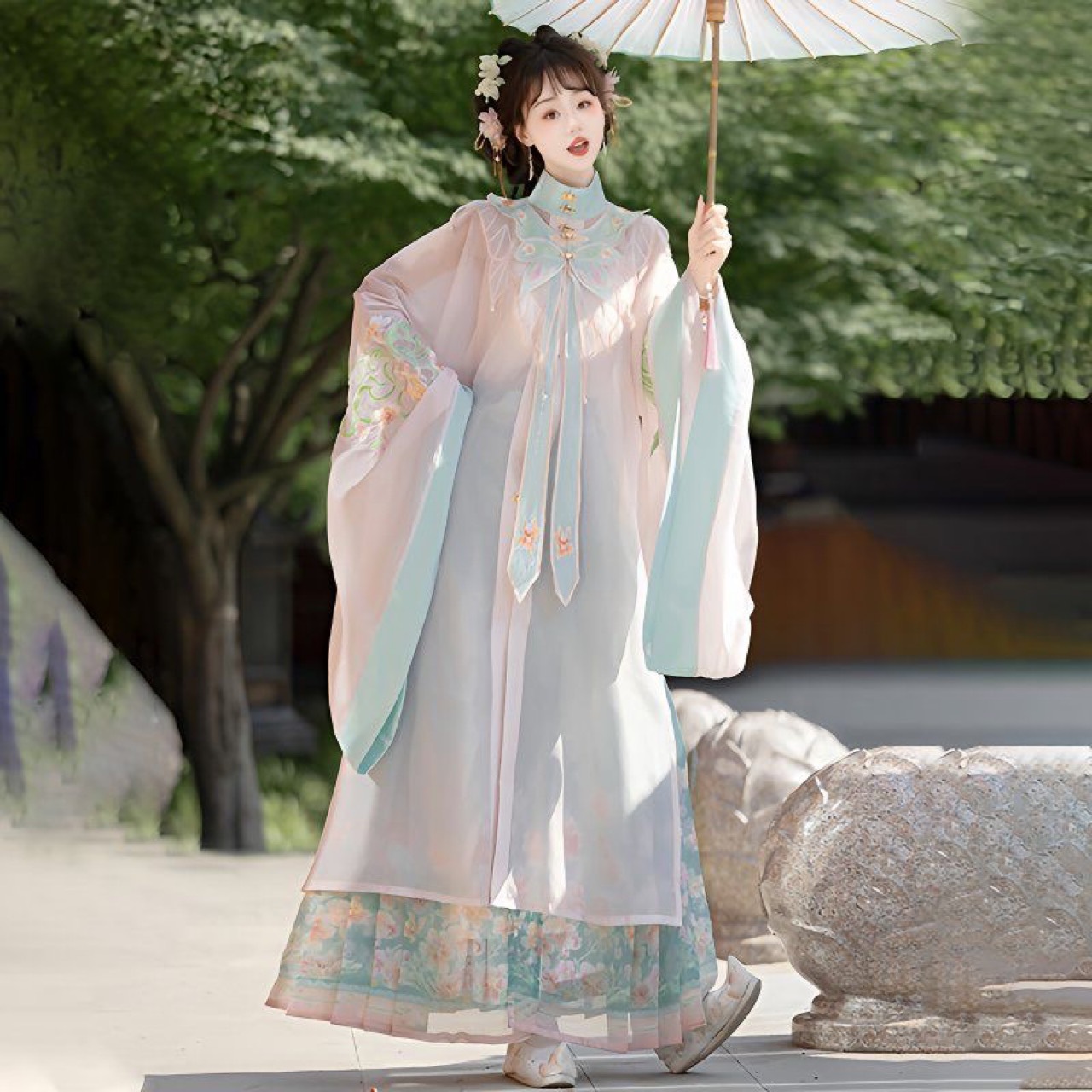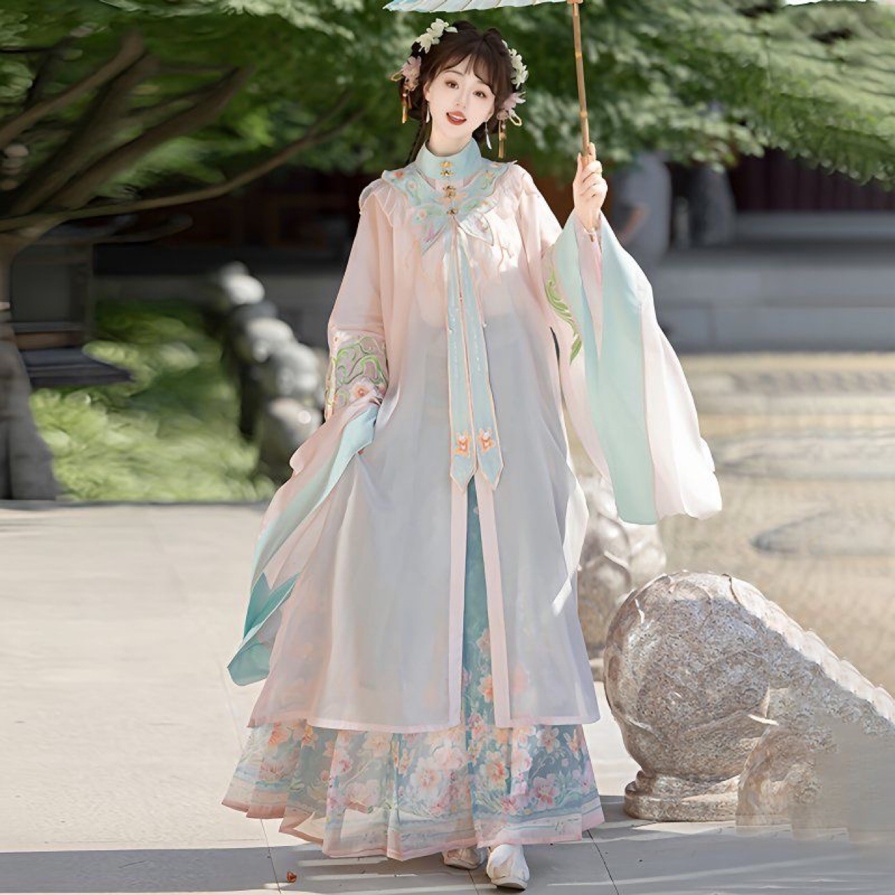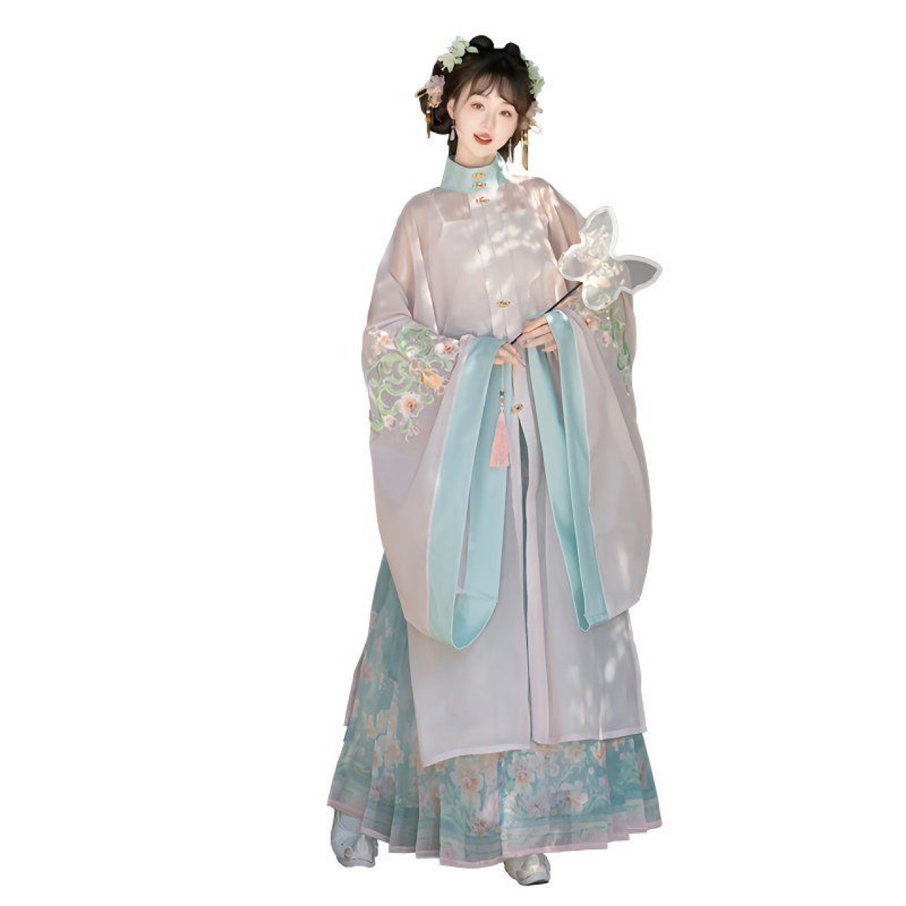 성인 여성의 새로운 푸 다이 명나라 한푸 자수 구름 어깨 꽃 수직 칼라 쌍 말 얼굴 봄 여름 가을 세트