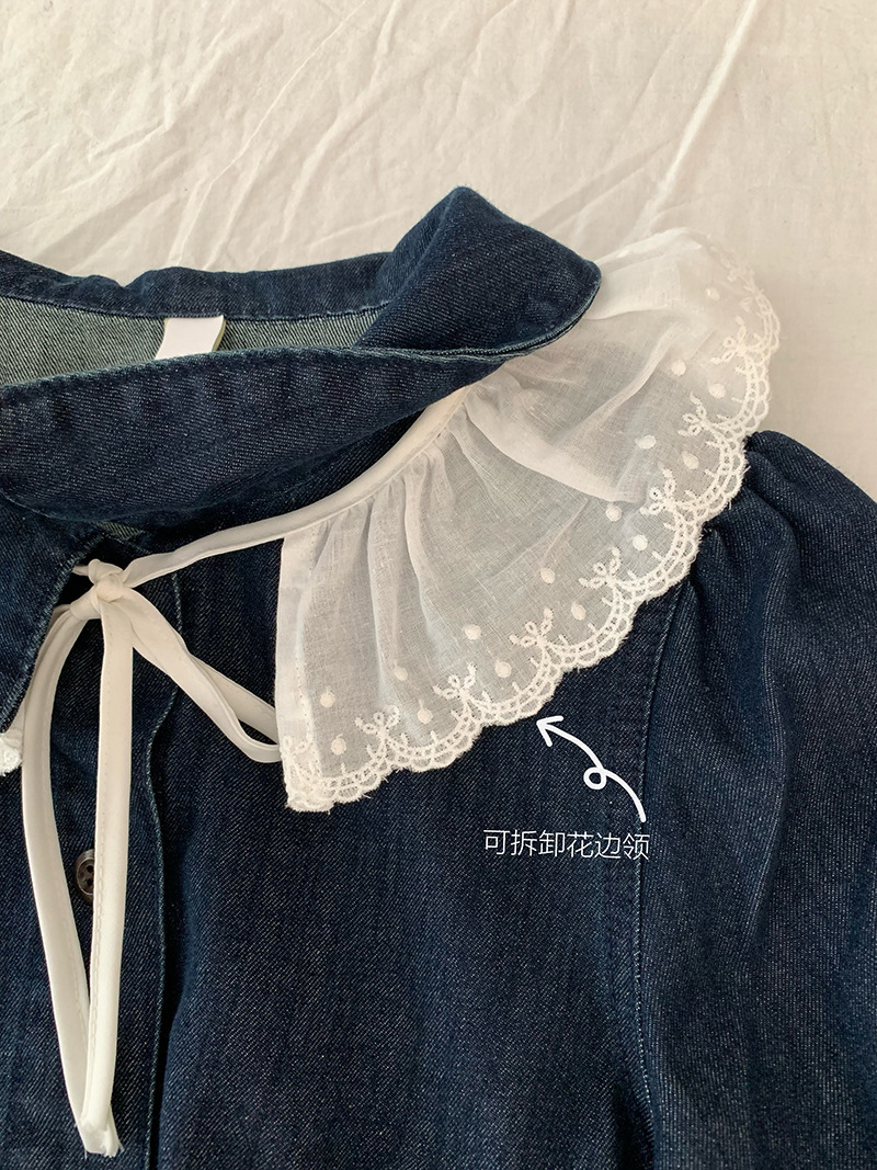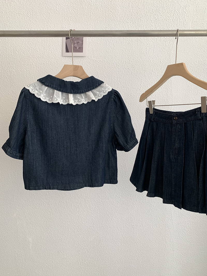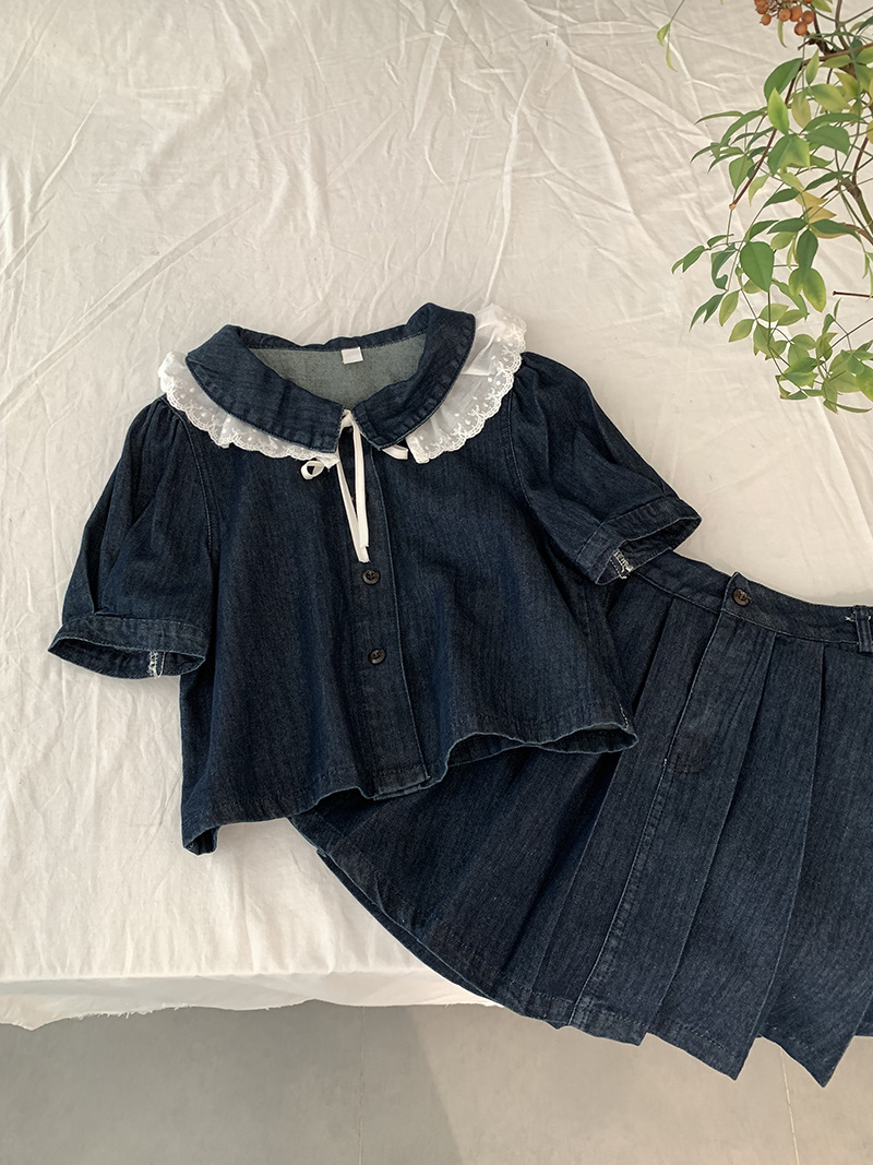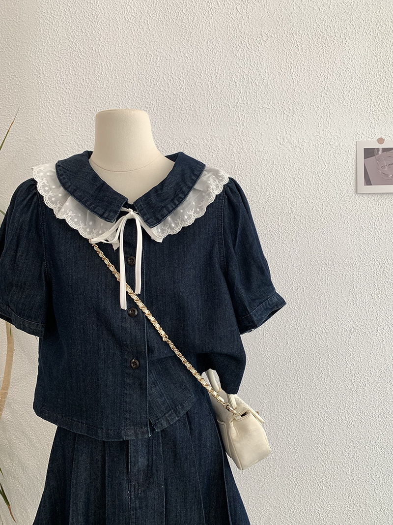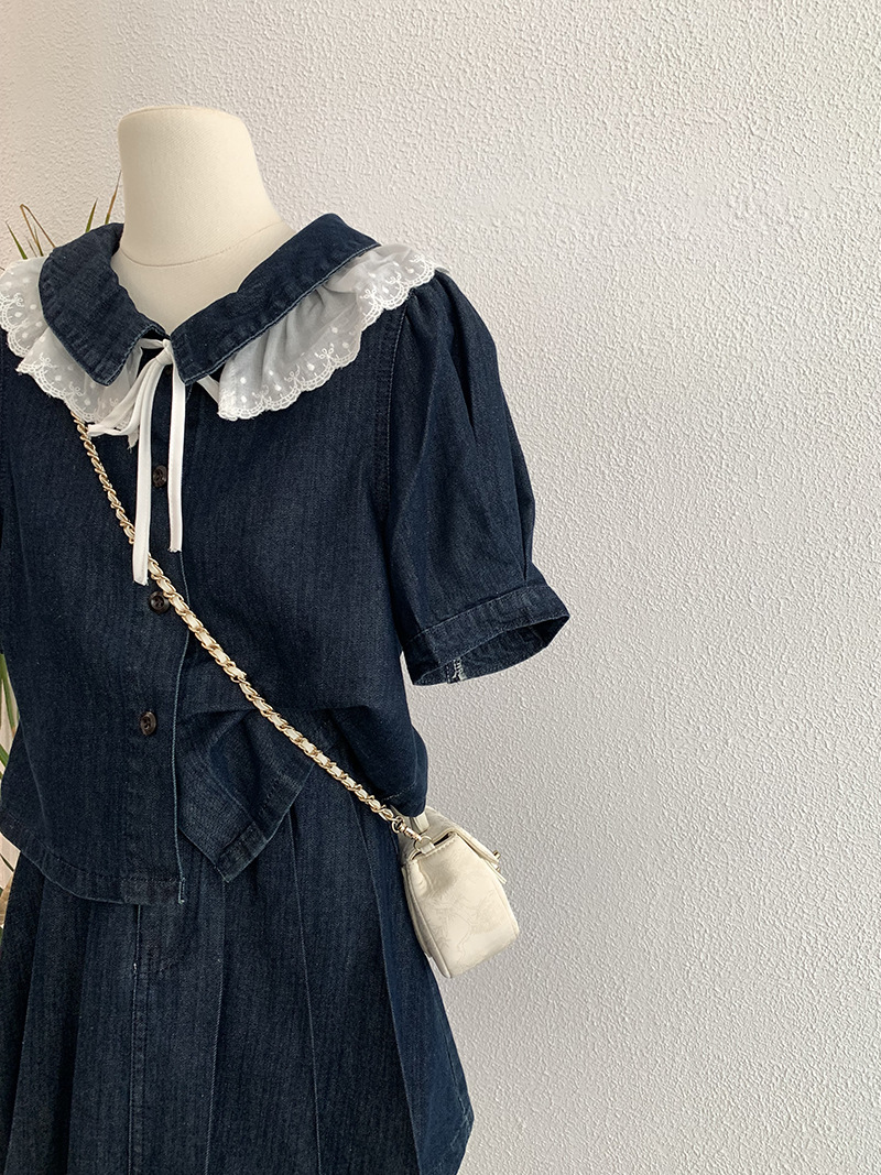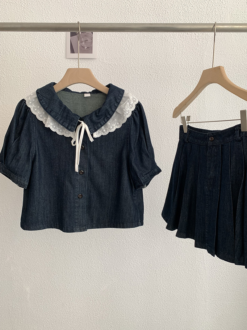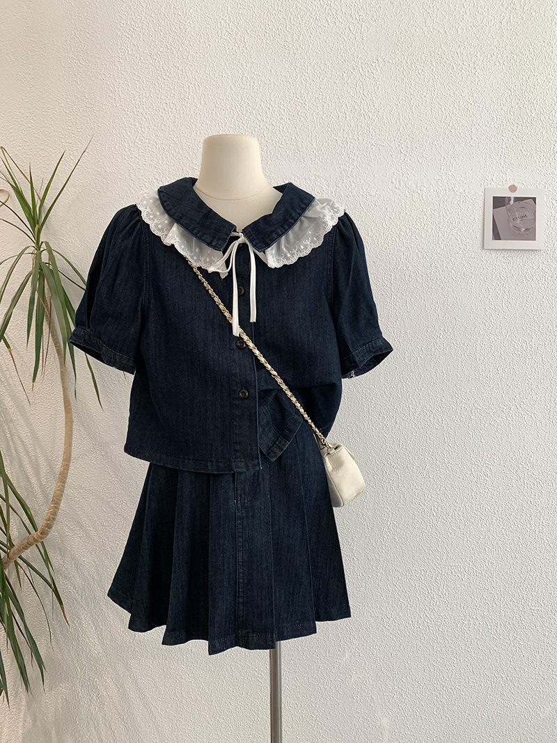 Oumarai 스티칭 레이스 더블 레이어 인형 칼라 반팔 데님 탑 스커트 투피스 여성용 세트 2305