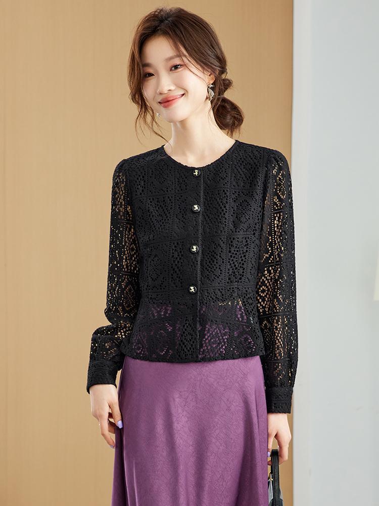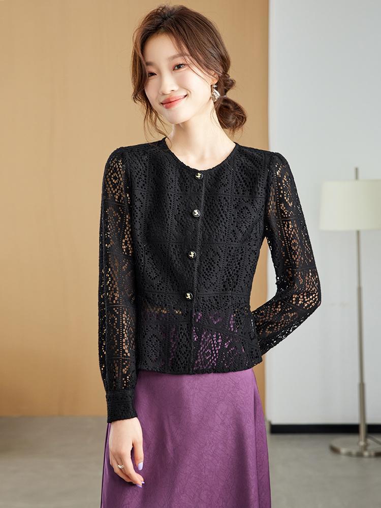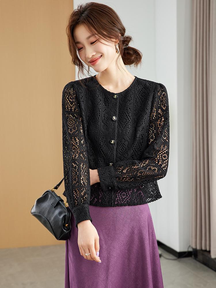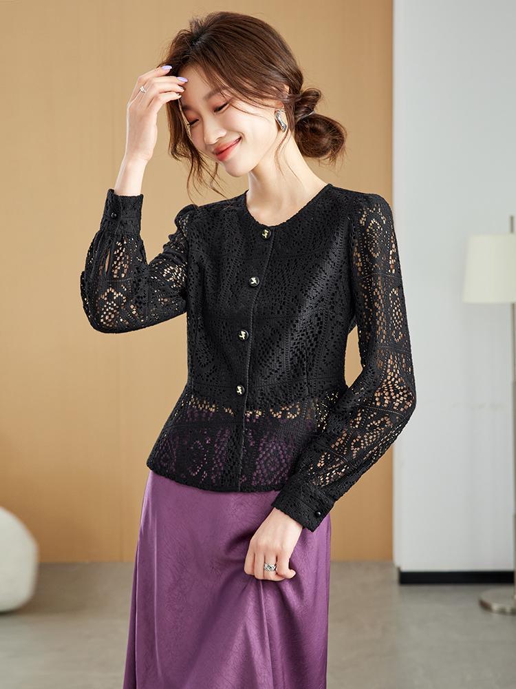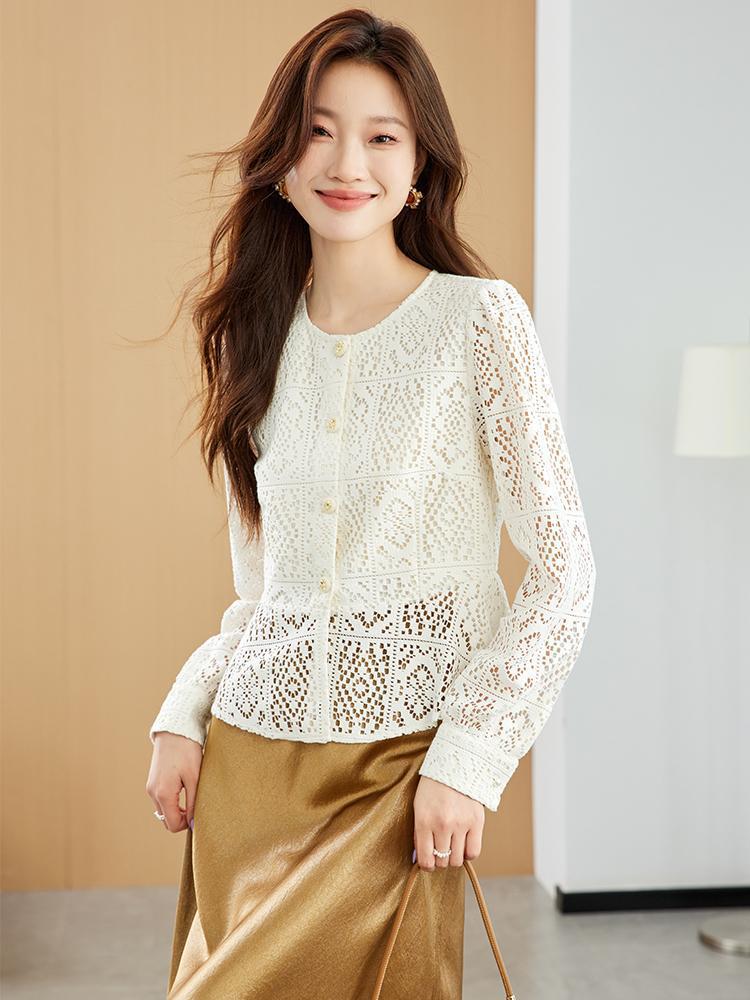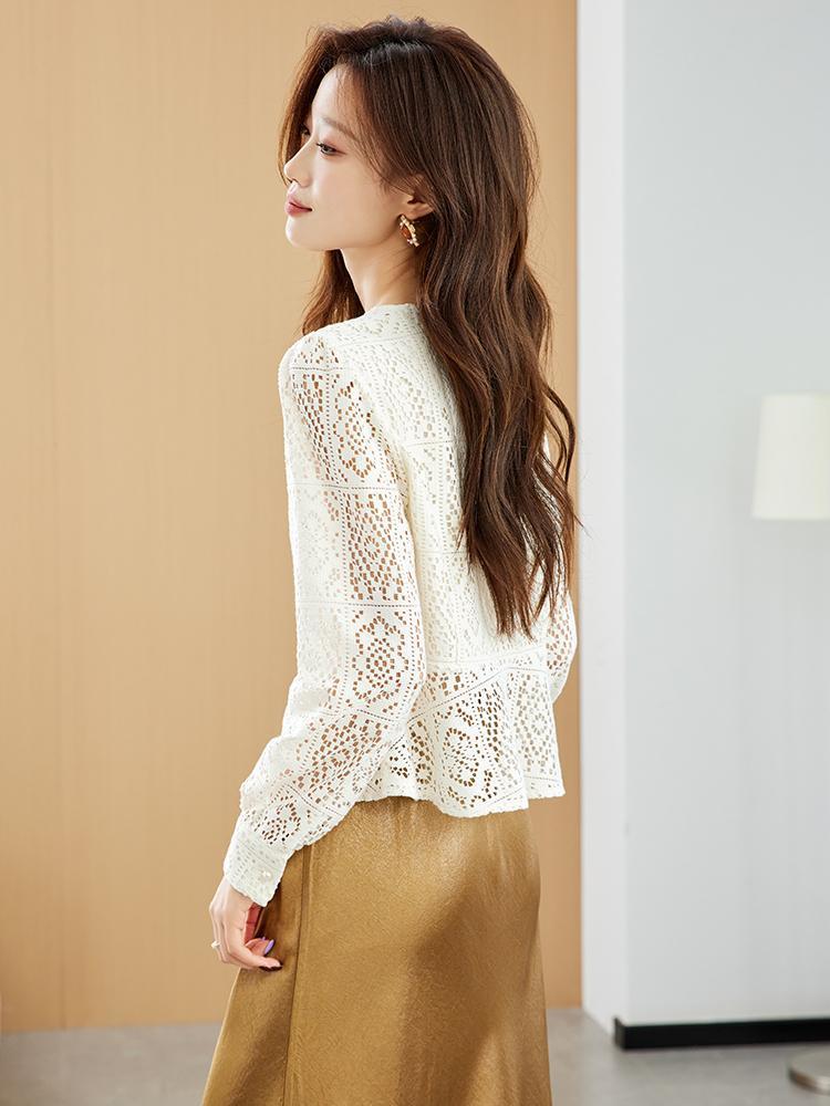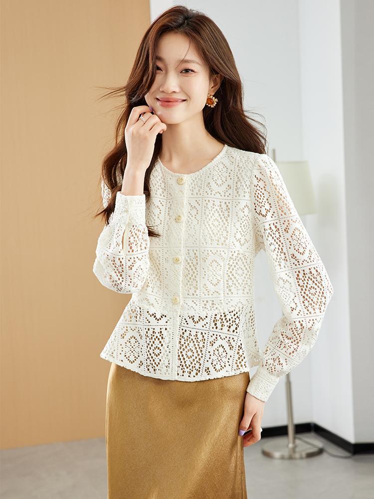 가을 2025 새로운 라운드 넥 샤넬 스타일 레이스 셔츠 여성용 슬림 슬리밍 할로우 아웃 탑 우아한베이스 셔츠