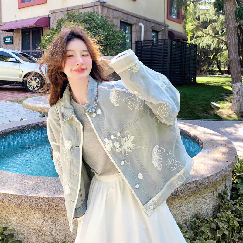 데님 코트 여성 레이스 자수 바느질 봄 프랑스 시대 감소 로맨틱 빈티지 인기 슈퍼 니스 탑 재킷