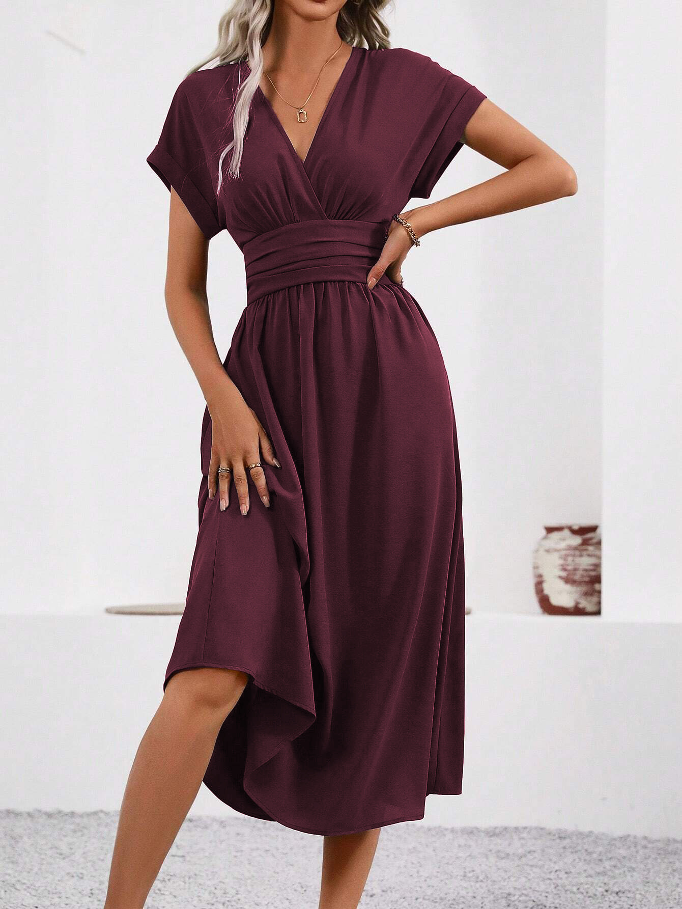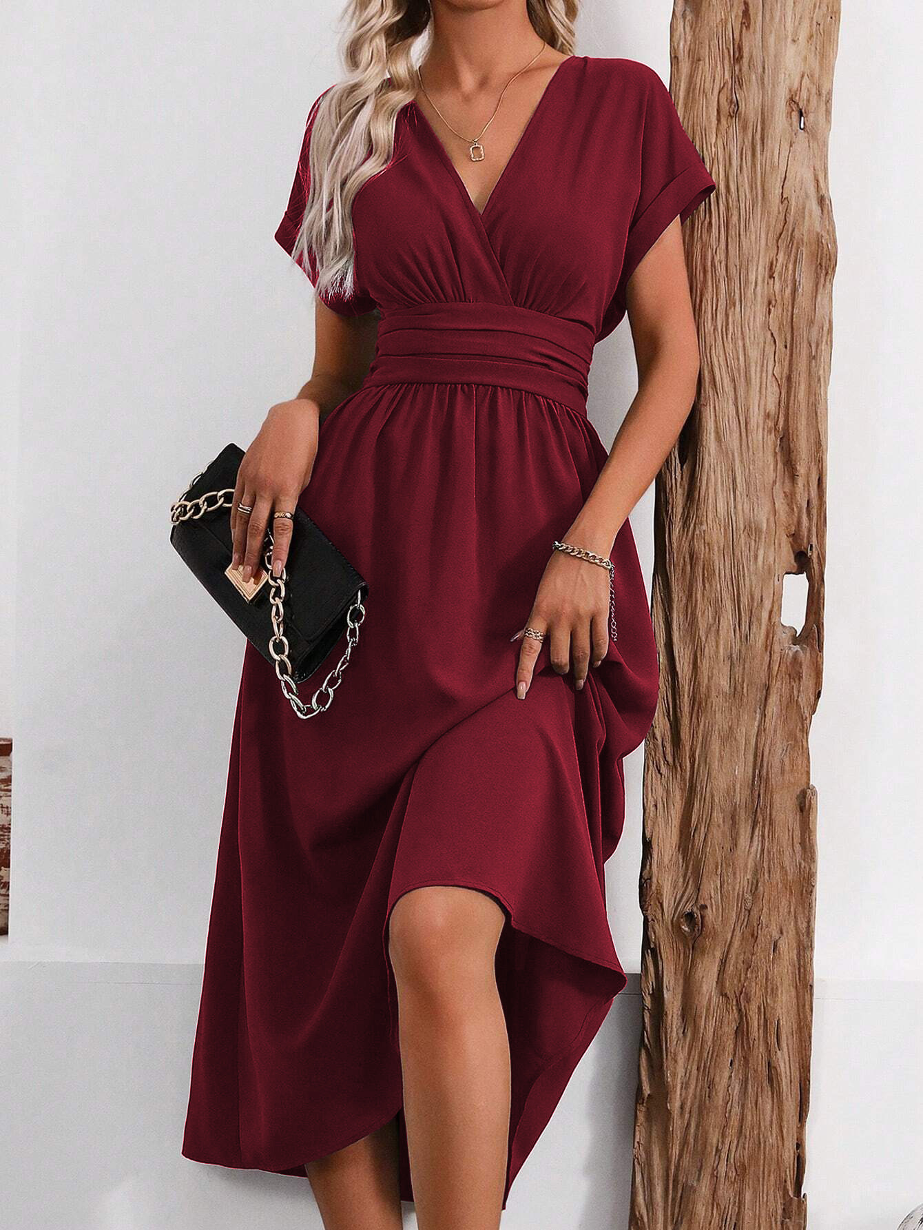여성의 여름 단색 겹치는 V-넥 박쥐 슬리브 주름 허리 긴 우아한 원피스 여성용 긴 원피스