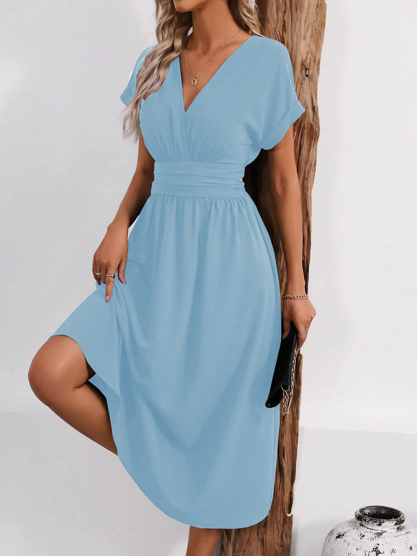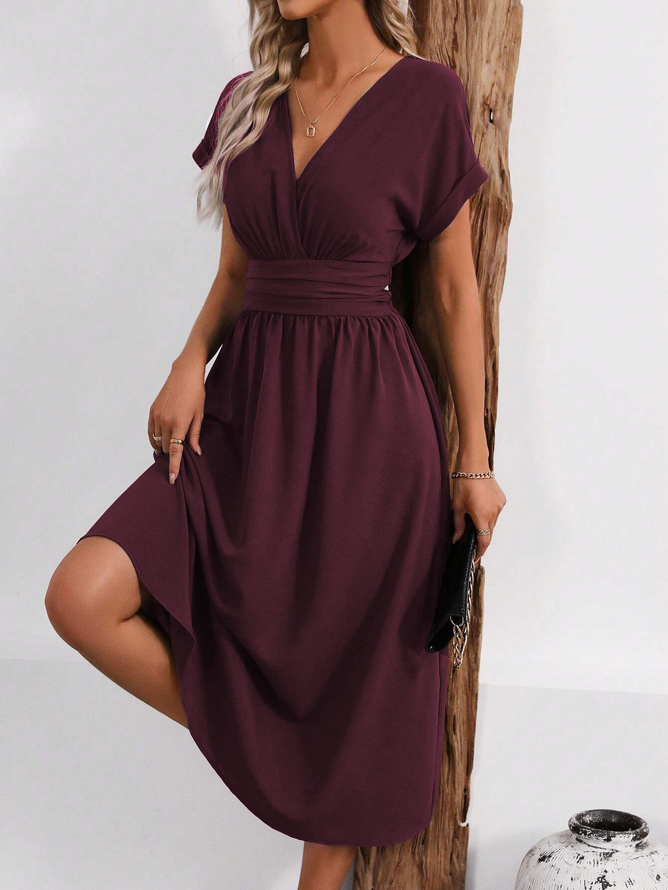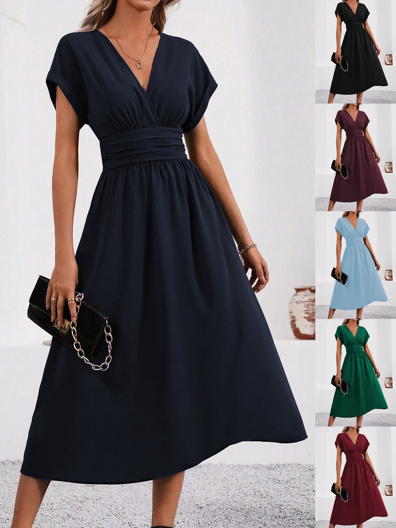 여성의 여름 단색 겹치는 V-넥 박쥐 슬리브 주름 허리 긴 우아한 원피스 여성용 긴 원피스스토어 가기