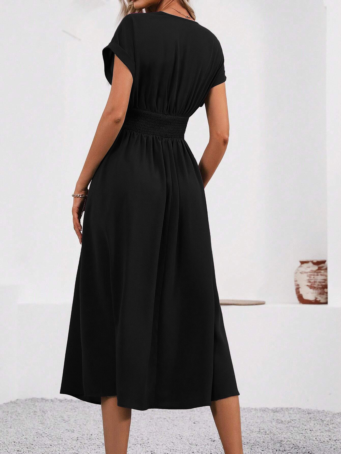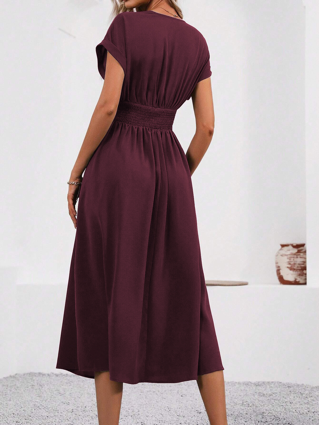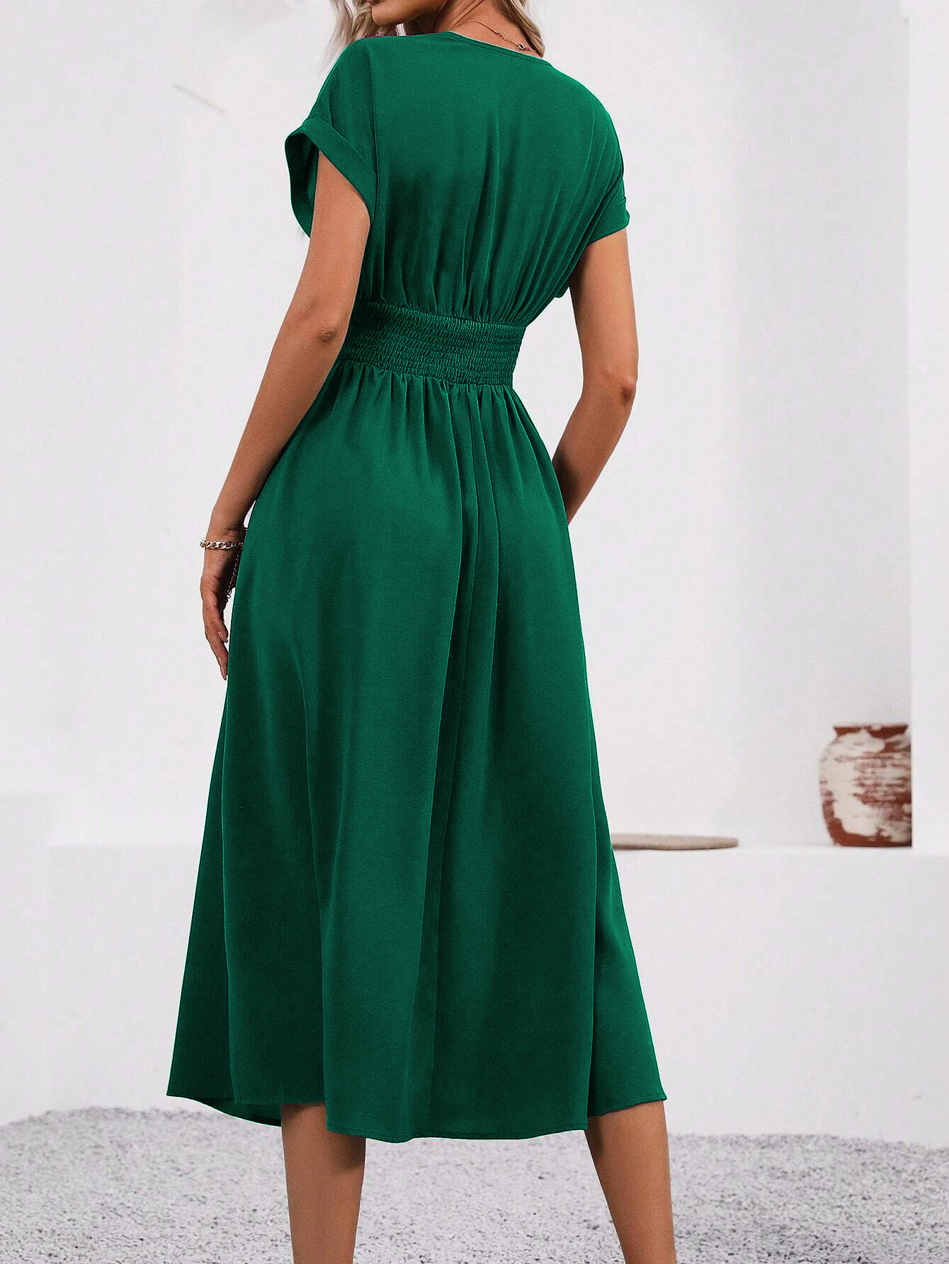여성의 여름 단색 겹치는 V-넥 박쥐 슬리브 주름 허리 긴 우아한 원피스 여성용 긴 원피스스토어 가기