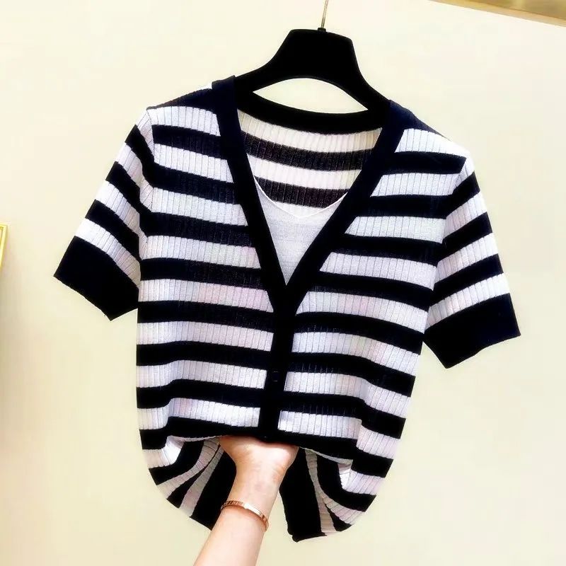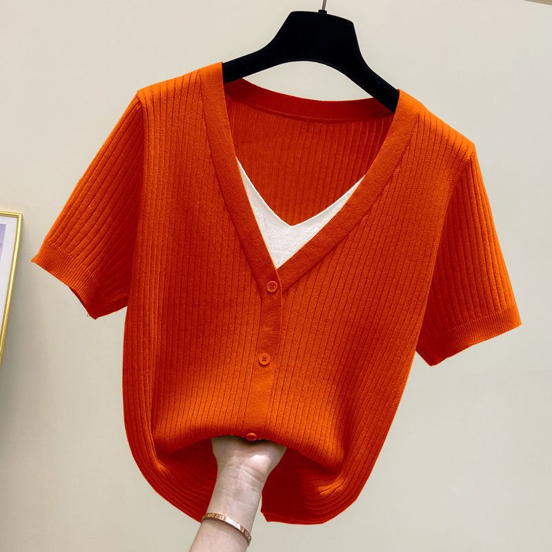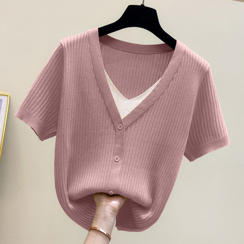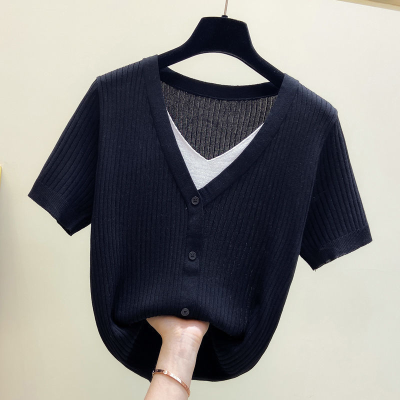 아이스 실크 칼라 가짜 투피스 반팔 셔츠 탑 여자 여름 새로운 올매치 느슨한 슬리밍 니트베이스 셔츠 플러스 사이즈 여성