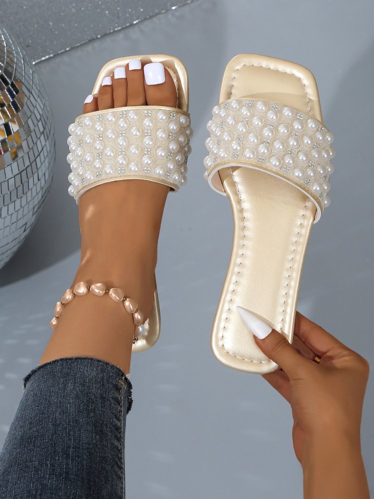 여성용 진주 샌들과 슬리퍼 2025 여름 새로운 스타일 스퀘어 헤드 원핏 세트 피트 패션 플랫 슬리퍼