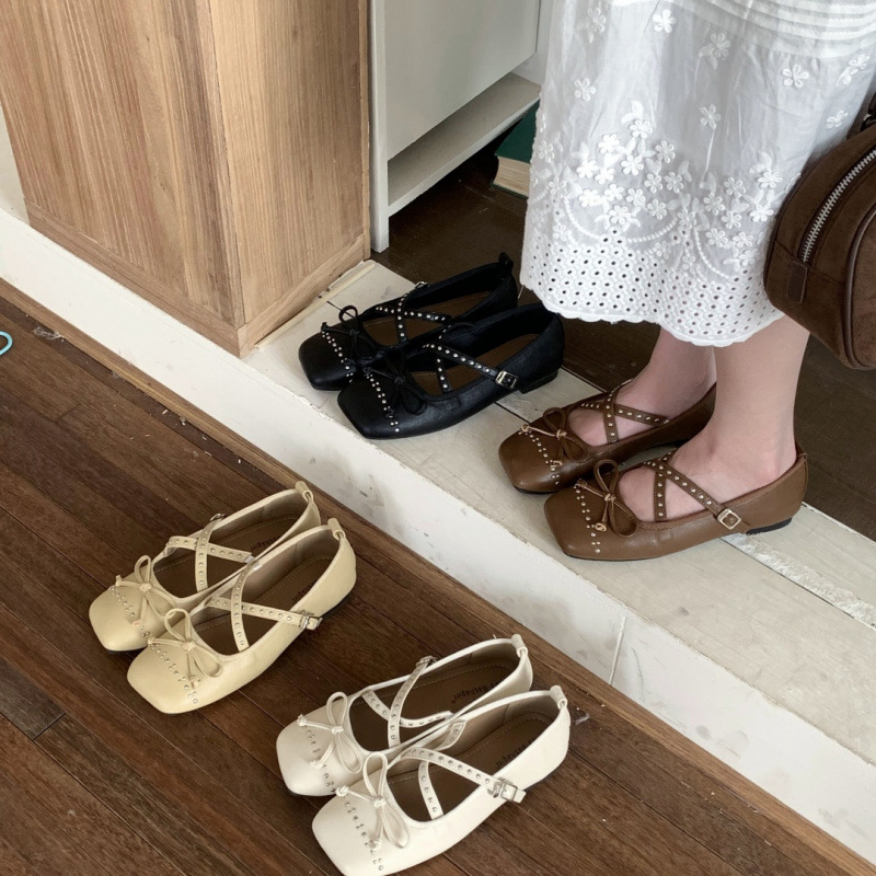2025 봄 새로운 프랑스 스타일 메리 제인 신발 광장 발가락 크로스 활 디자인 플랫 얕은 입 싱글 신발