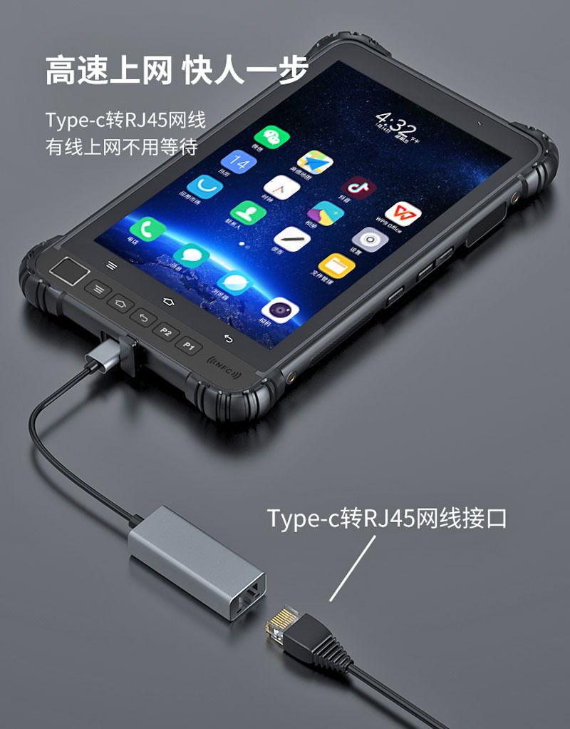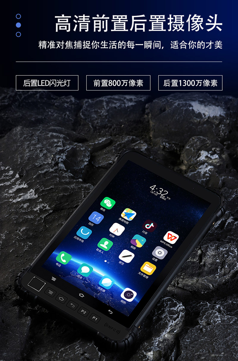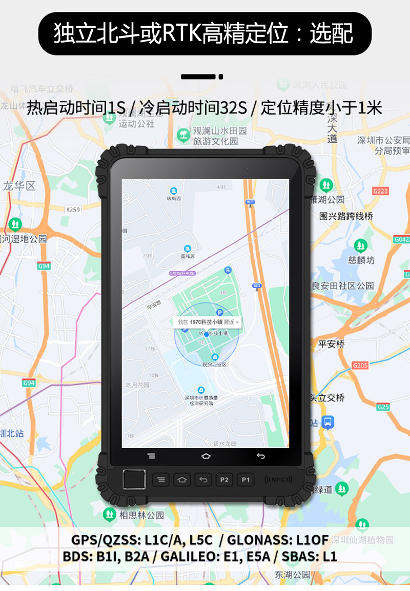 4、内置WIFI,蓝牙,可以支持GPS和全网通4G网络,具有打电话和上网功能,还可选配NFC功能/二维码扫描头/独立北斗/高精度RTK模块。
