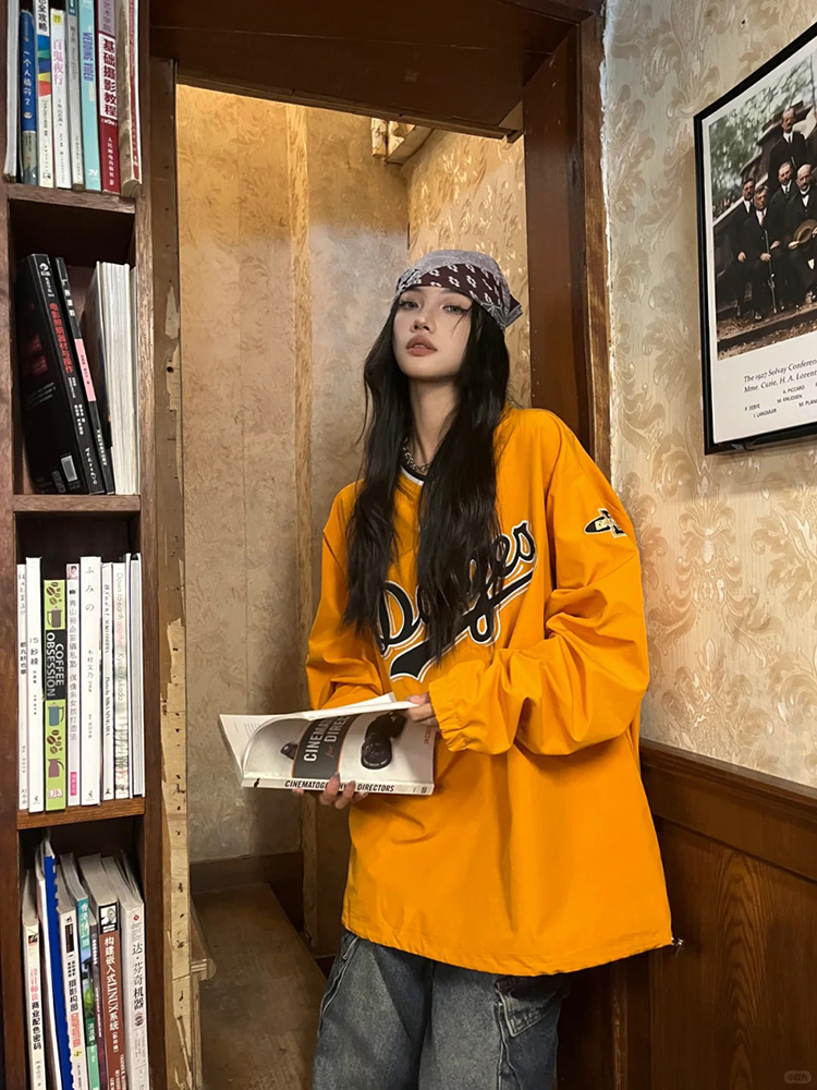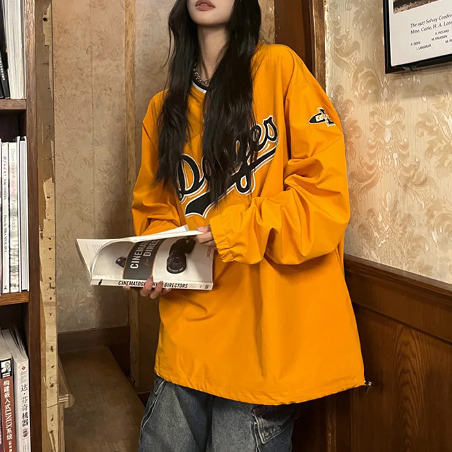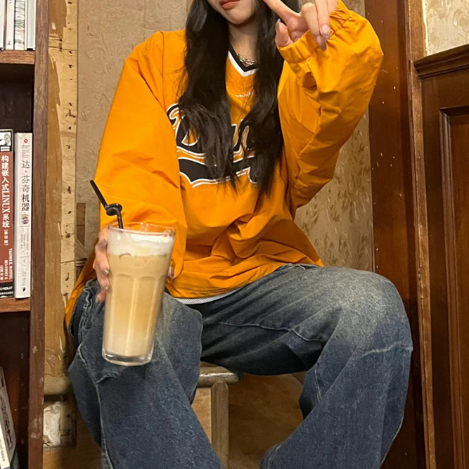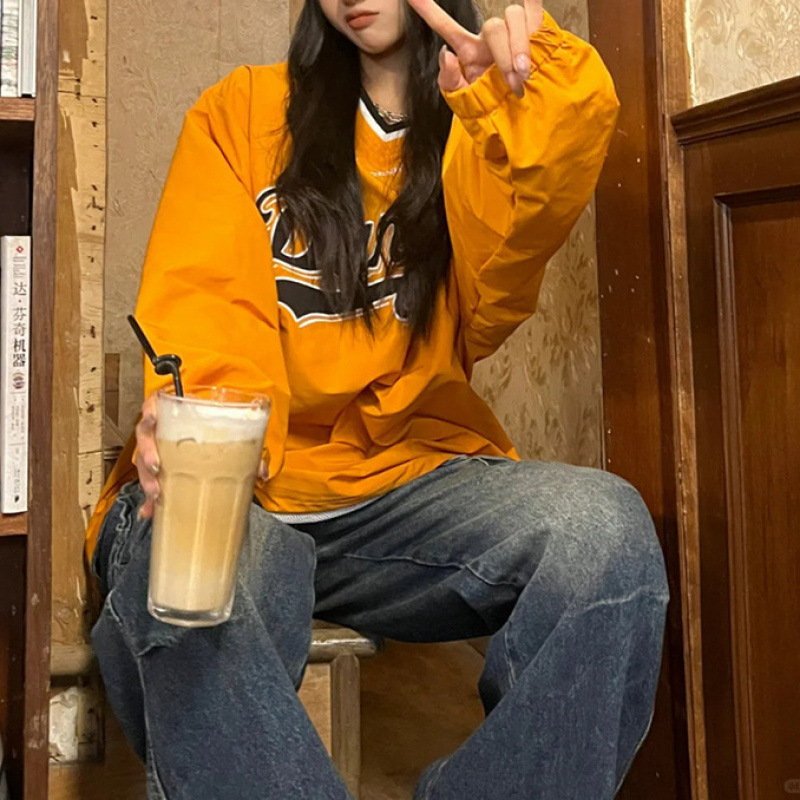 P Pouvoir 미국 분위기 스포츠 긴 소매 스웨터 여성 봄과 여름 하이 스트리트 느슨한 힙합 복고풍 V 넥 탑스토어 가기