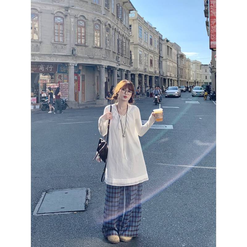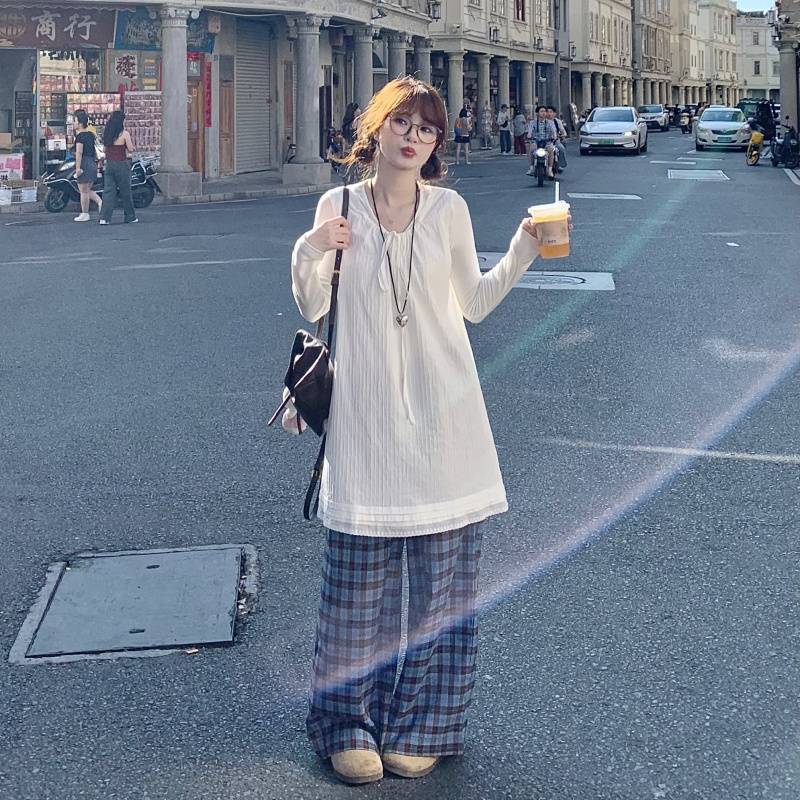 이른 가을 새로운 귀여운 한국 스타일 레이스 업 드로우 스트링 조끼 느슨한 슬리밍 원피스 체크 무늬 캐주얼 바지 투피스 세트스토어 가기