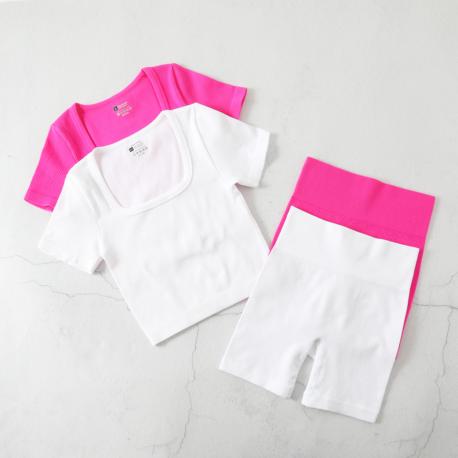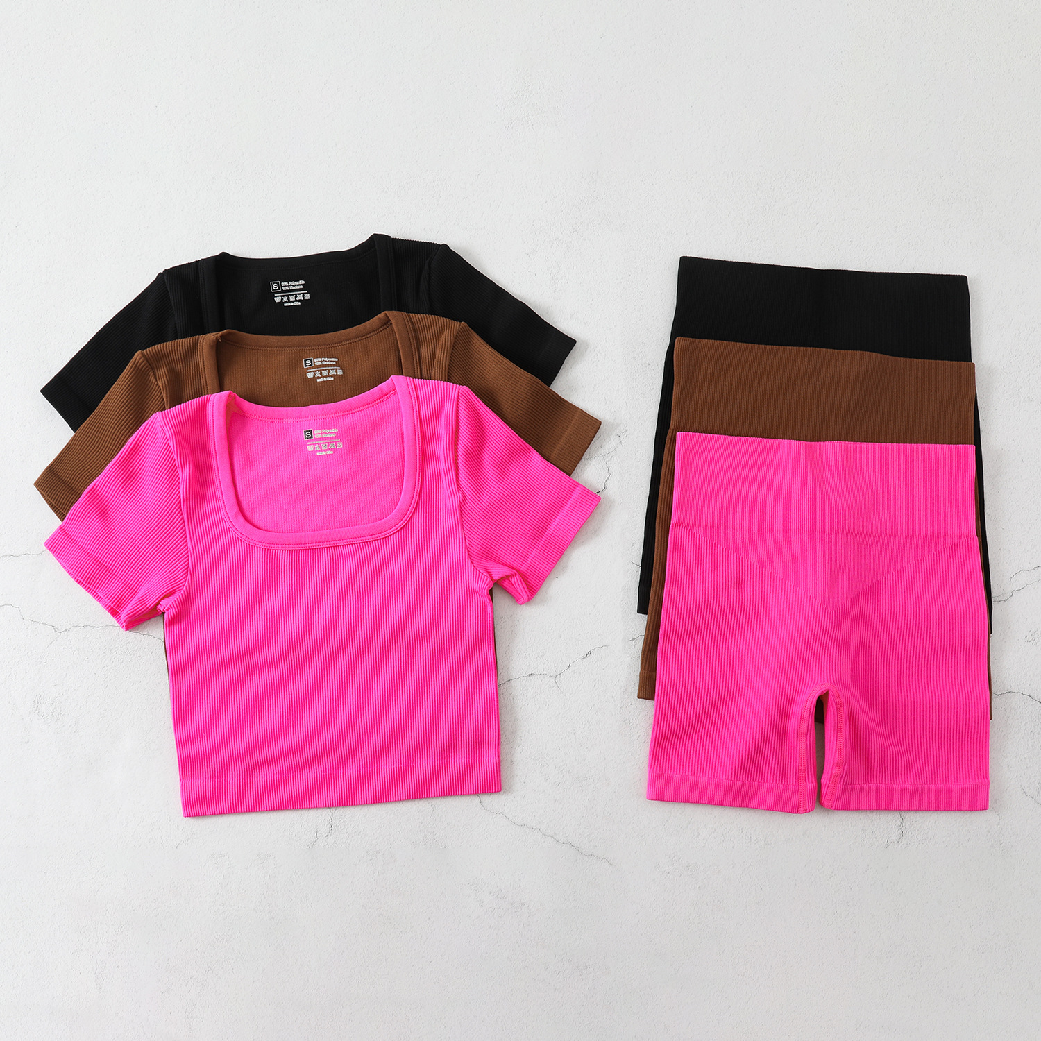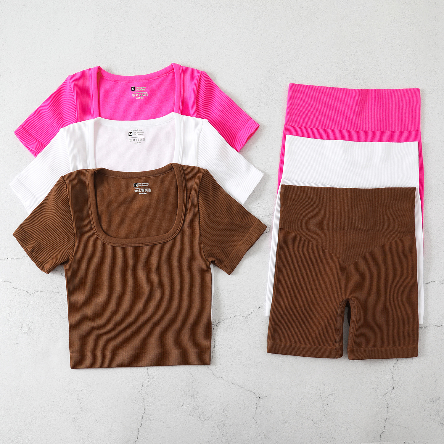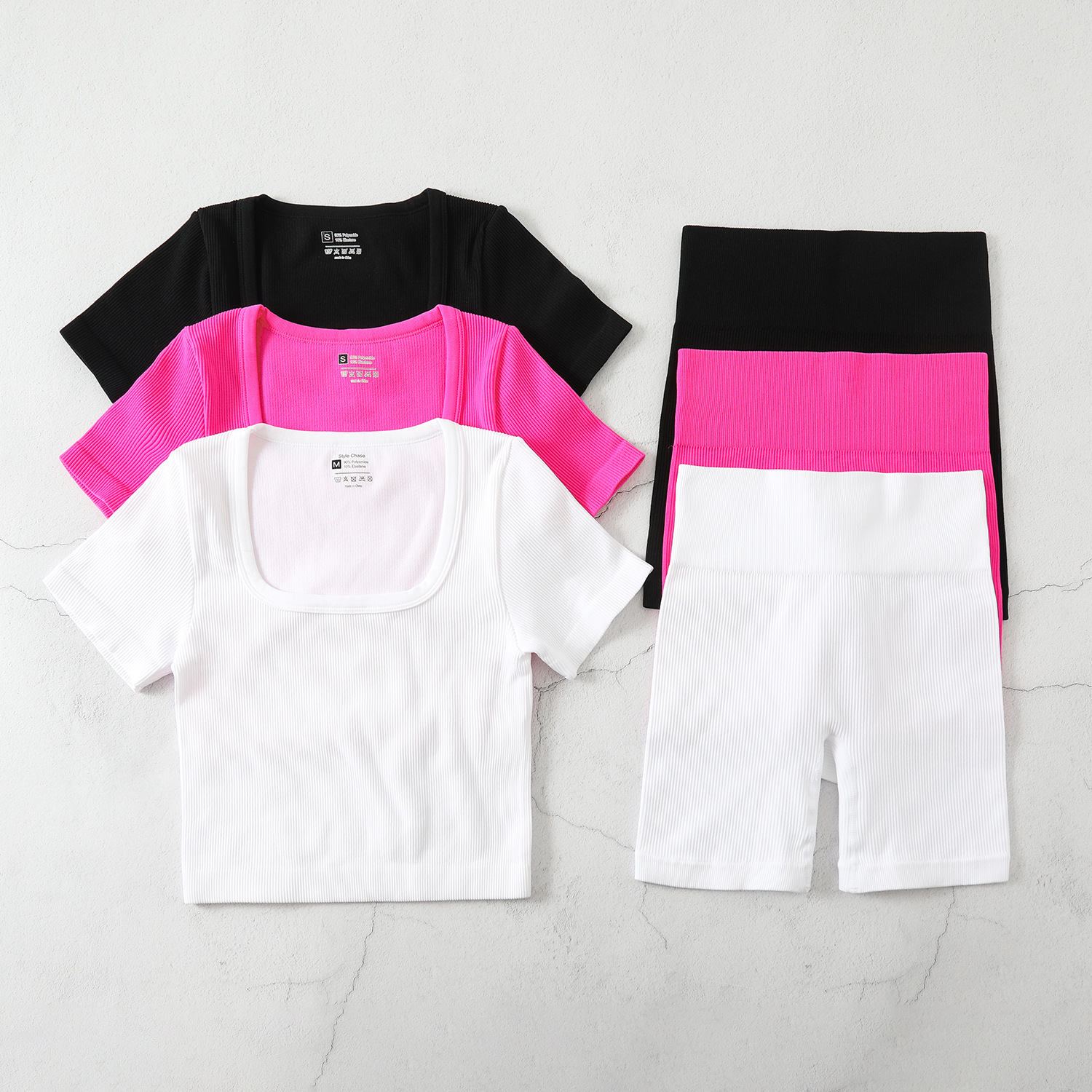 유럽과 미국의 국경 빅 스퀘어 칼라 3 점 바지 요가 반바지 세트 스포츠 피트니스 탑 복숭아 바지 투피스 세트스토어 가기