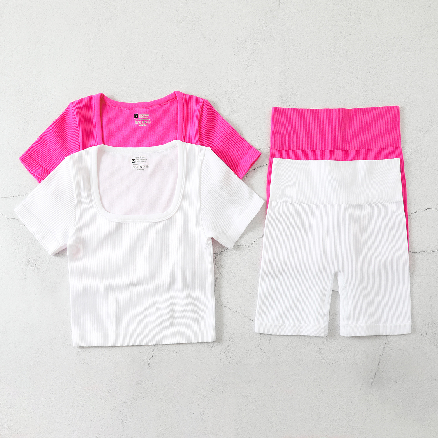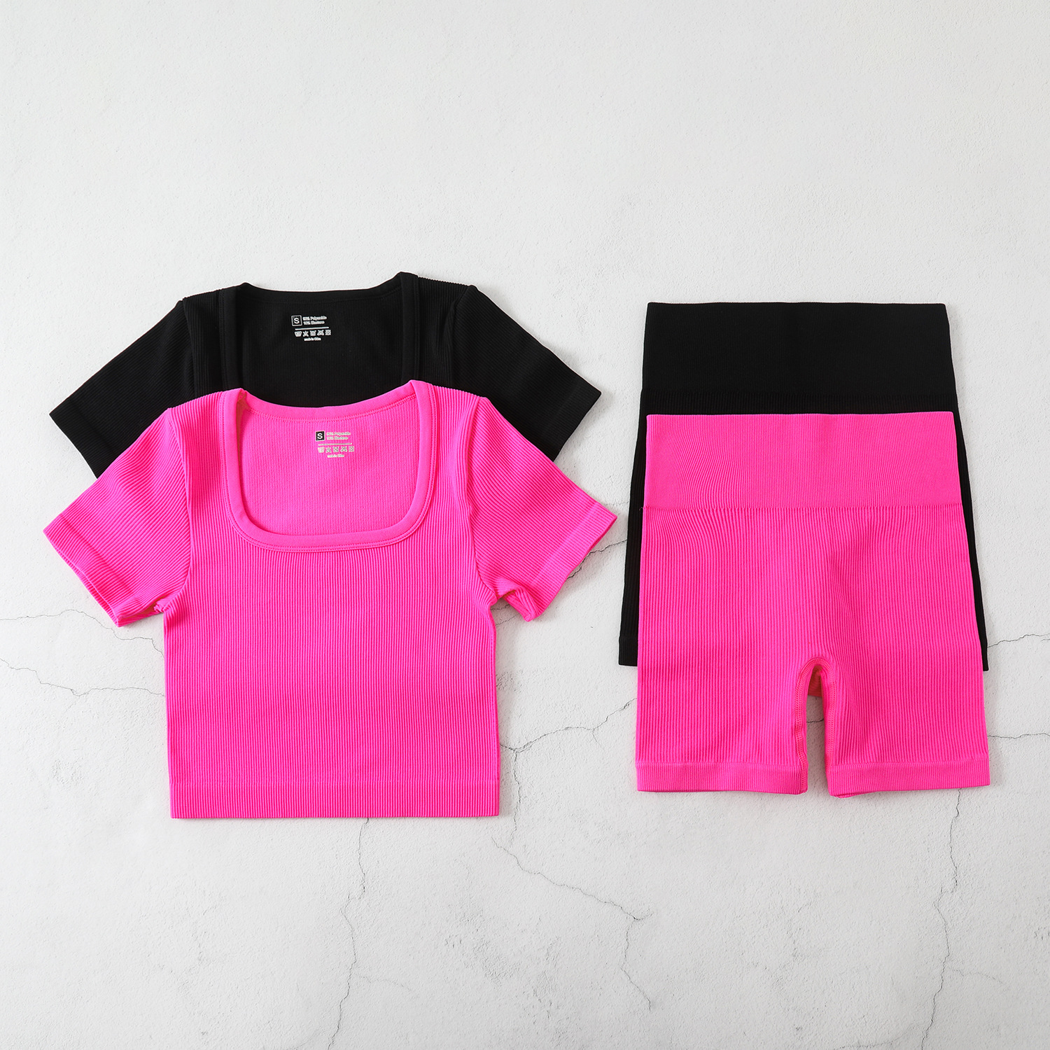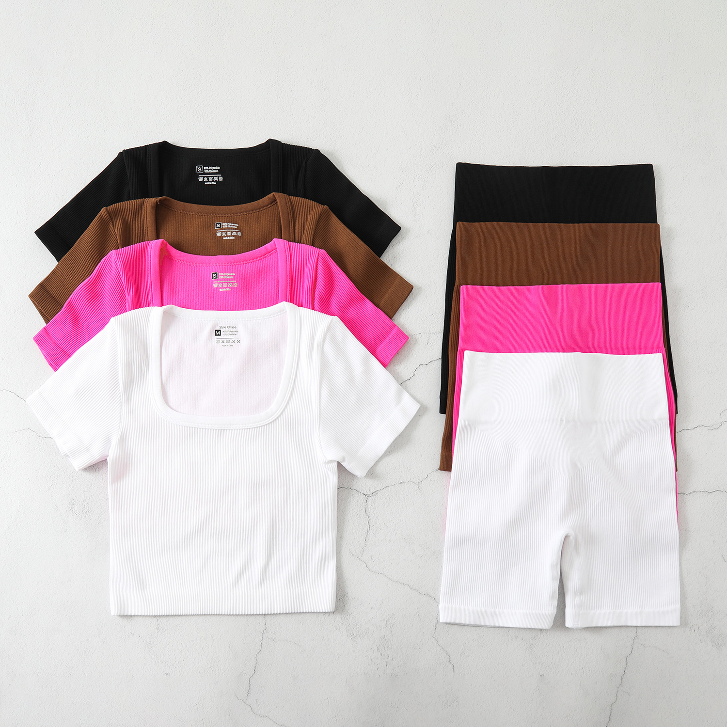 유럽과 미국의 국경 빅 스퀘어 칼라 3 점 바지 요가 반바지 세트 스포츠 피트니스 탑 복숭아 바지 투피스 세트스토어 가기