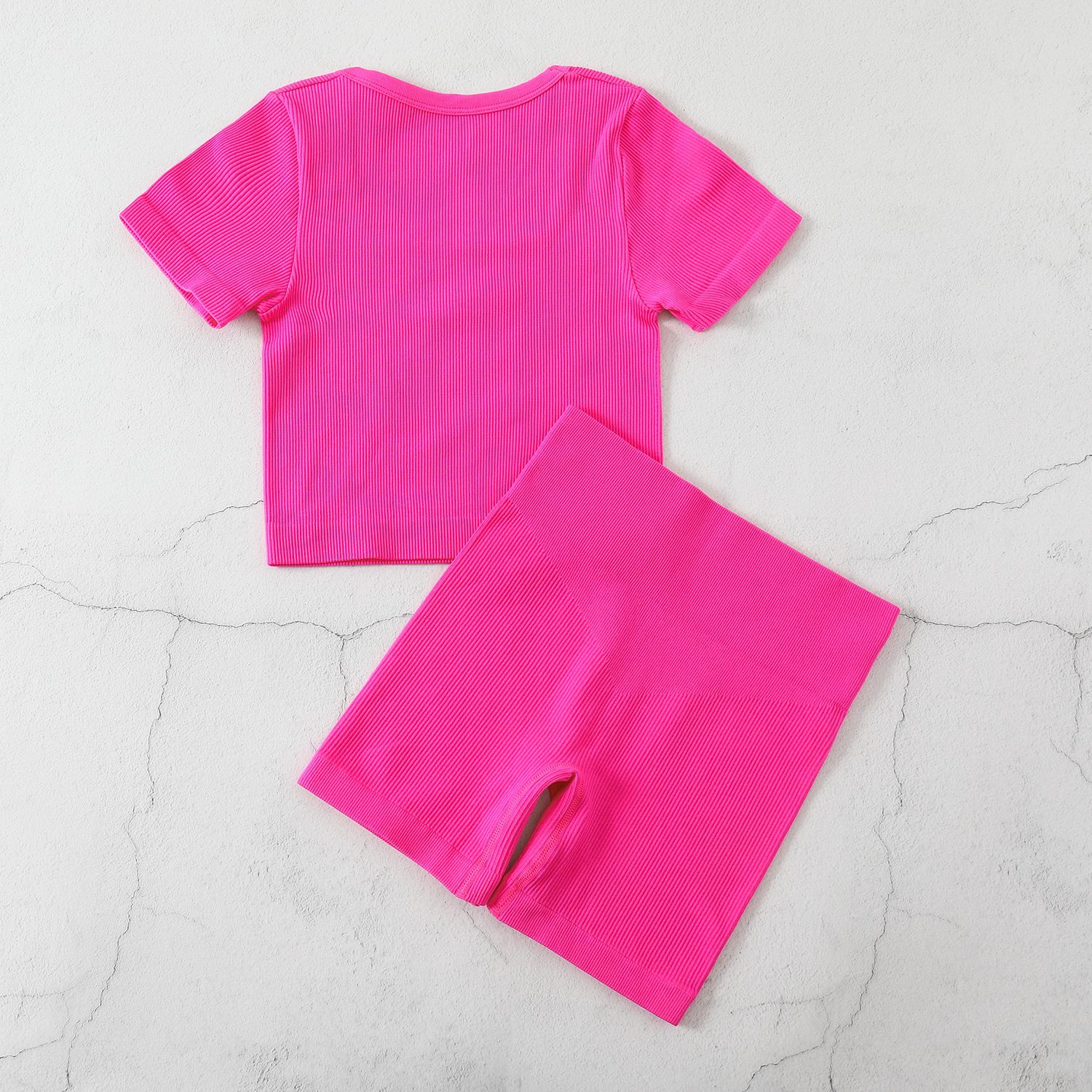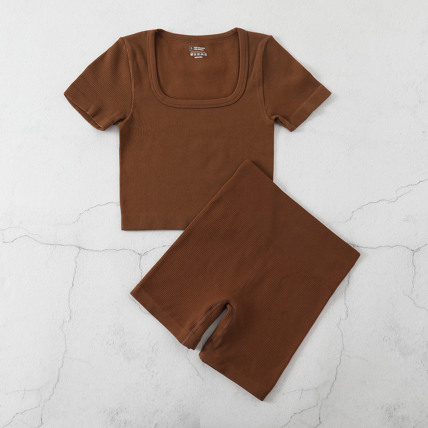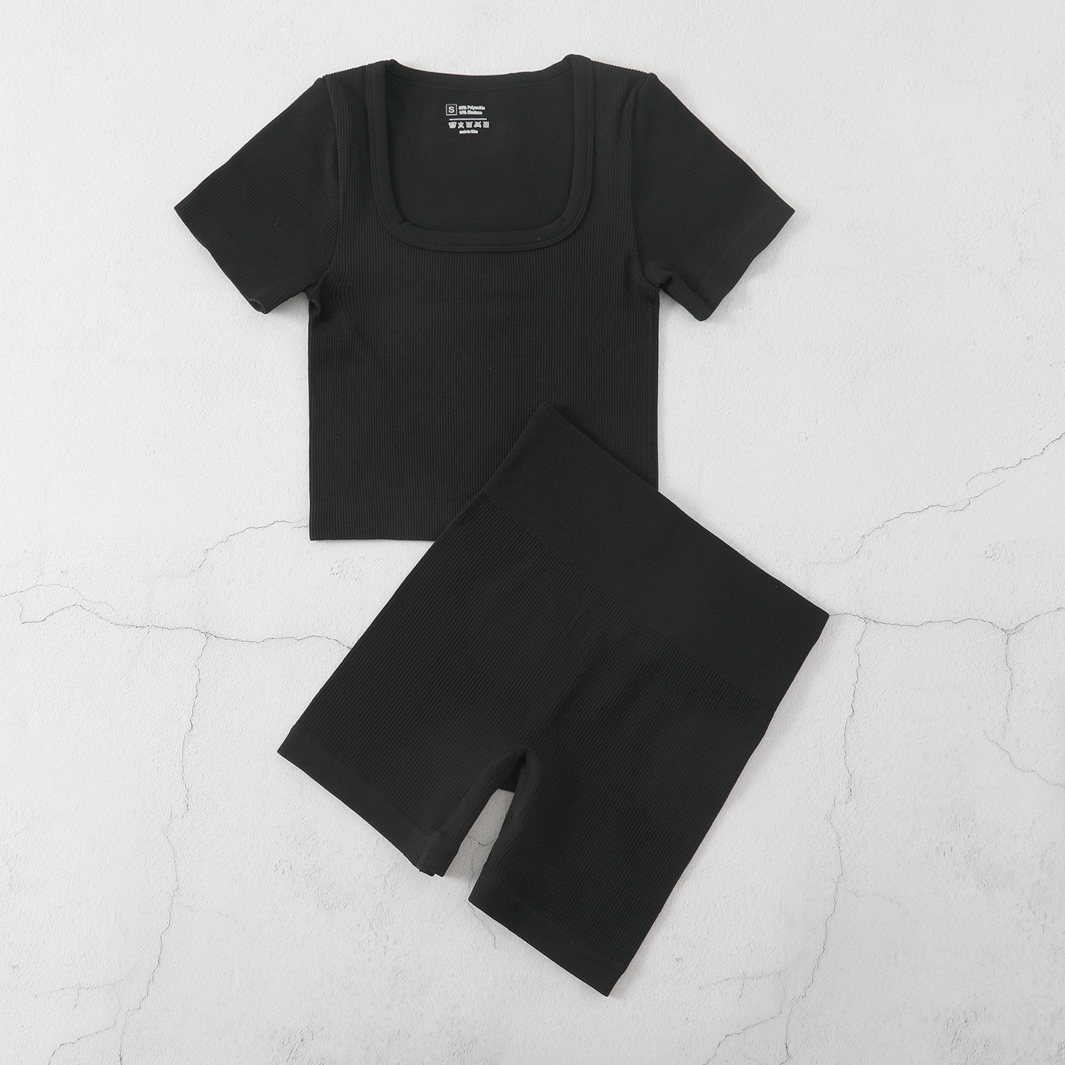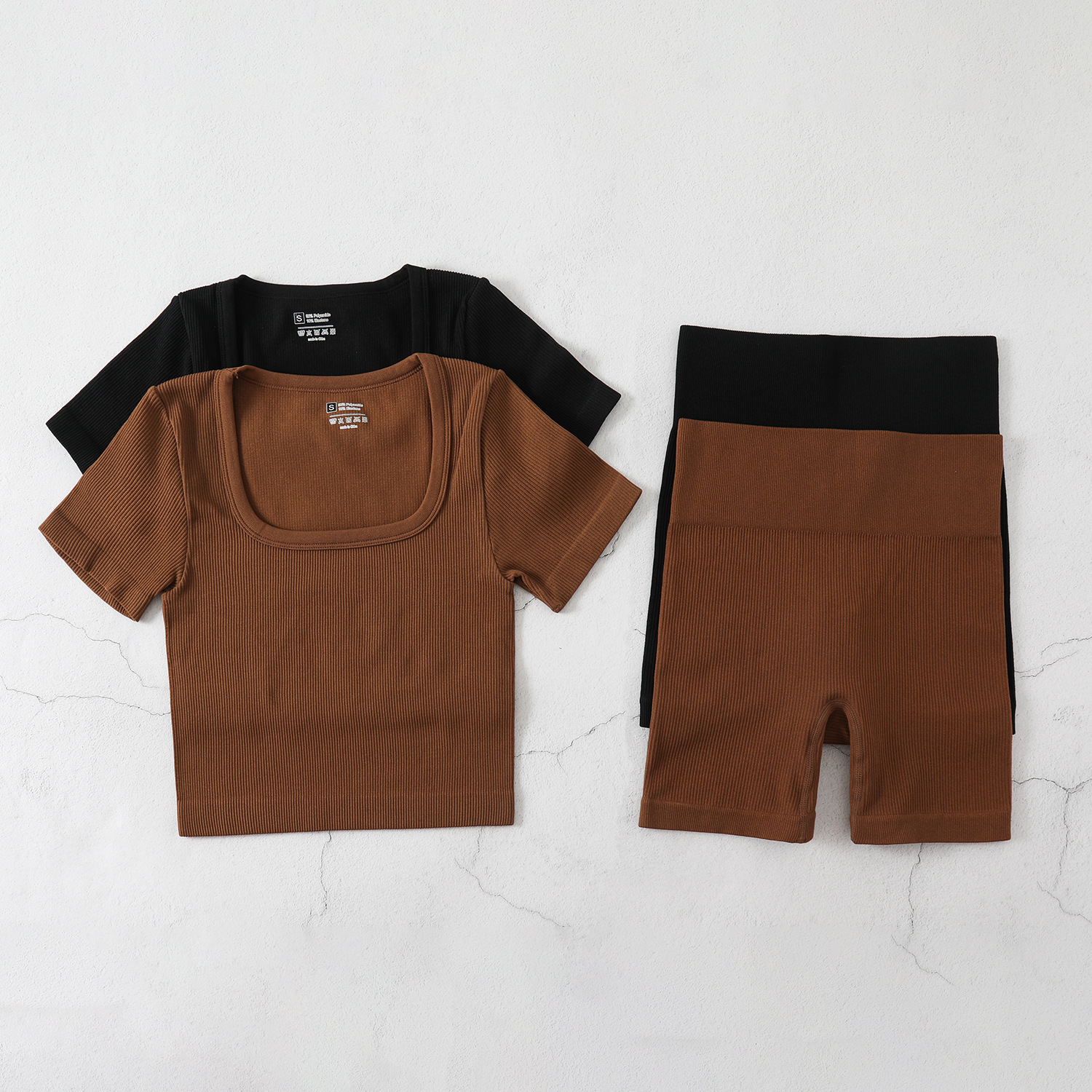 유럽과 미국의 국경 빅 스퀘어 칼라 3 점 바지 요가 반바지 세트 스포츠 피트니스 탑 복숭아 바지 투피스 세트스토어 가기
