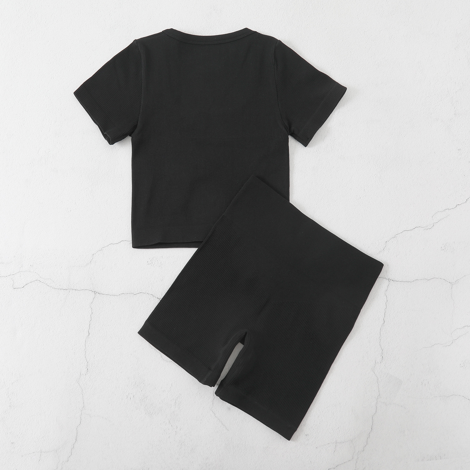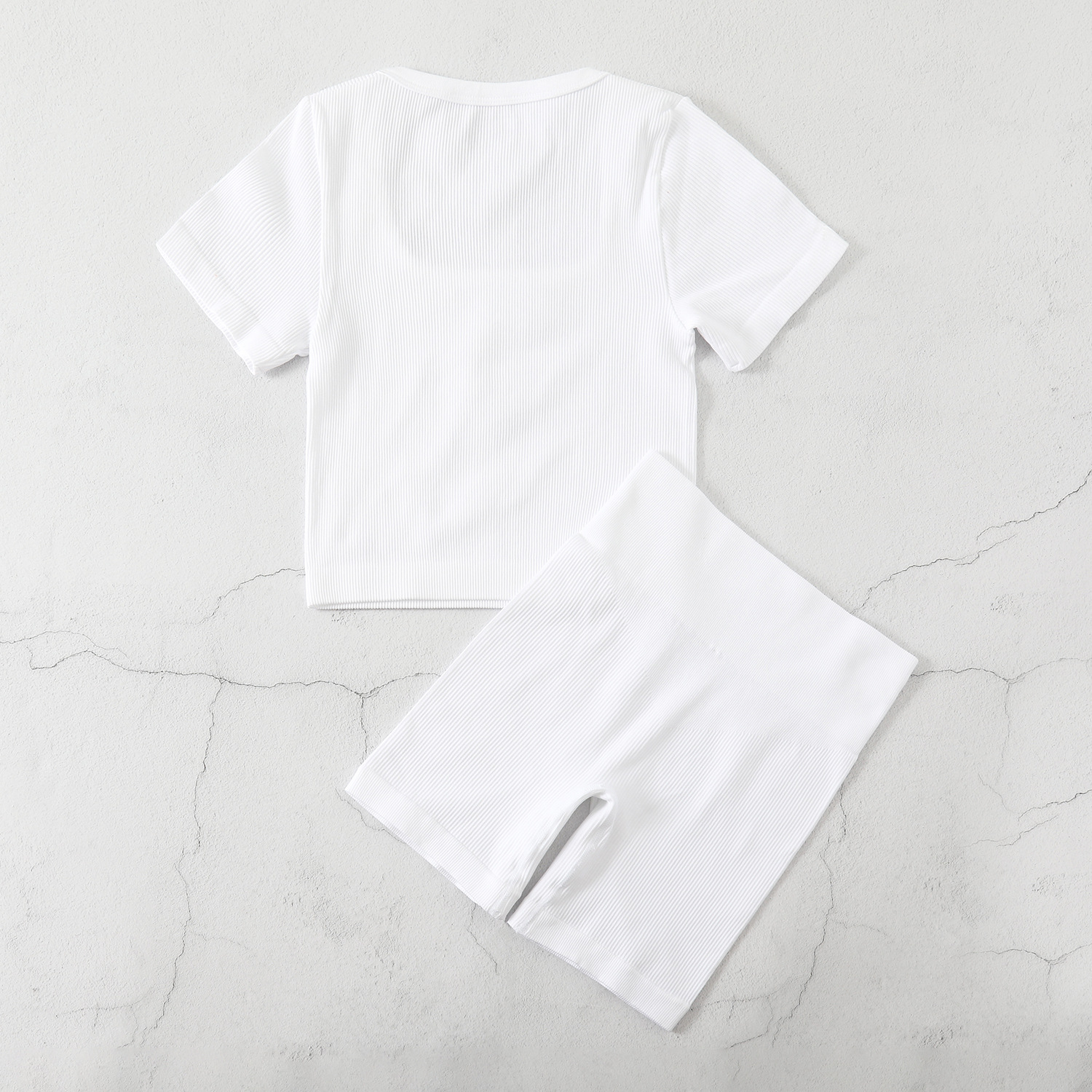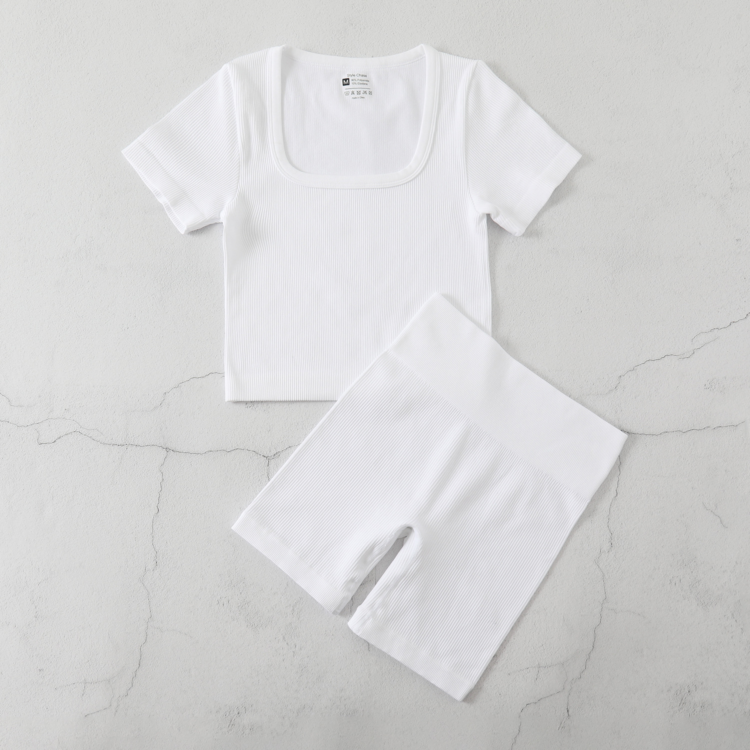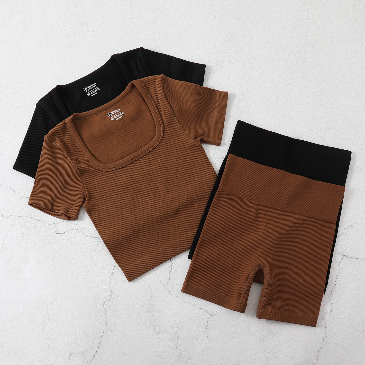 유럽과 미국의 국경 빅 스퀘어 칼라 3 점 바지 요가 반바지 세트 스포츠 피트니스 탑 복숭아 바지 투피스 세트